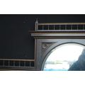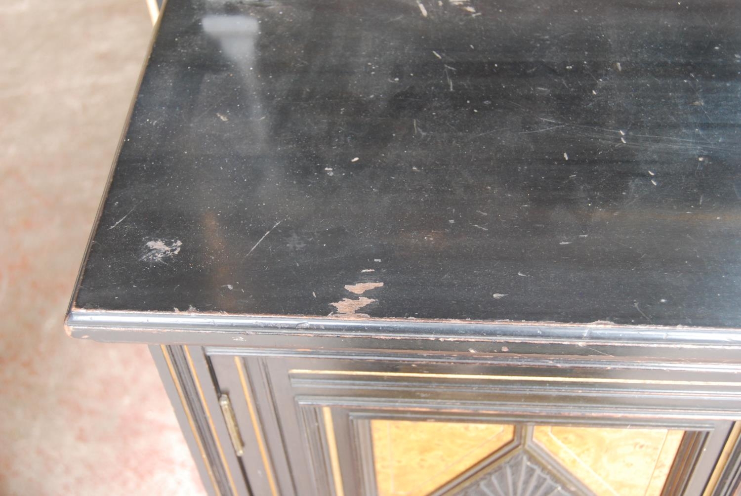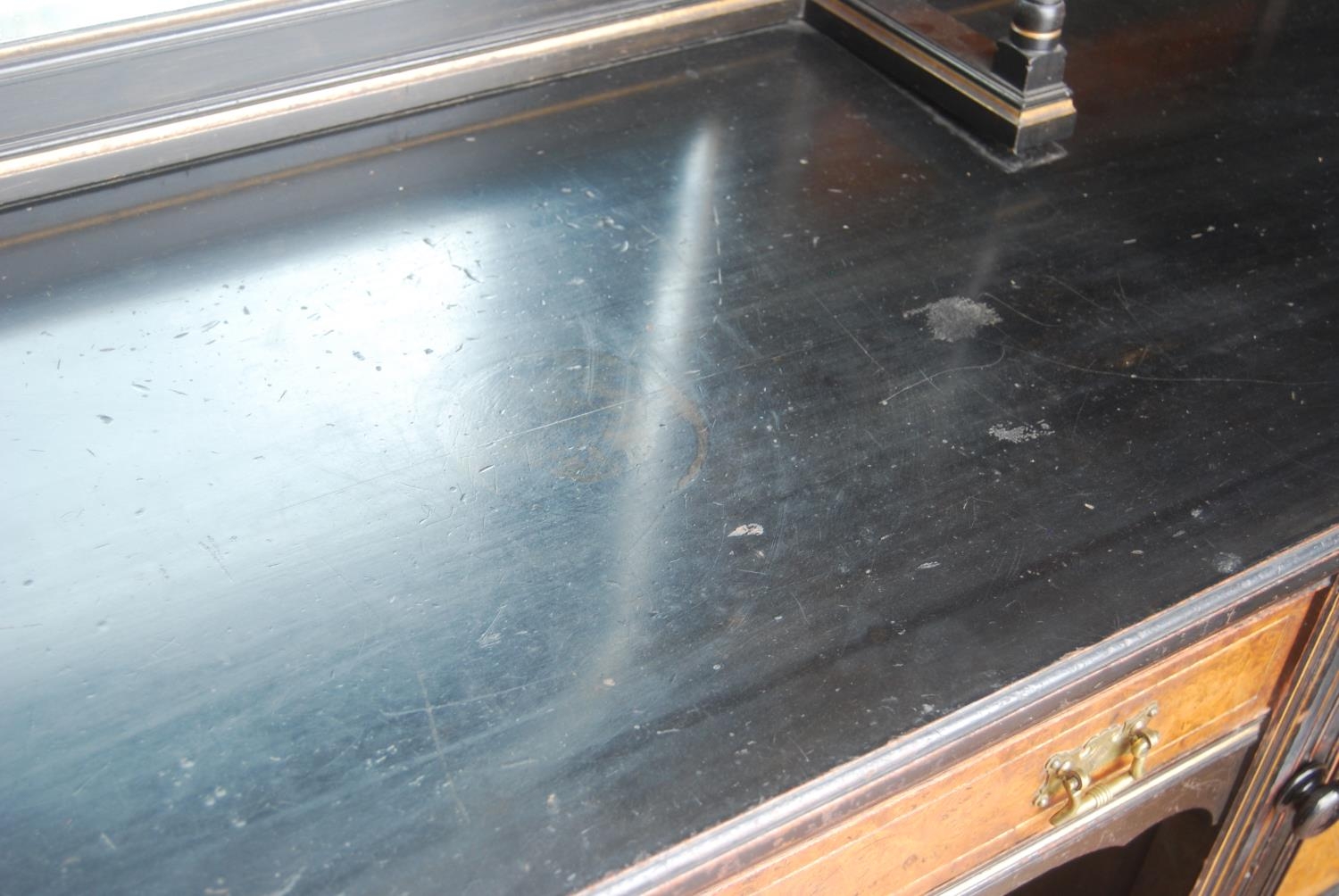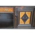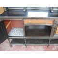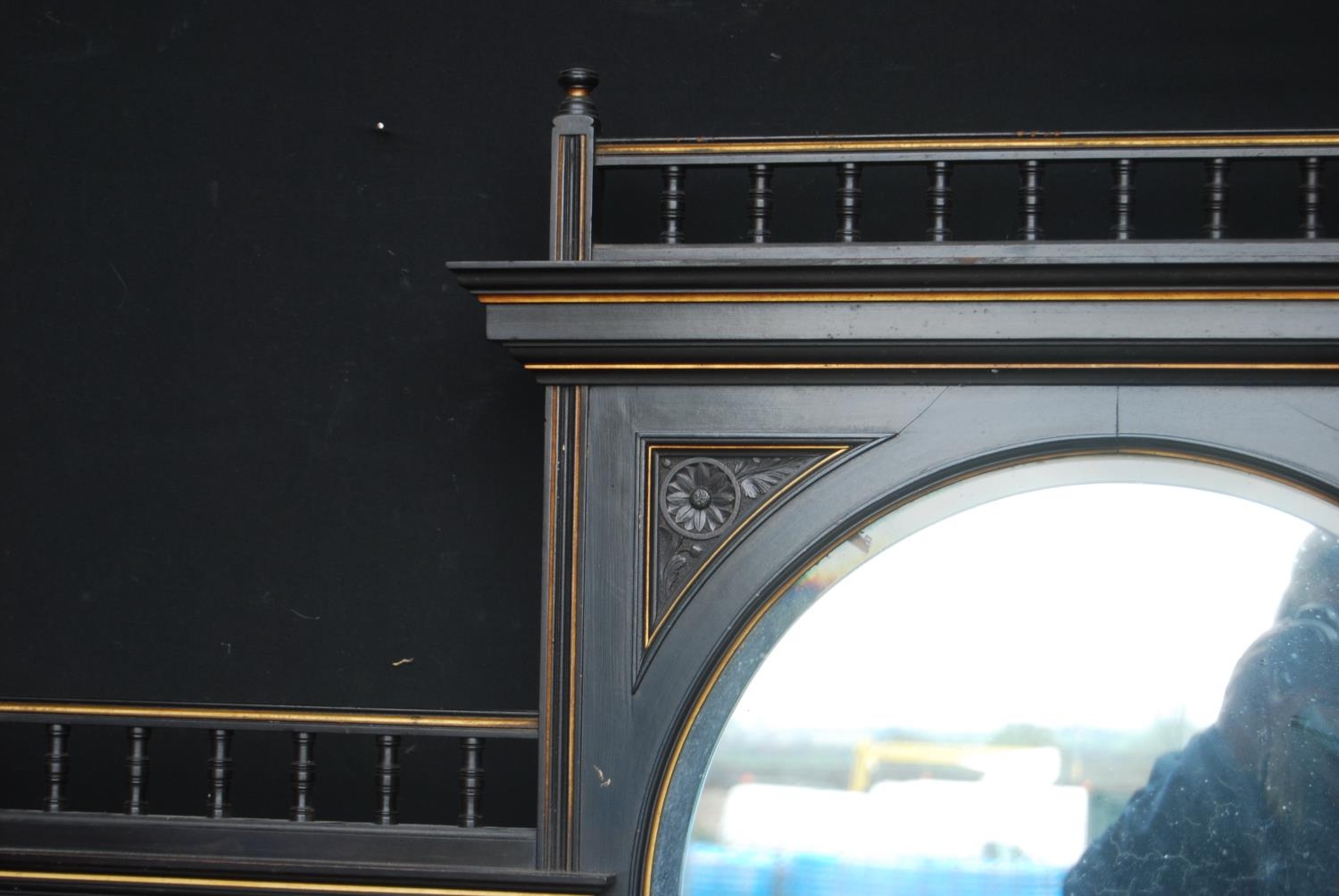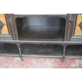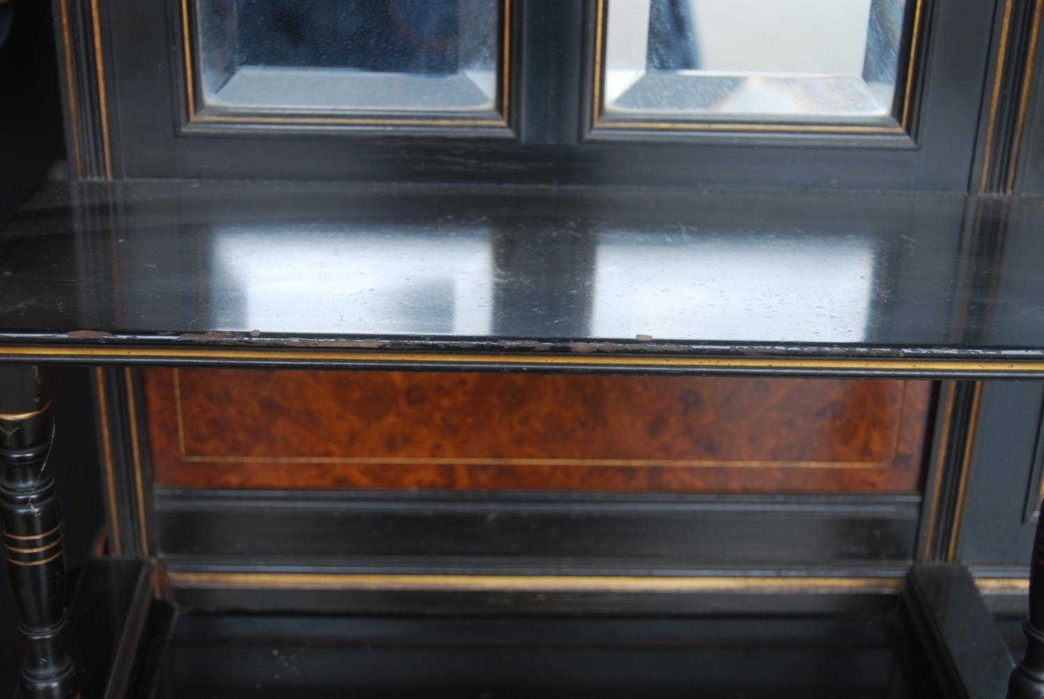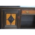 Late 19th century Aesthetic Movement ebonised and walnut drawing room cabinet, the top section with a central arched mirror flanked by two small mirrored panels above an open shelf, decorated with turned balustrade columns, the lower section with a central drawer above an open recess flanked by cupboard doors above an undertier, 196cm high, 153cm wide and 46cm deep.
