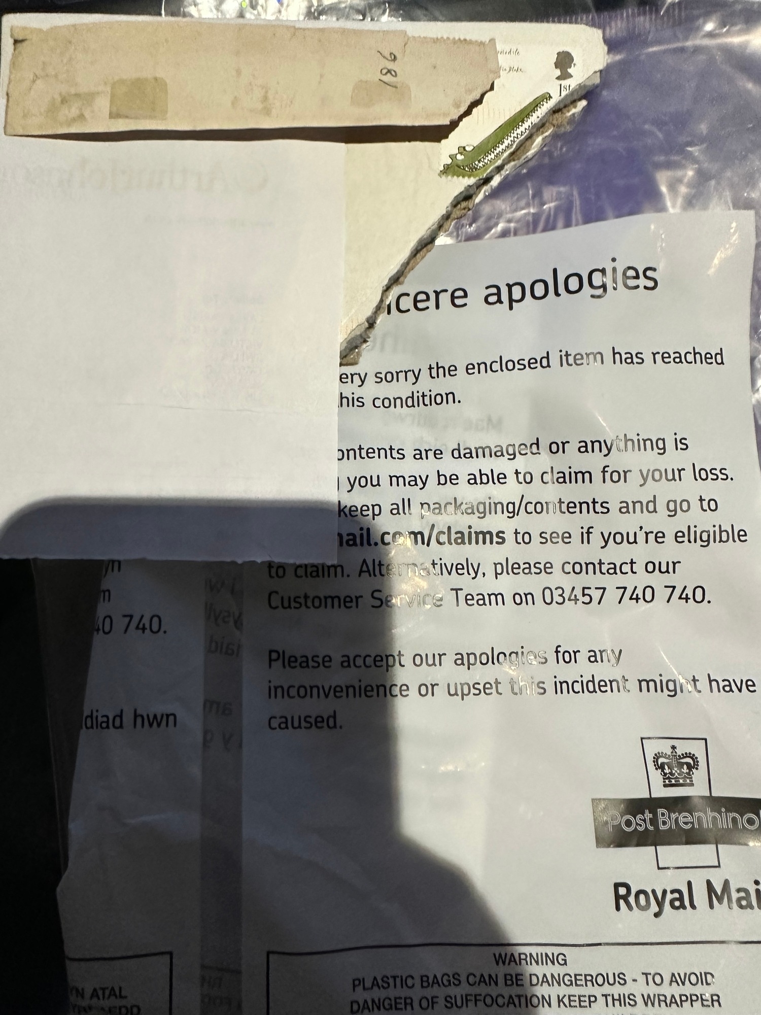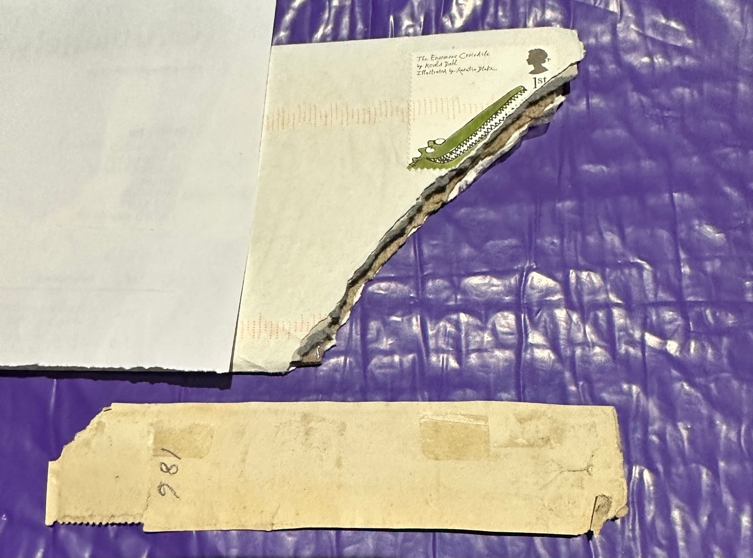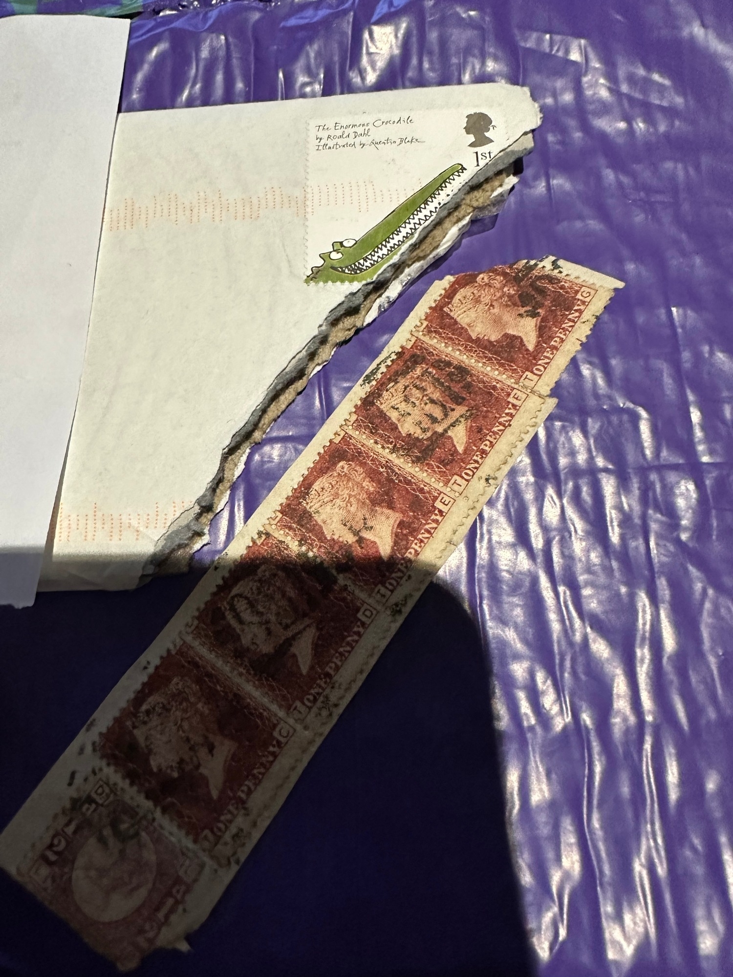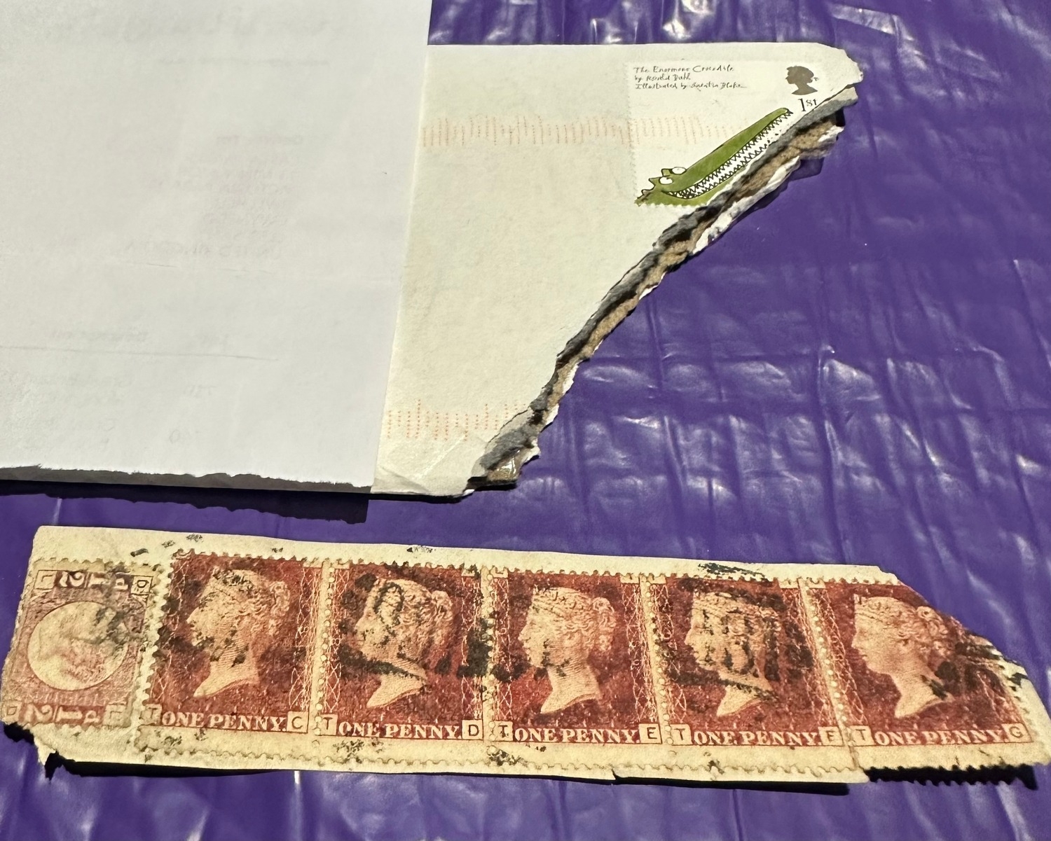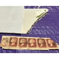 UK GB QV used strip of 5 penny reds (plum ?) plate 186 and bantam stamp, some kind of Royal Mail equipment damage or joke ? Interesting