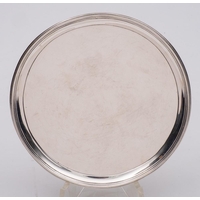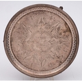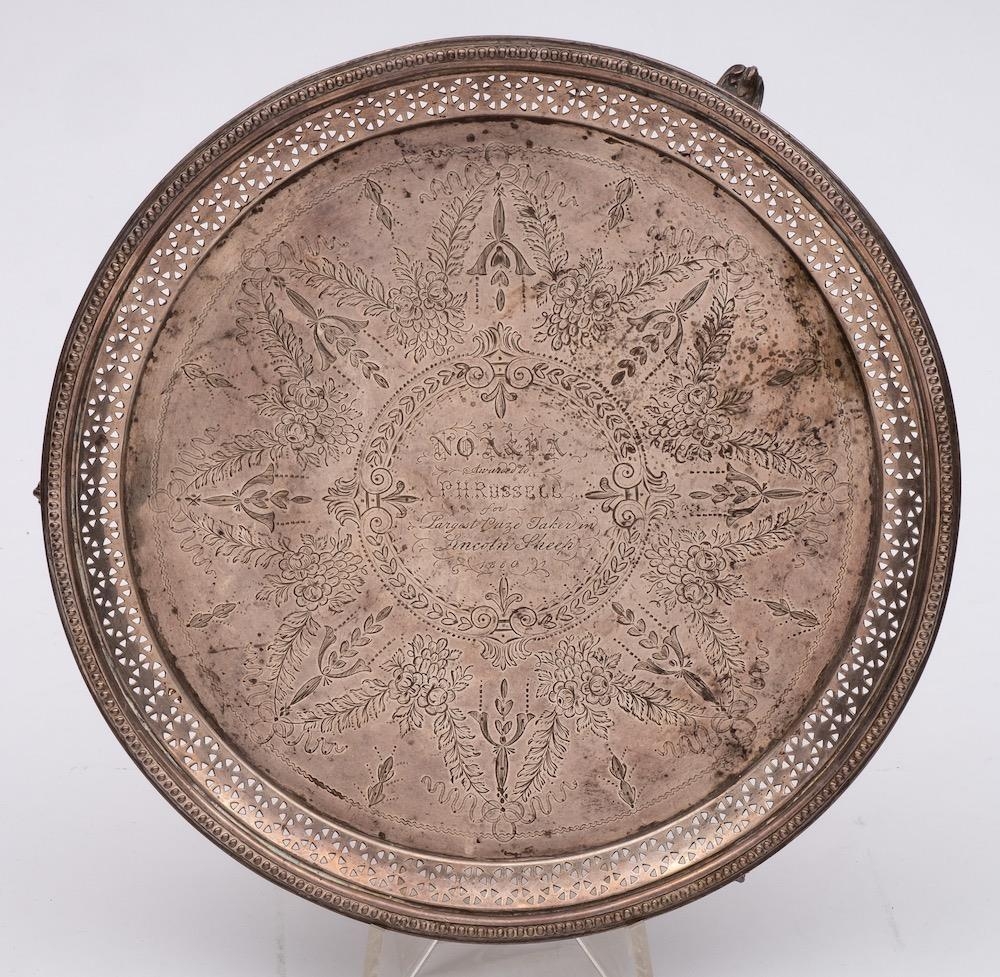 A Victorian silver salver, maker Walker & Hall, Sheffield, 1879: inscribed, of circular outline with beaded rim and pierced border, raised on three swept feet, 30.5cm diameter, 849gms, 27.29ozs.