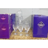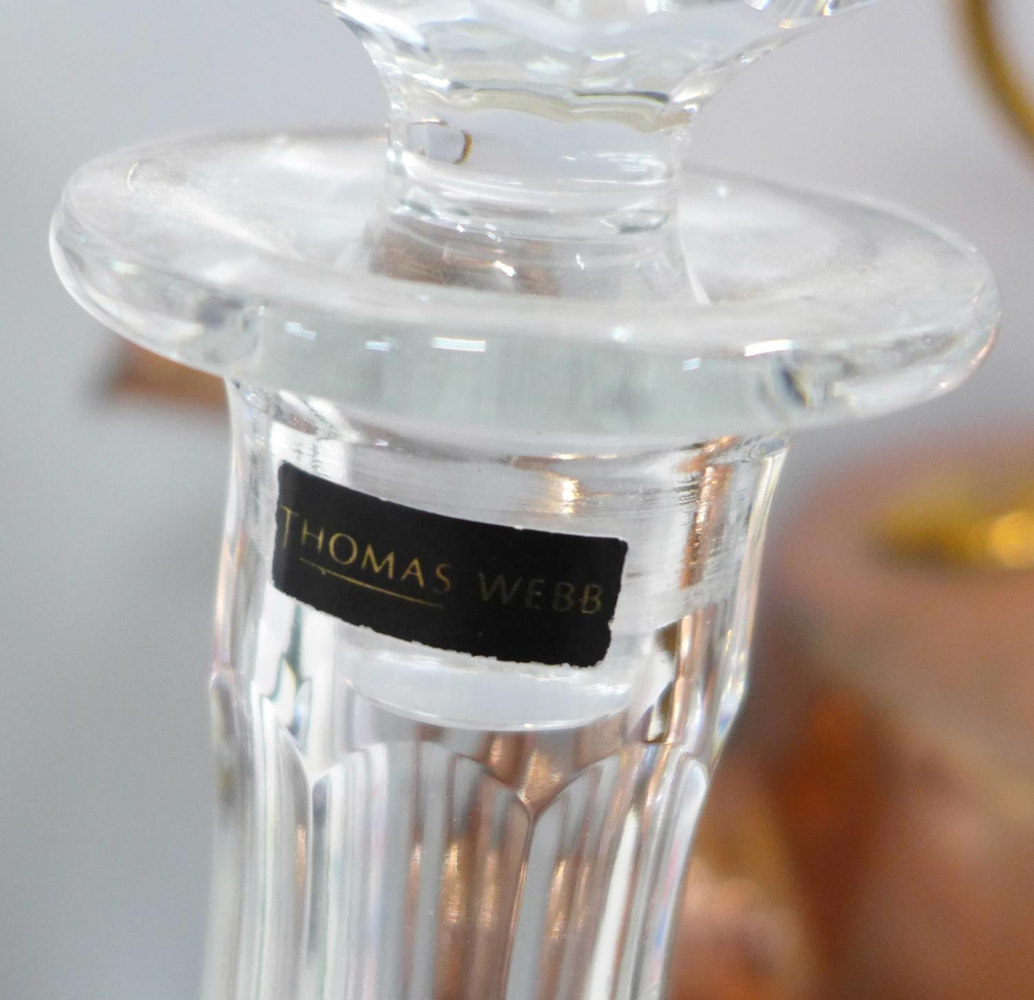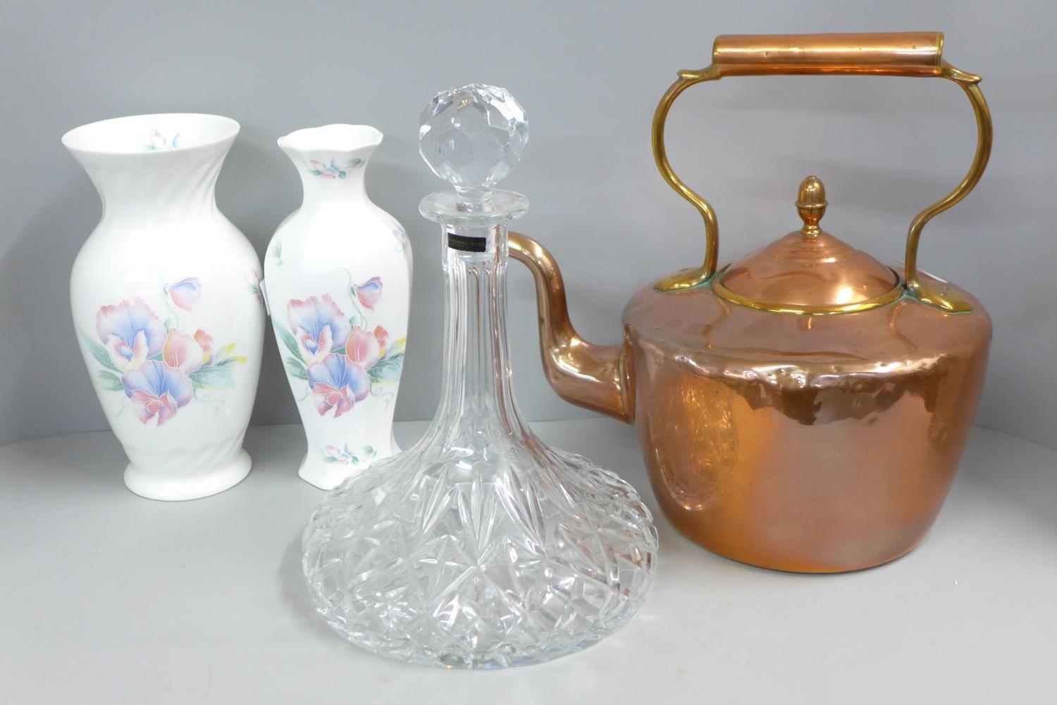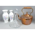 A copper kettle, two Aynsley vases and a Thomas Webb glass ship's decanter
