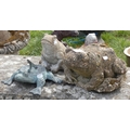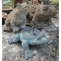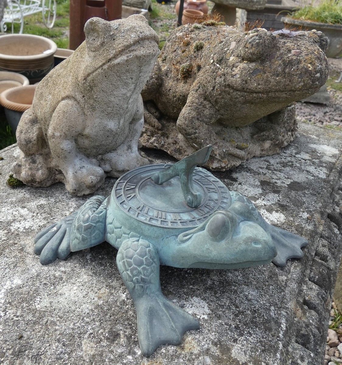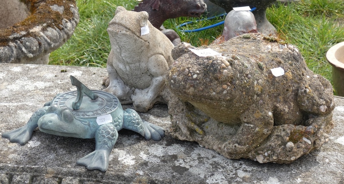 2 Stone frogs together with metal frog sundial