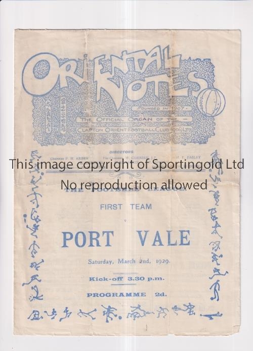 CLAPTON ORIENT V PORT VALE 1929 Gatefold programme for the League match at Clapton 2/3/29, folded and slightly worn. Fair