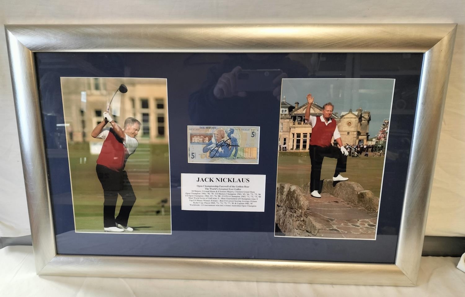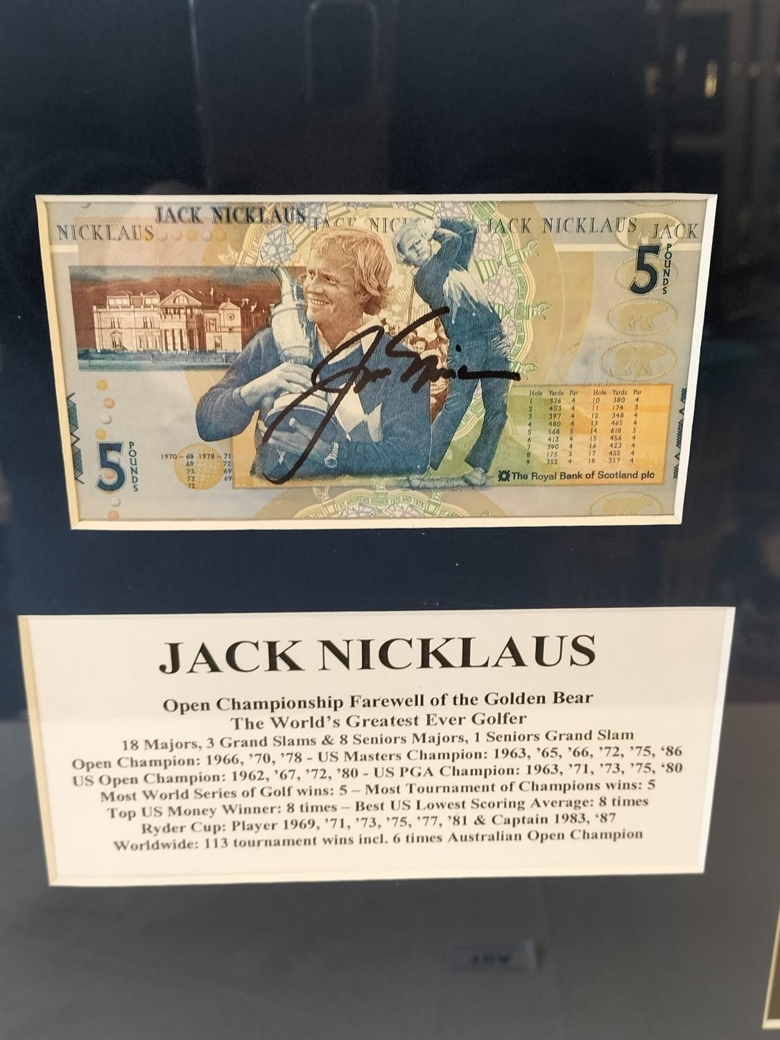 Framed and Glazed Jack Nicklaus Golfing Photos plus Signed £5 Note with Certificate of Authenticity. 78cm x 49cm. Please get in touch before bidding if shipping required.