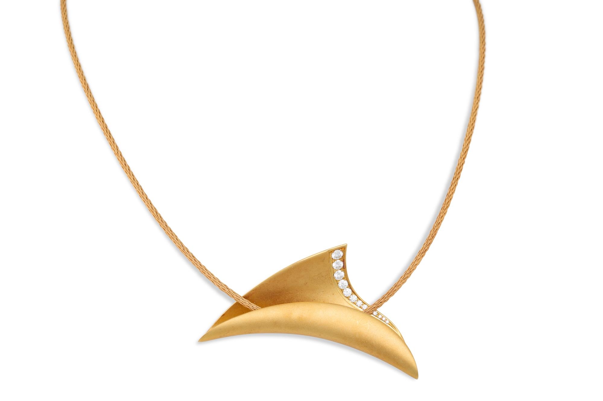 A CONTEMPORARY 18CT BRUSHED GOLD PENDANT, shaped form, diamond set, to rope link collar, 32 g. Estimated: weight of diamonds: 0.50 ct. (ensuite with previous lot)