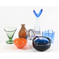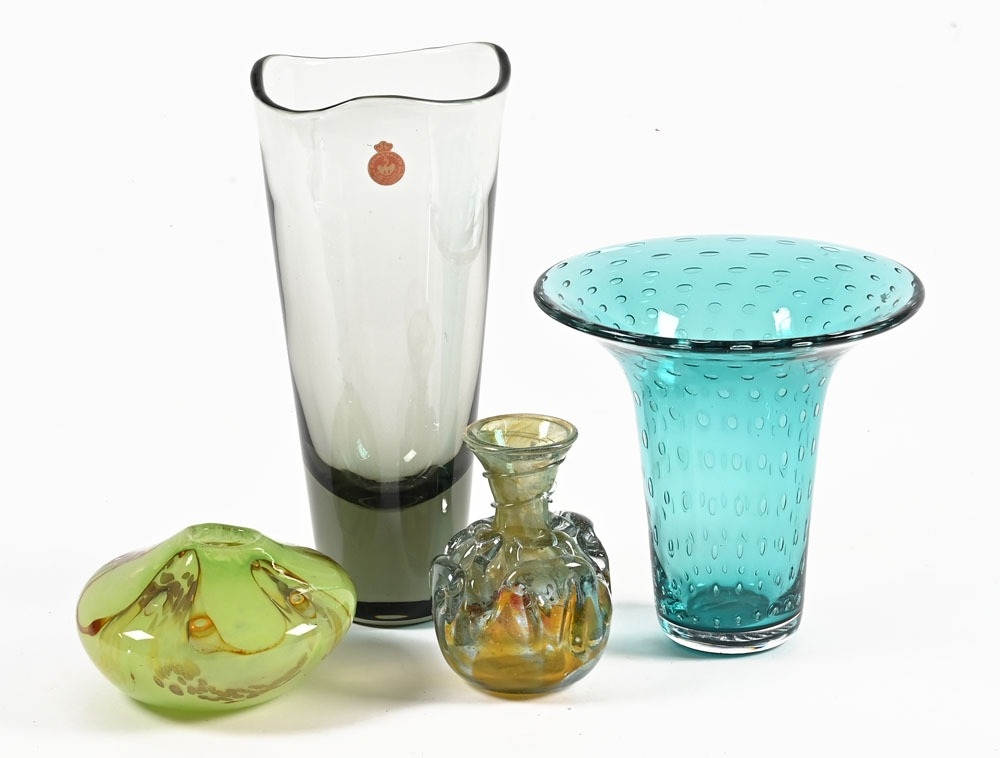 A Danish Holme Garde vase 25.5 cm high, a Pauline Solvein green glass vase 13 cm diameter, Peter Layton small squat vase height 11 cm, green glass vase with bubble effect pattern height 16 cm.