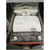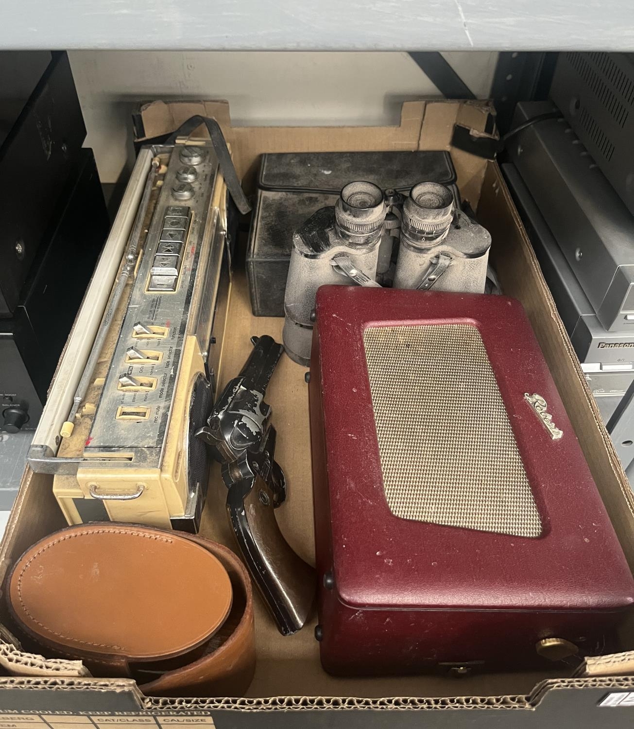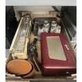 Box containing Hindes 'Equestrian' brushes, vintage Roberts and Sharp radios etc