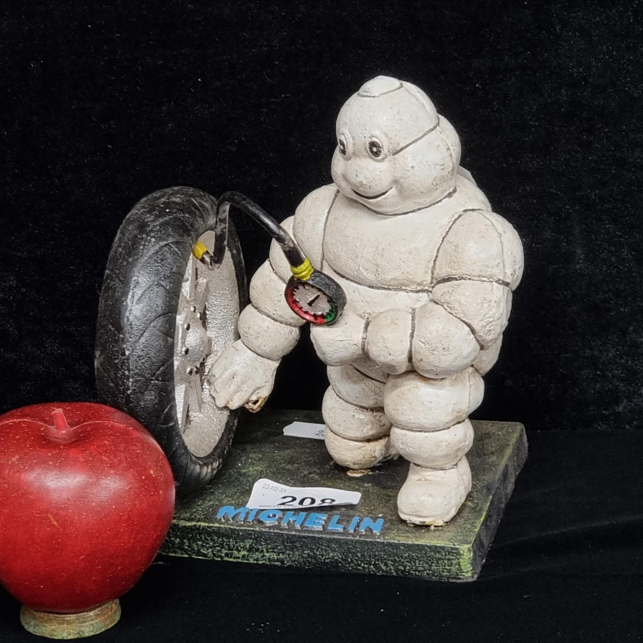 A remarkably heavy cast metal figure of the iconic Michelin Man pumping up a tyre.