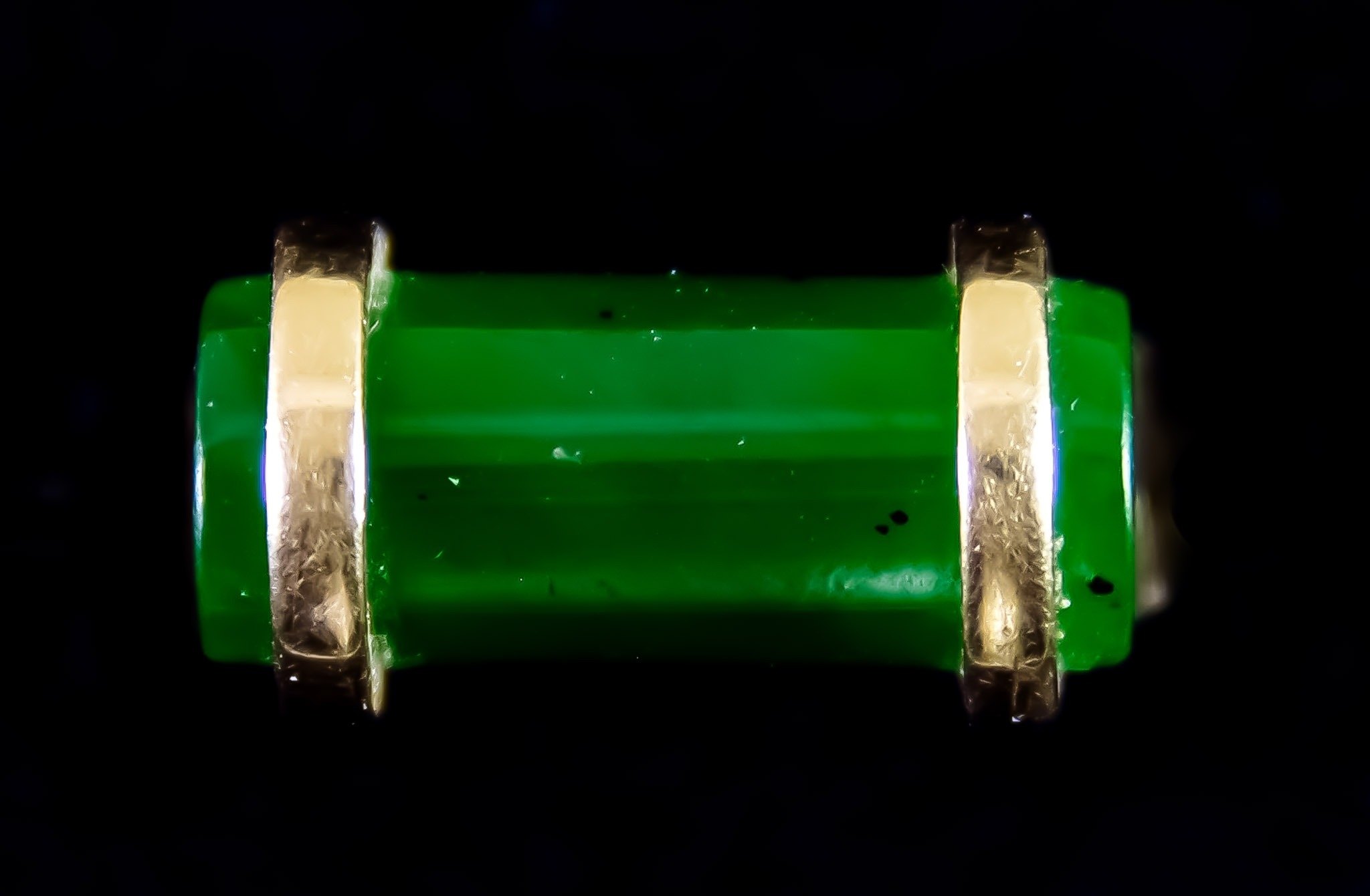 An 18ct Gold Jade Set Ring, set with a tubular jade or jadite stone to the top, size N, total gross weight 6.9g