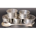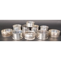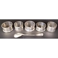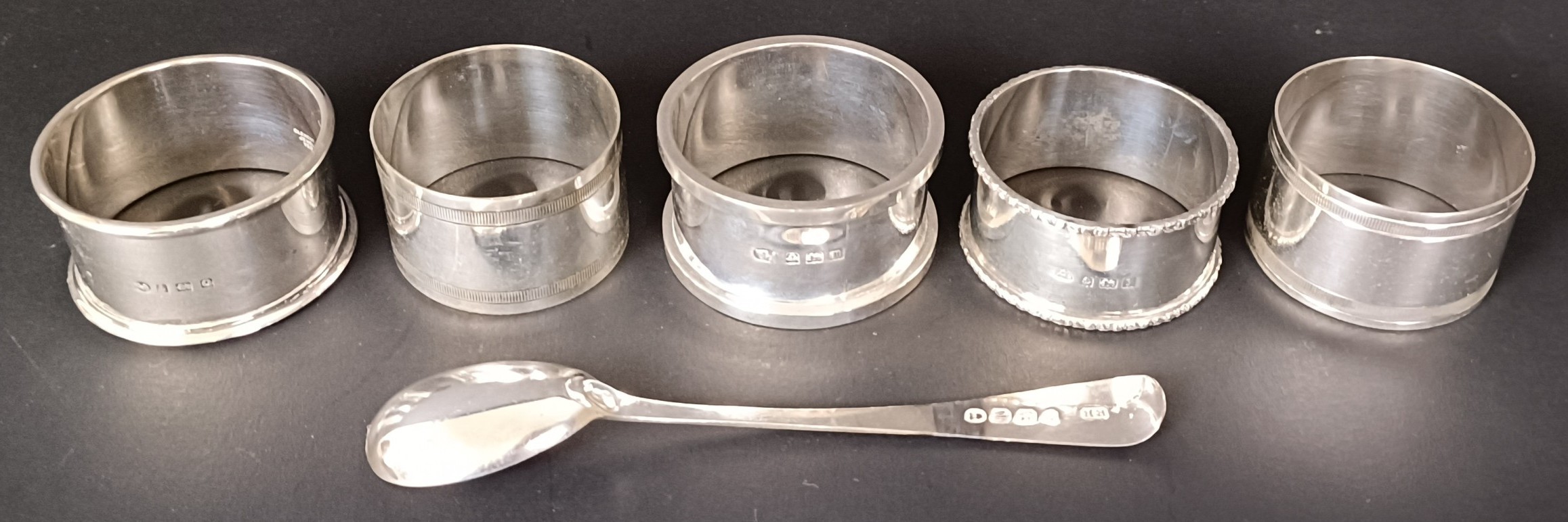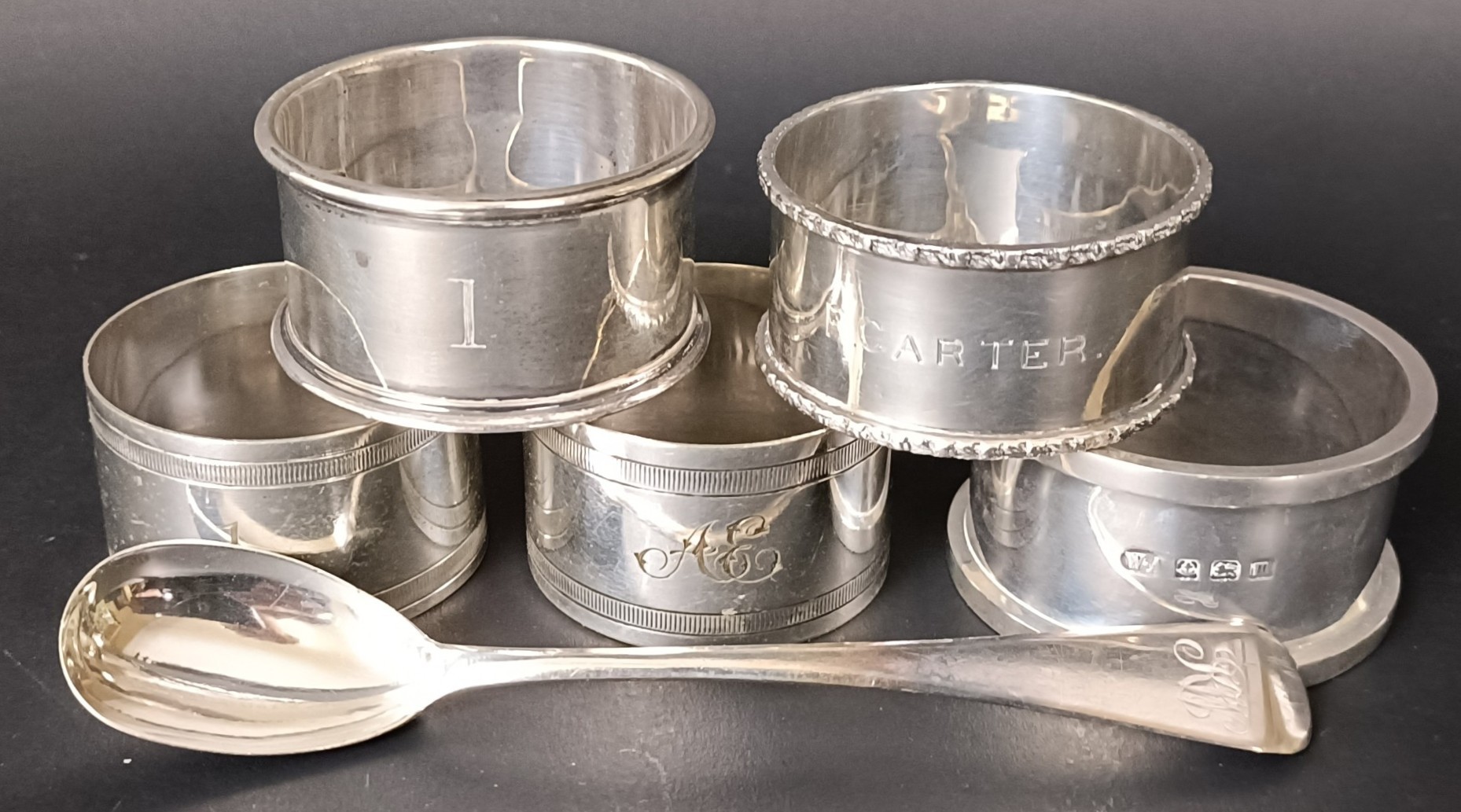 A George II silver spoon, three silver napkin rings, 2.8 ozt, and two silver plated napkin rings
