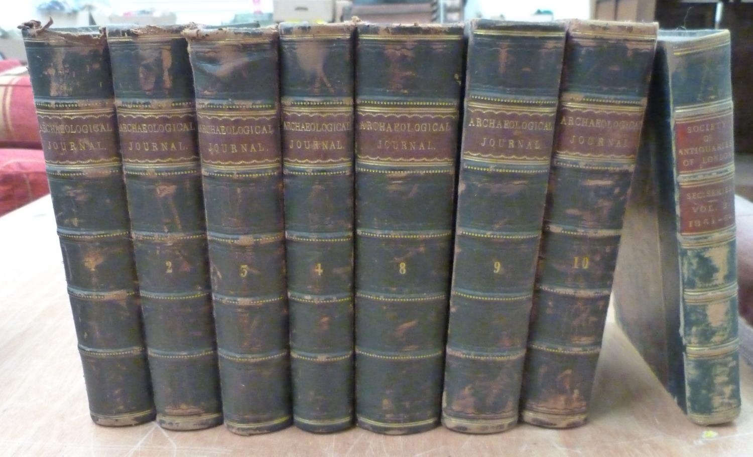 THE BRITISH ARCHAEOLOGICAL ASSOC. The Archaeological Journal. Vols. 1 to 4 & 8 to 10. Many illus. Rubbed half calf, internal browning & spotting, vol. 10 lacks title. C.1845-1853; also 1 other vol. (8).