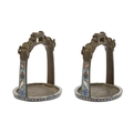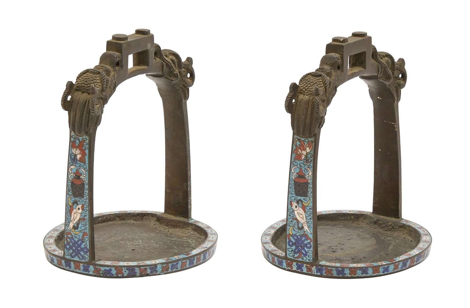 A pair of Chinese champleve enamel bronze stirrups, Qing dynasty, c1900, chiselled with dragons, 16cm h