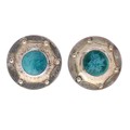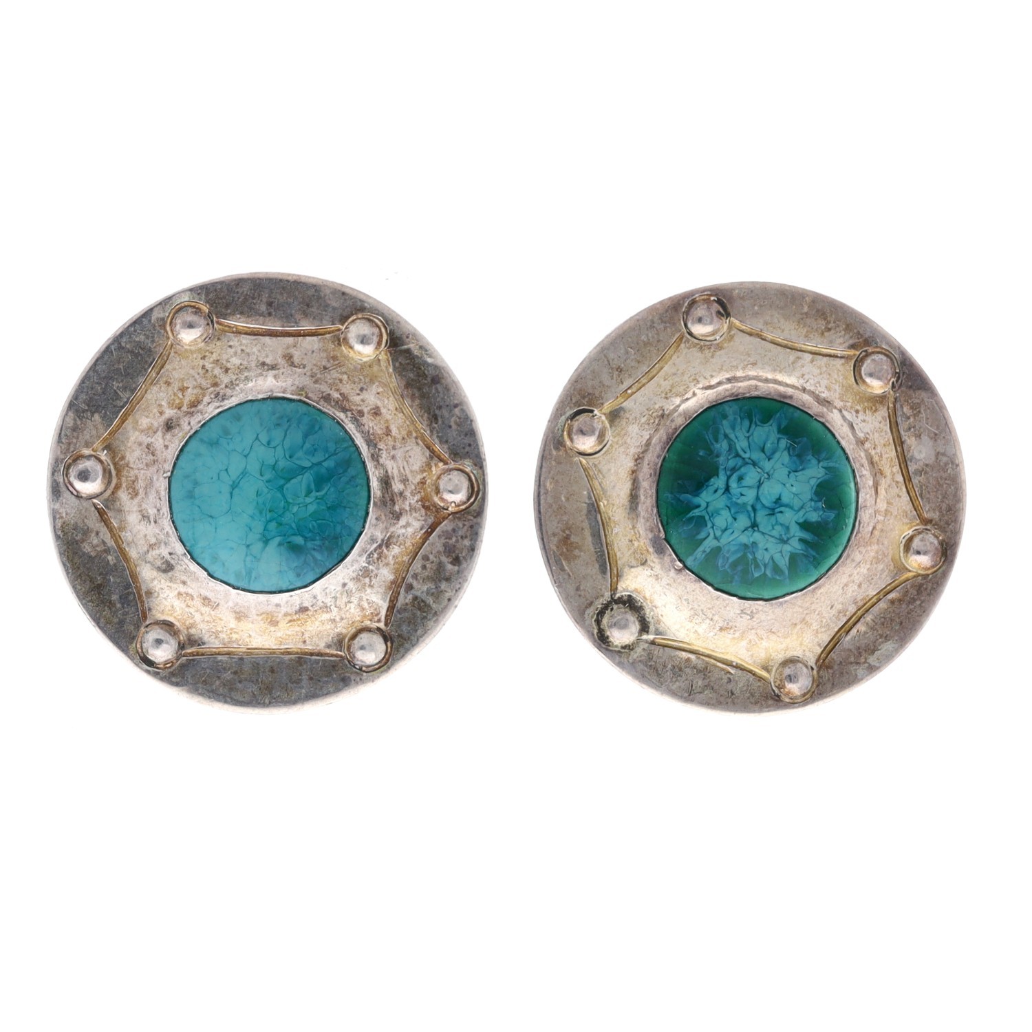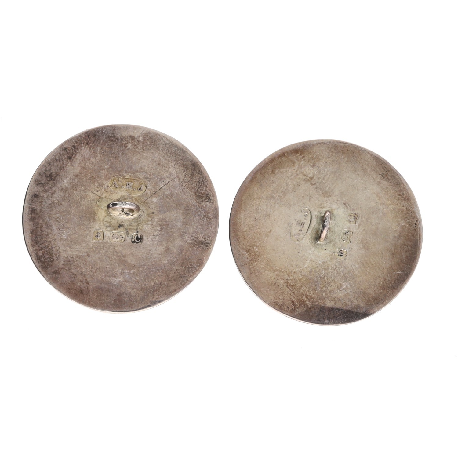 Pair of Arts & Crafts planished silver circular 'Ruskin' enamel buttons by Albert Edward Jones, Birmingham 1902, 30mm diameter