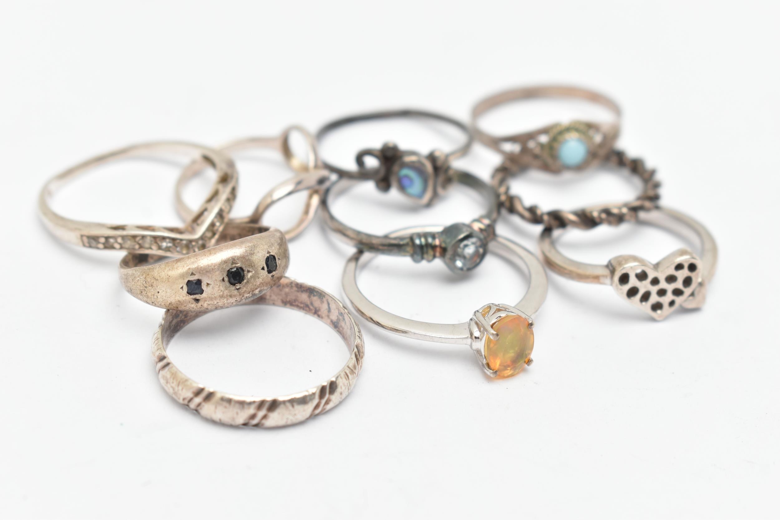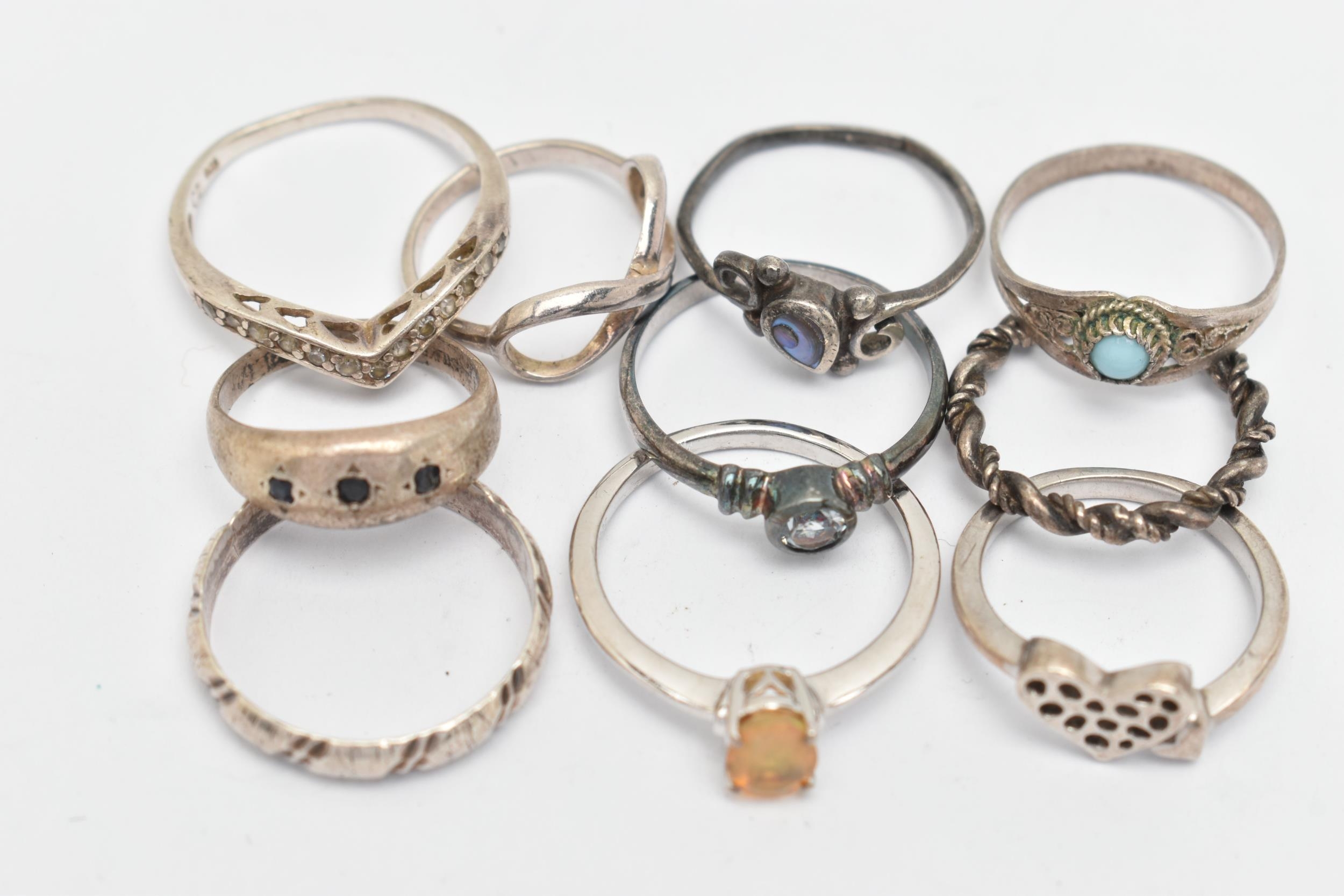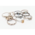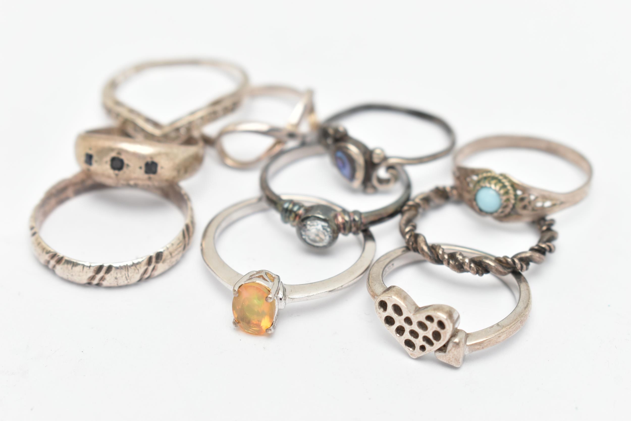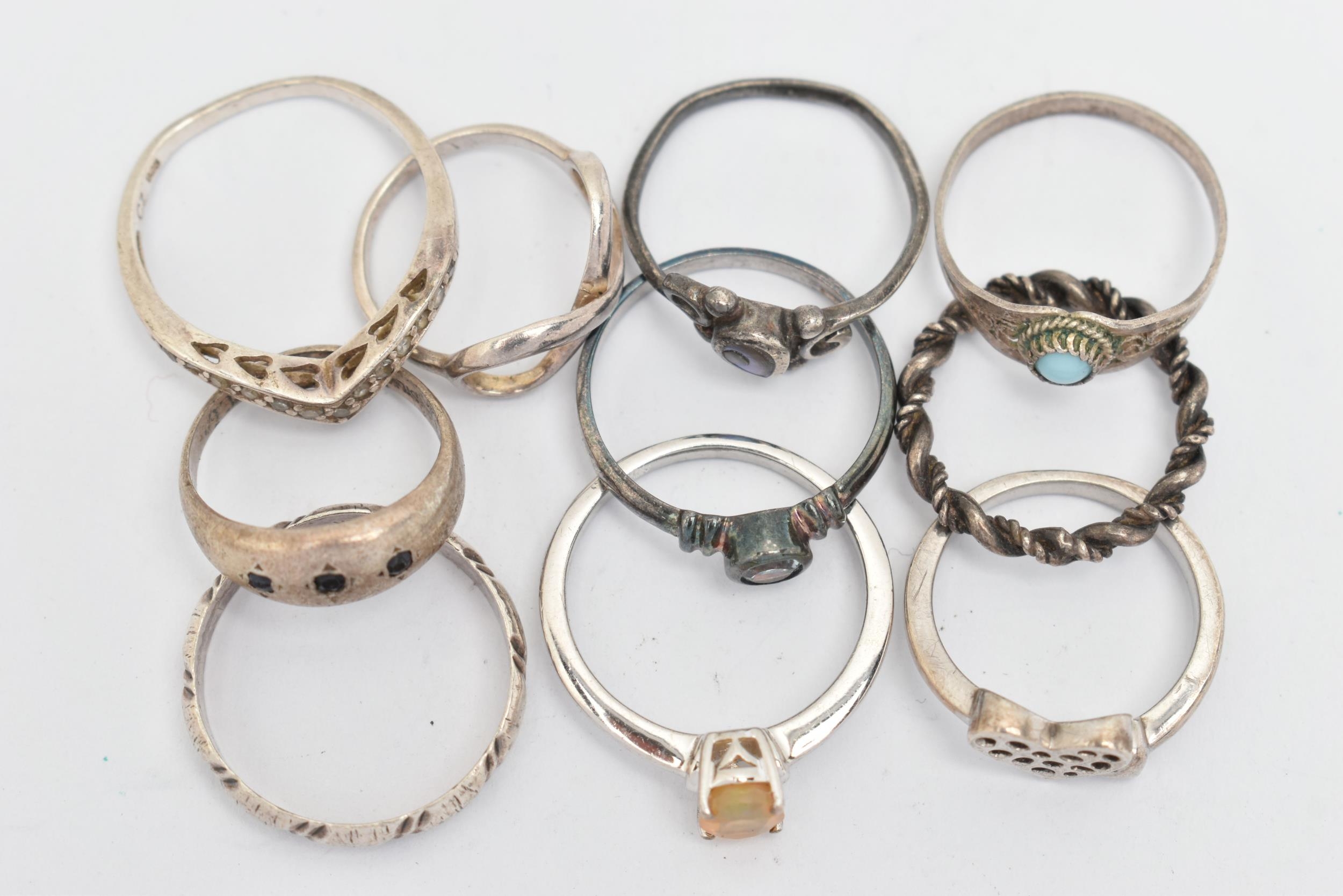 TEN WHITE METAL RINGS, of various designs and sizes, some stamped 925, silver, some unmarked metal, one hallmarked silver open work heart shape ring (condition report: used conditions may require some attention)