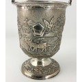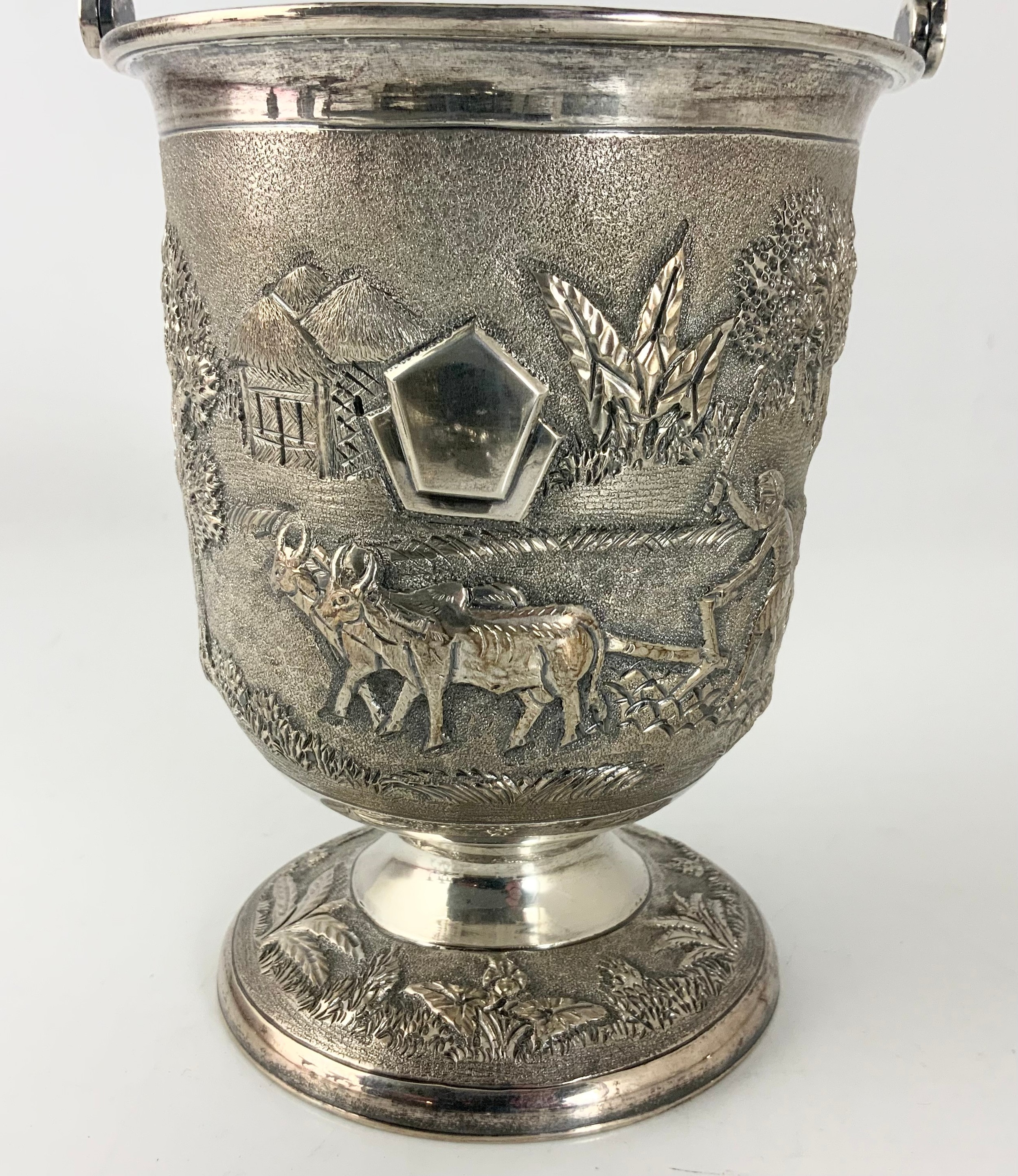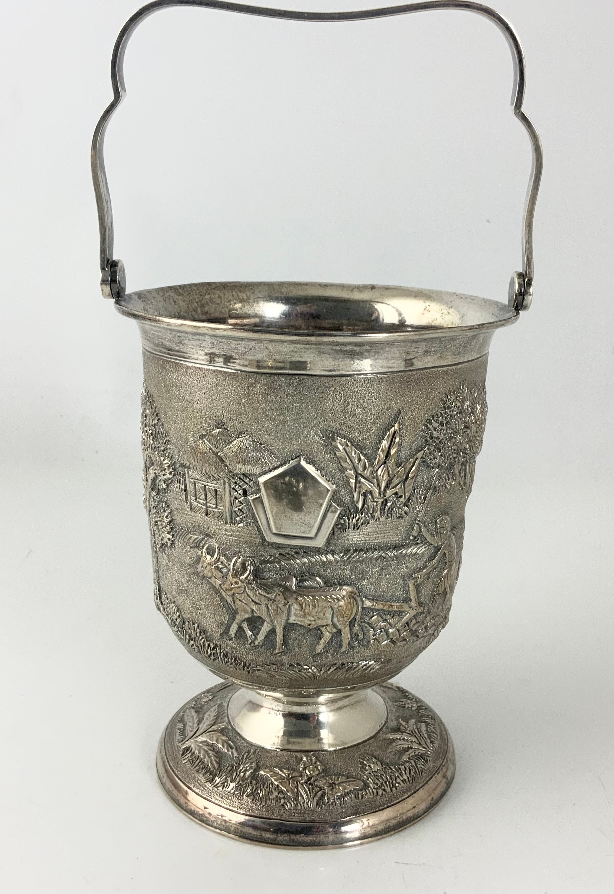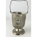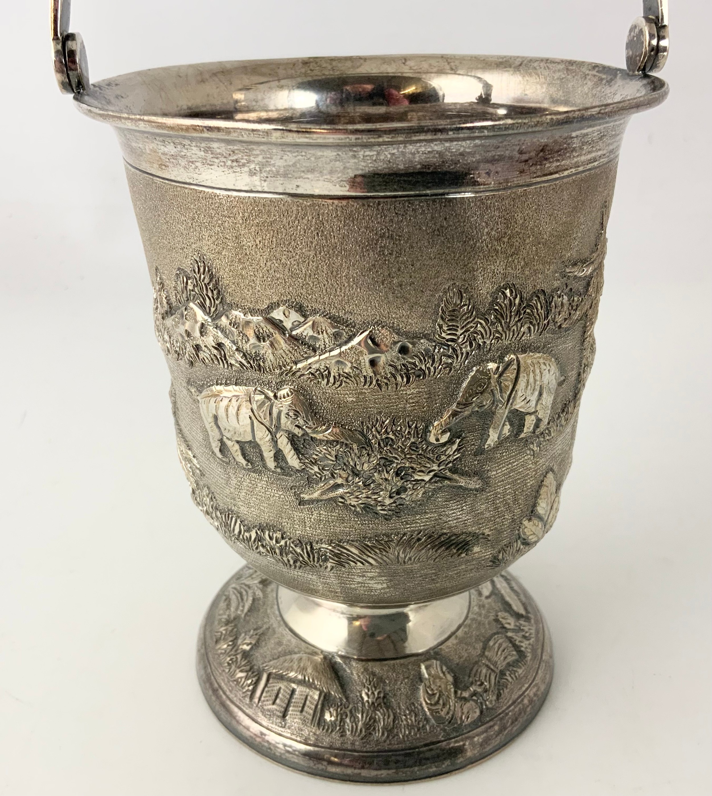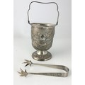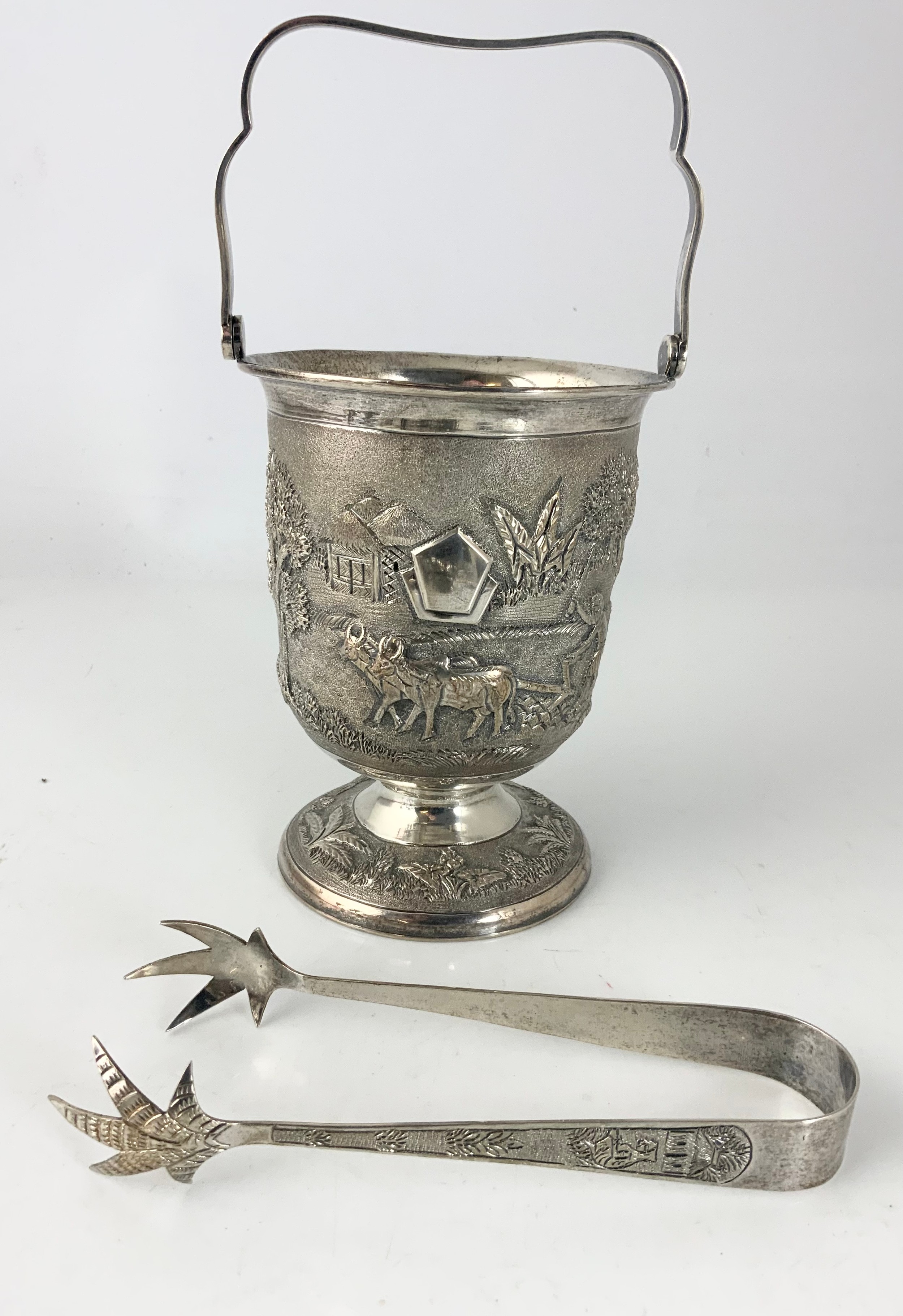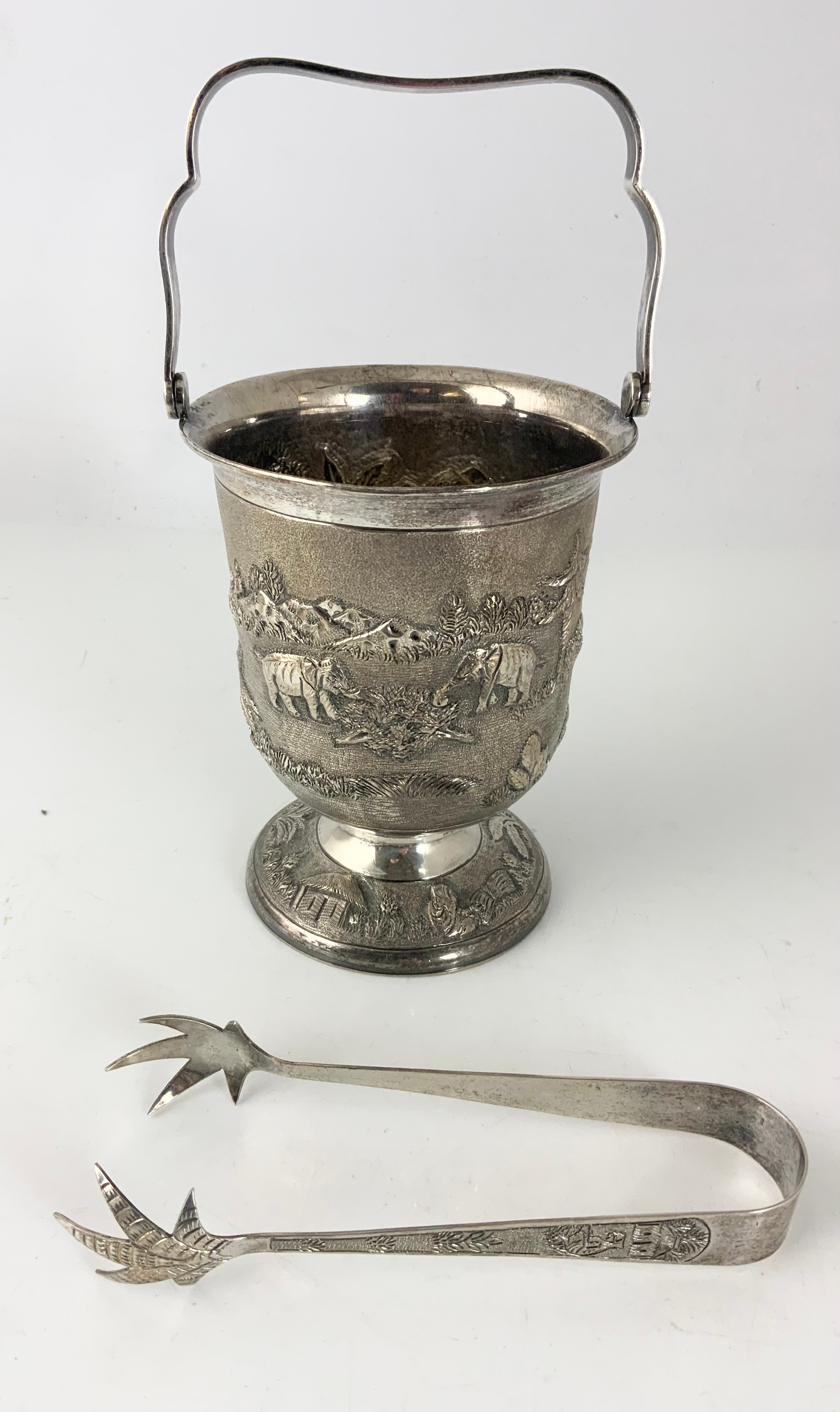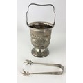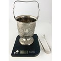 STYLISH STERLING SILVER ICE BUCKET WITH EMBOSSED DECORATION 525g STAMPED STERLING SILVER WITH A PAIR OF TONGS WITH SIMILAR DECORATION