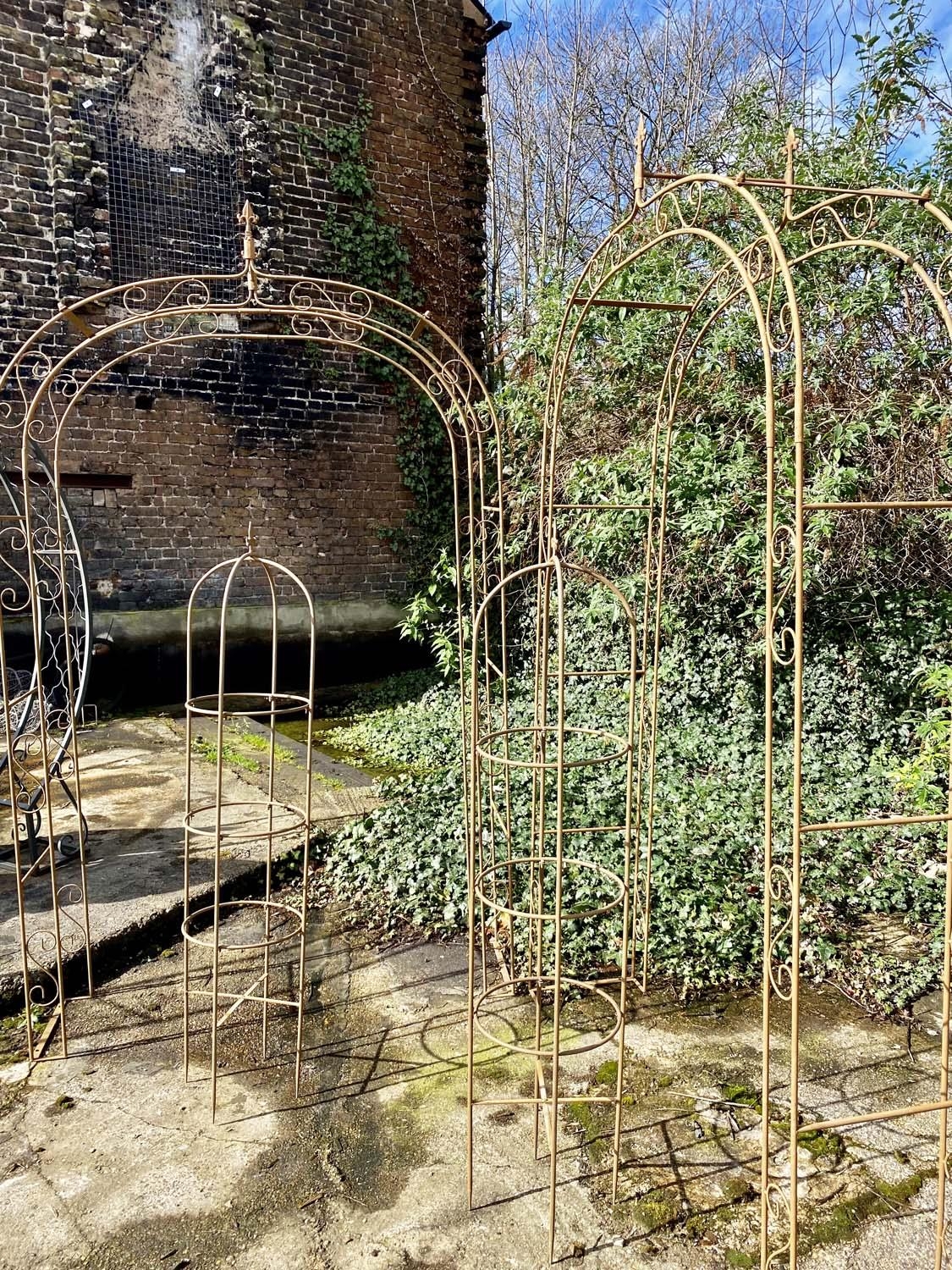 ARCHITECTURAL GARDEN COLLECTION, including two garden rose arbours and two garden obelisks, metal, 230cm x 140cm x 35cm arch and 150cm x 33cm x 33cm obelisk.