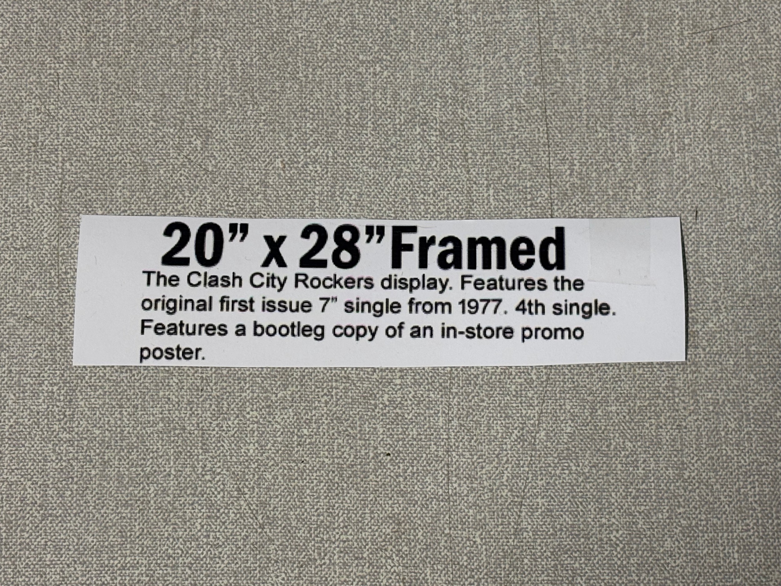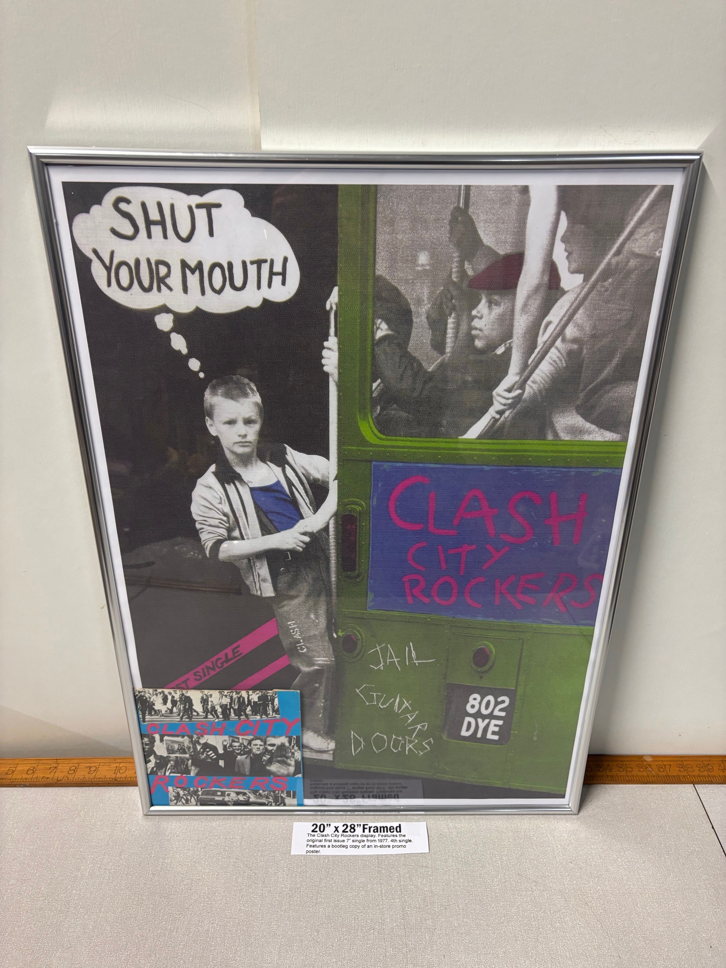 Framed The Clash city rockers display. Features the original first issue 7" single from 1977 4th single. Features a bootleg copy of an in-store promo poster 20x28" (info in pictures)