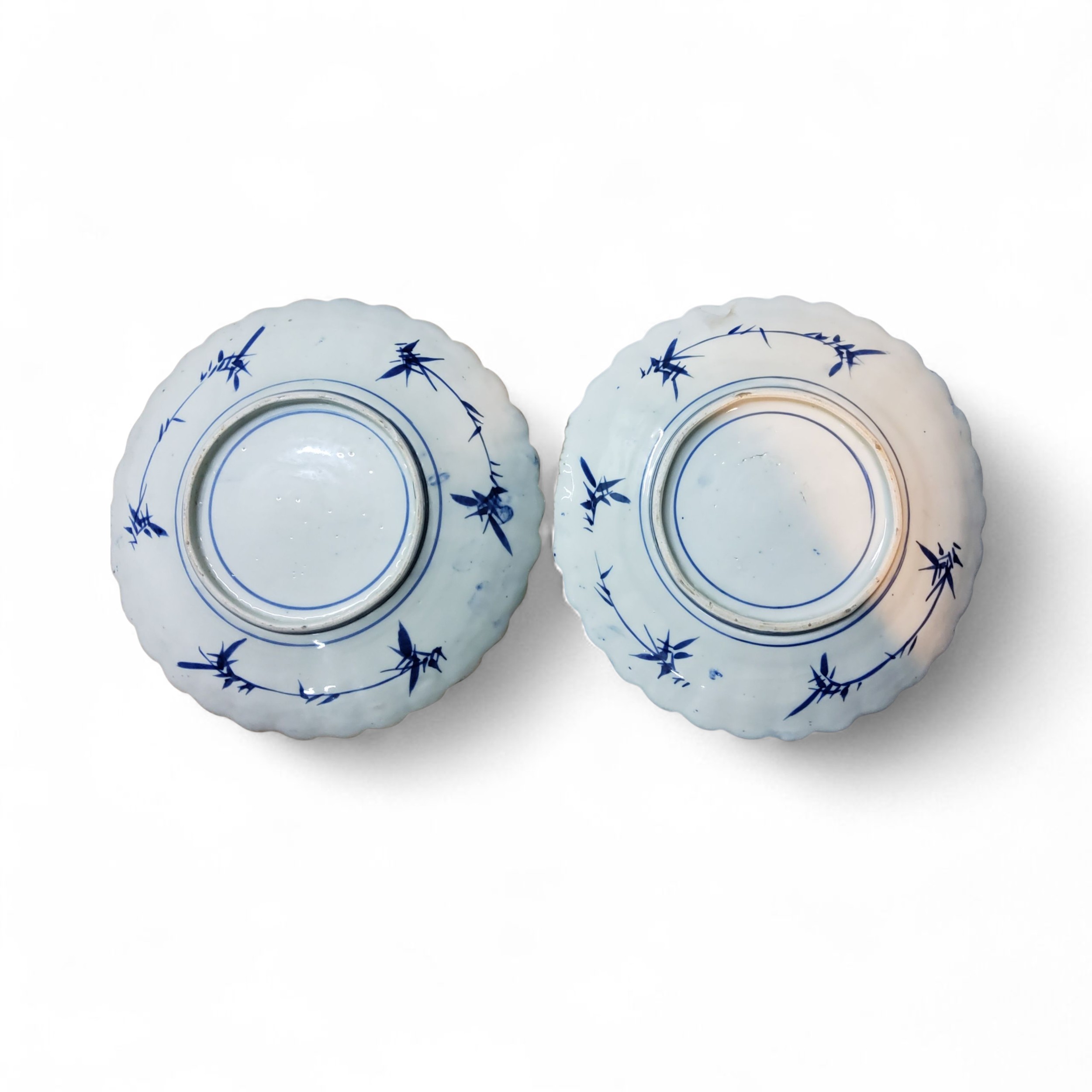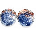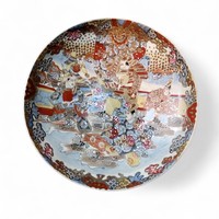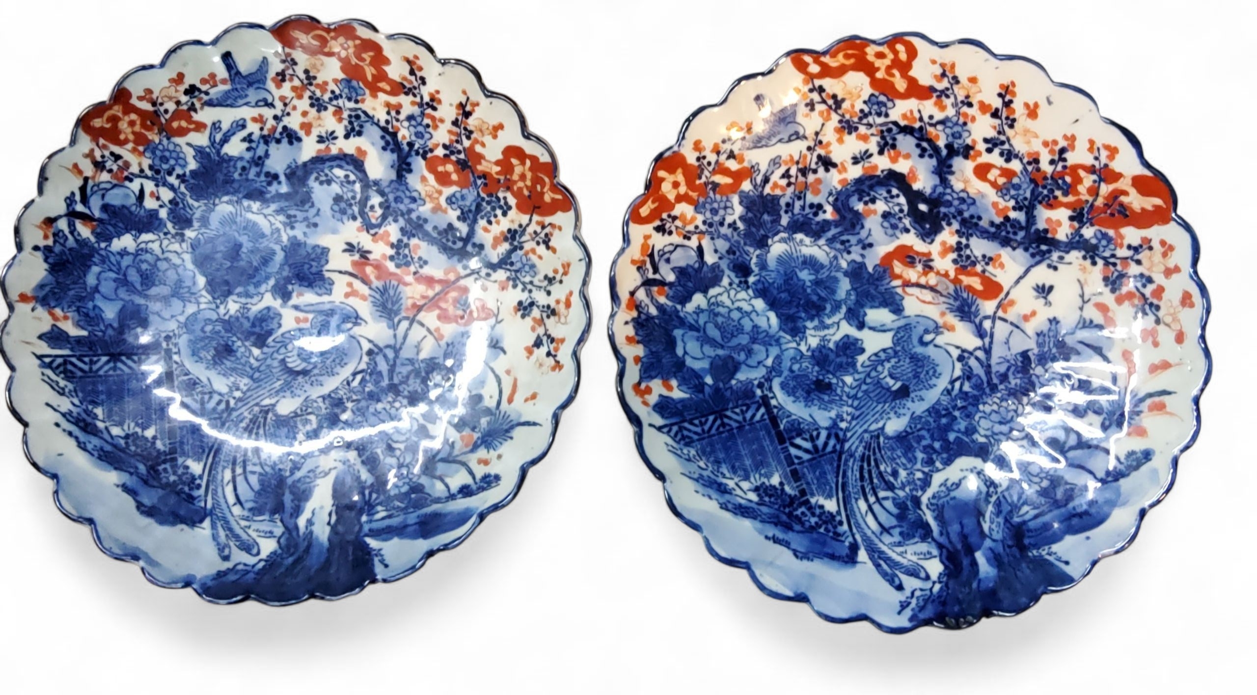 A pair of Japanese Imari shaped circular chargers, decorated with fanciful birds, chrysanthemums and blossoming branches, 31cm diam, Meiji period