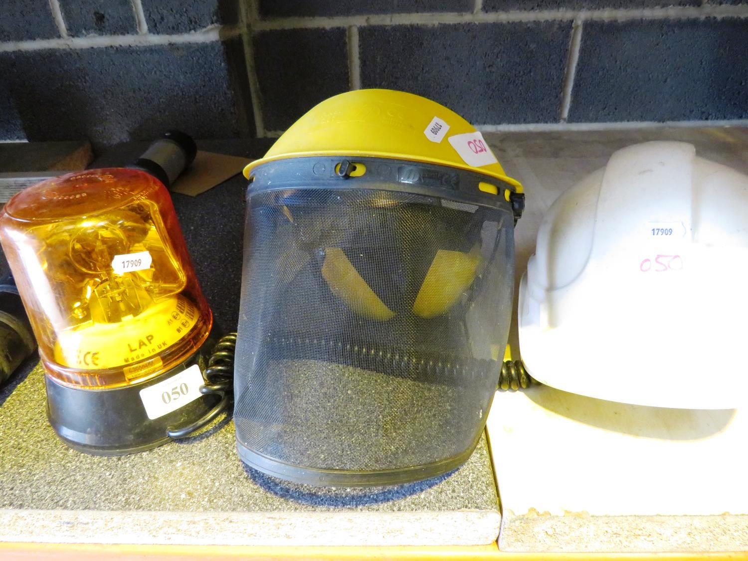 TWO SAFETY HELMETS AND A FLASHING AMBER BEACON