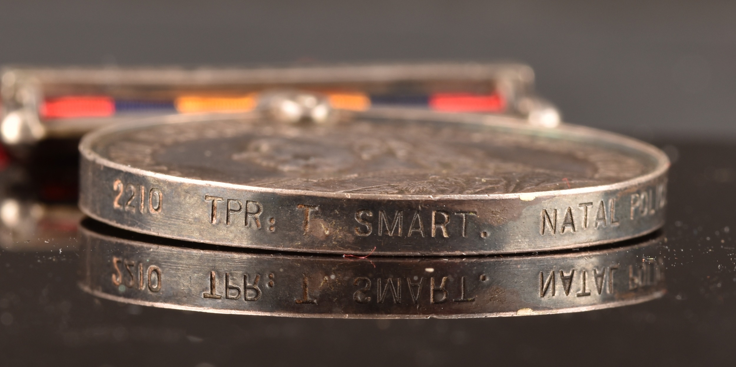 A Boer War QSA Queen’s South Africa medal with 1 clasp Relief of Ladysmith, awarded to: 2210 Trooper T. Smart, Natal Police (2210 Tpr T. Smart, Natal Police).