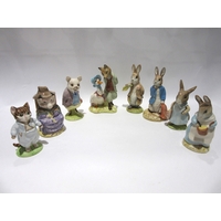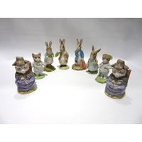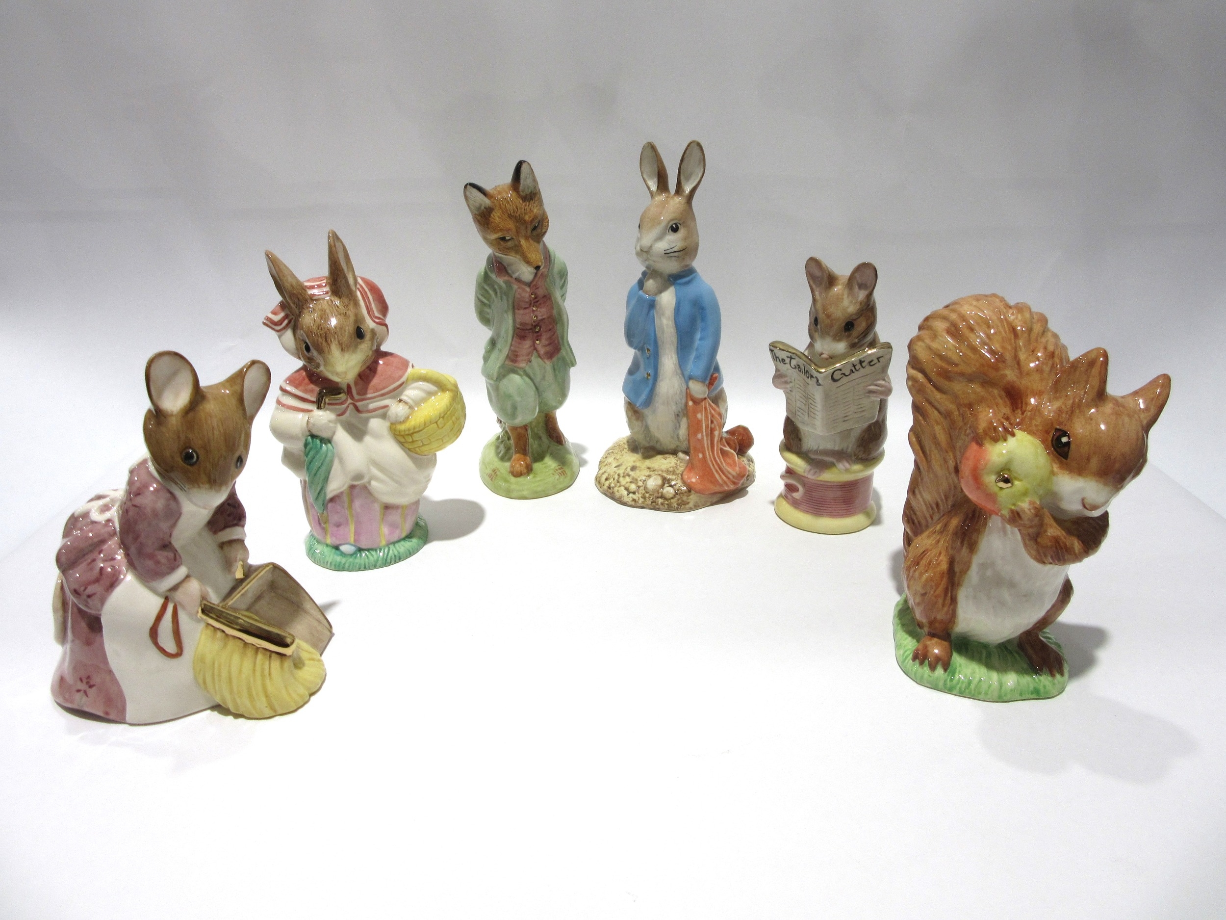 Six Beswick large gold limited edition paired Beatrix Potter figures - "Mrs Rabbit", "Foxy Whiskered Gentleman", "Hunca Munca Sweeping", "Squirrel Nutkin", "Peter and the Red Pocket Handkerchief" and "The Tailor of Gloucester"
