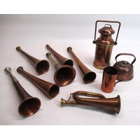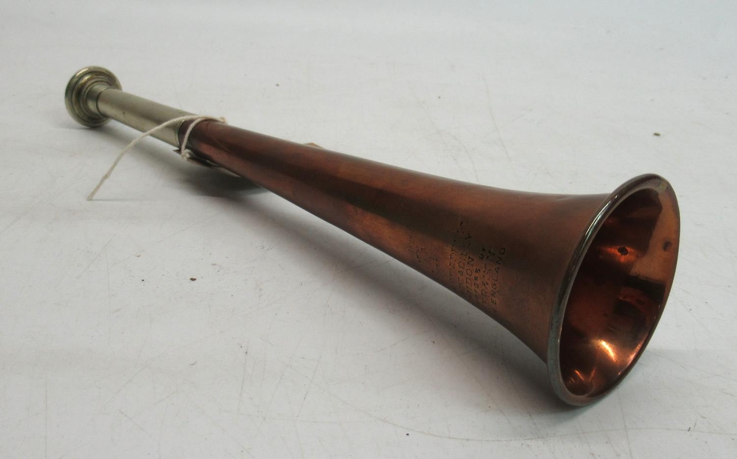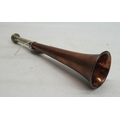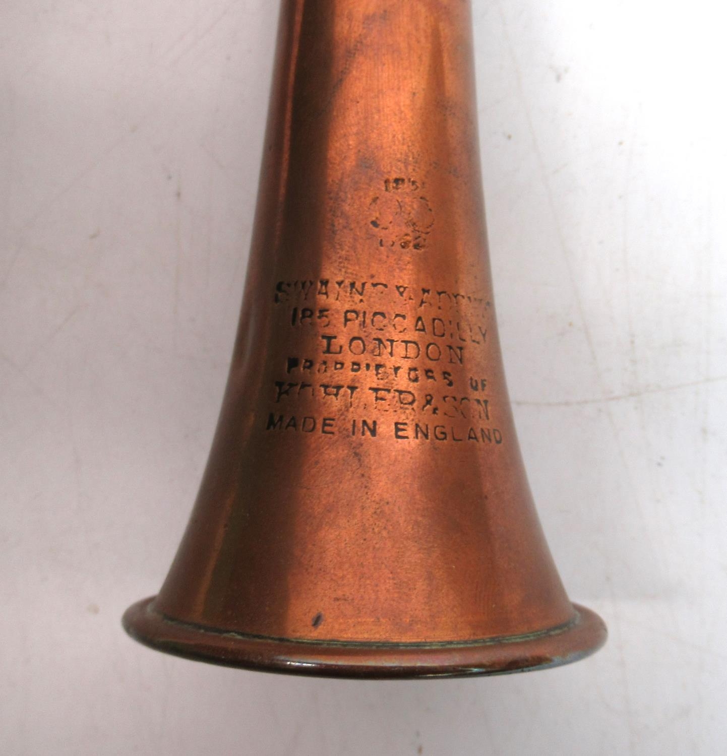 Swaine & Adeney 185 Piccadilly London - Proprietors of Kohler & Son, early C20th copper hunting horn with nickel mount and mouth piece, stamped overall L24.5cm