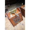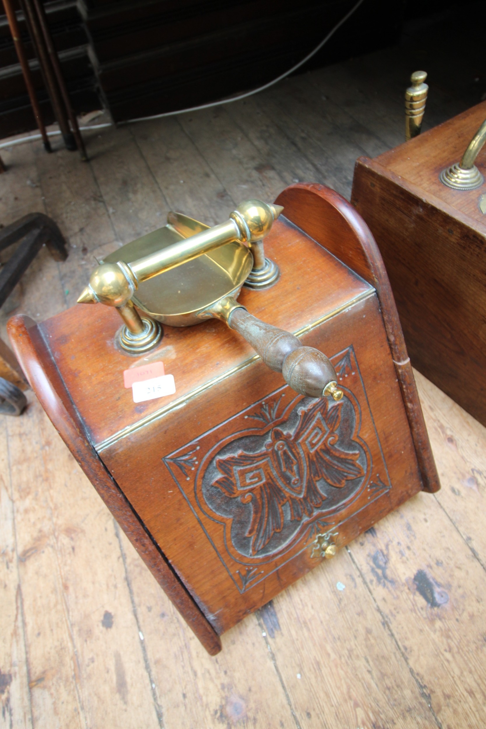Victorian wooden coal scuttle with original handle and brass coal shovel.