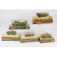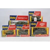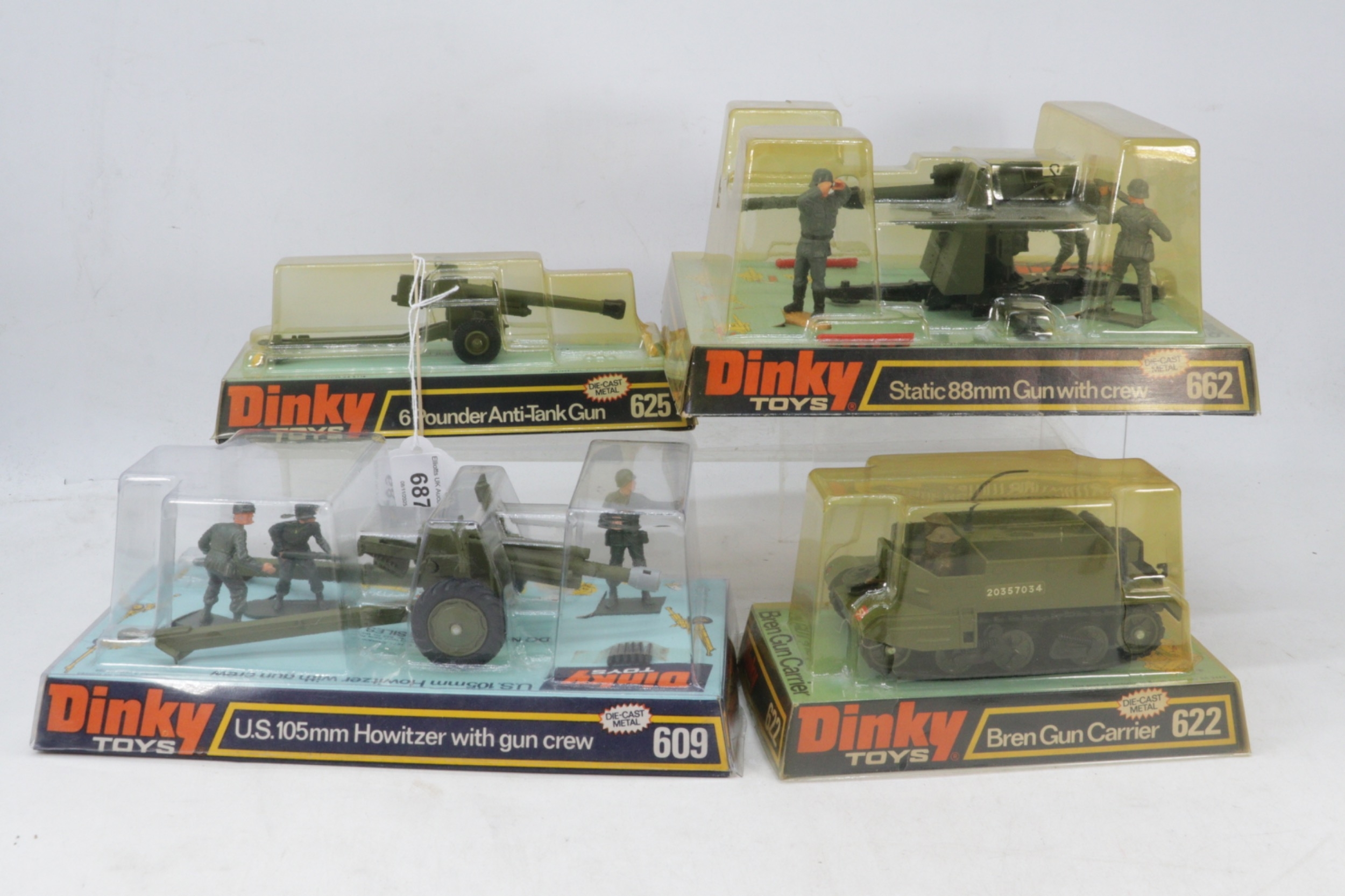 Dinky toys blister packed diecast vehicles to include 662 Static 88mm gun with crew, 625 6 pounder Anti-tank gun, 622 Bren Gun Carrier, and 609 US 105mm Howitzer with gun crew