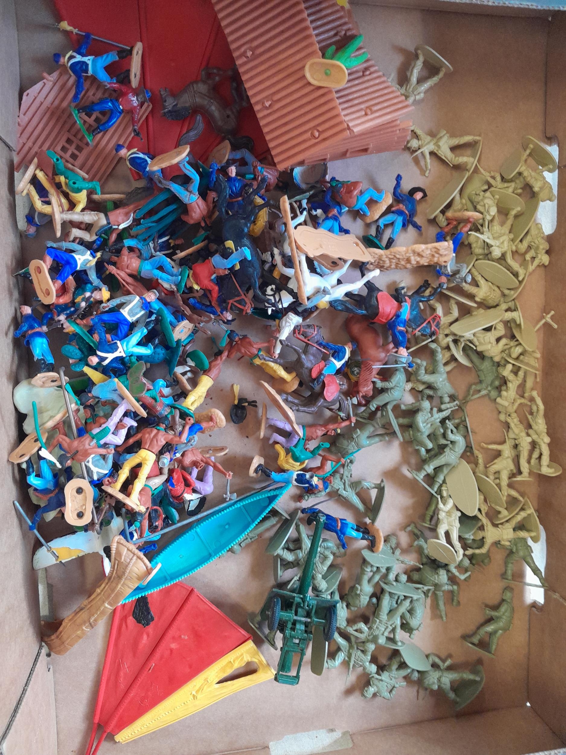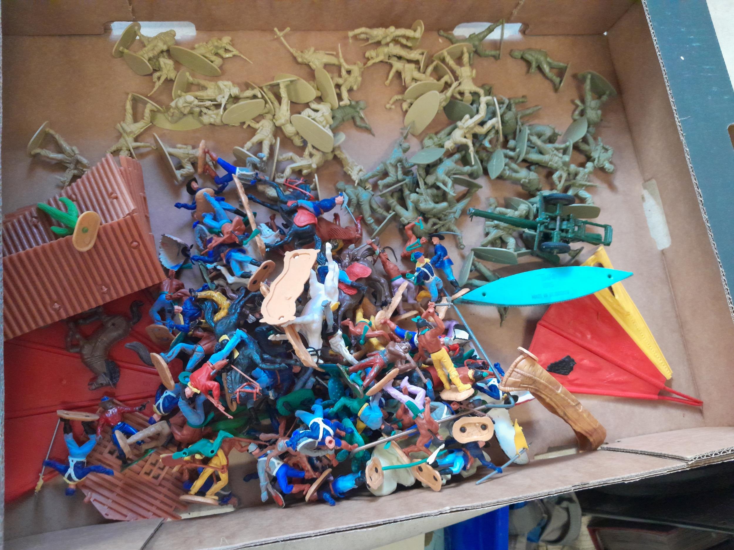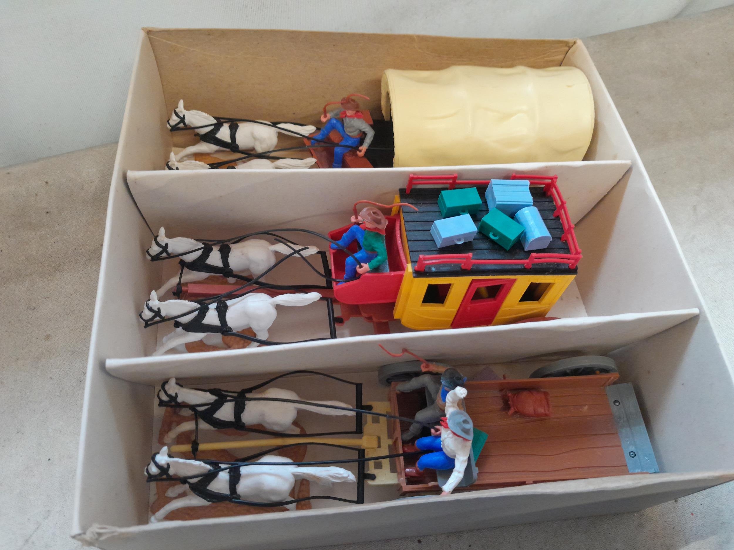 Vintage Timpo Toys and other plastic figures : soldiers, Cowboys and Indians, 1 x boxed set Western Wagons in early non printed box