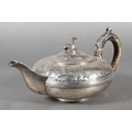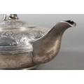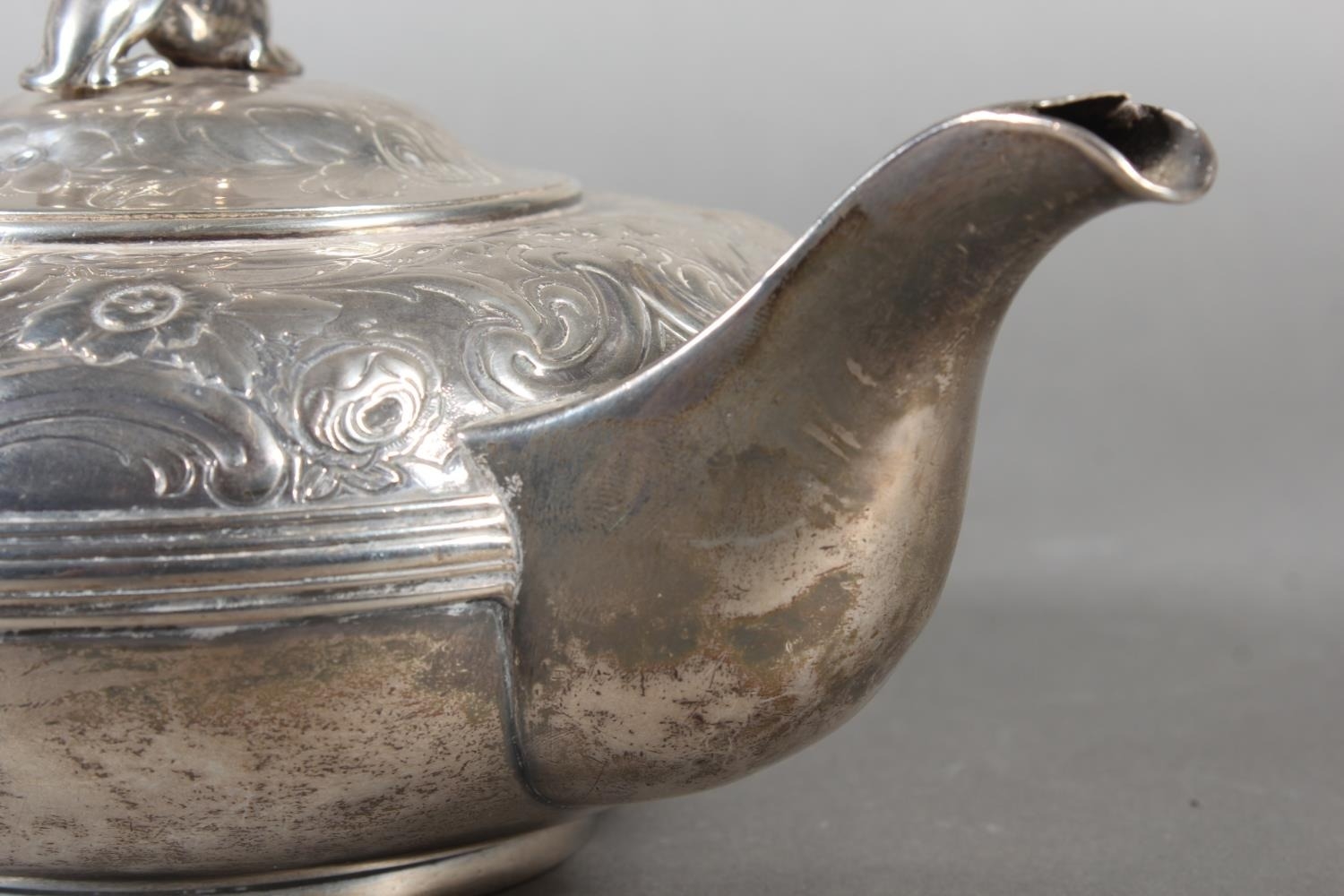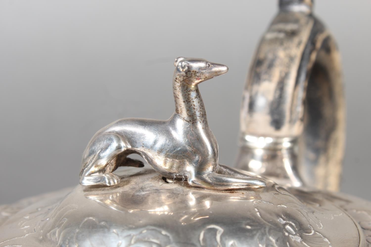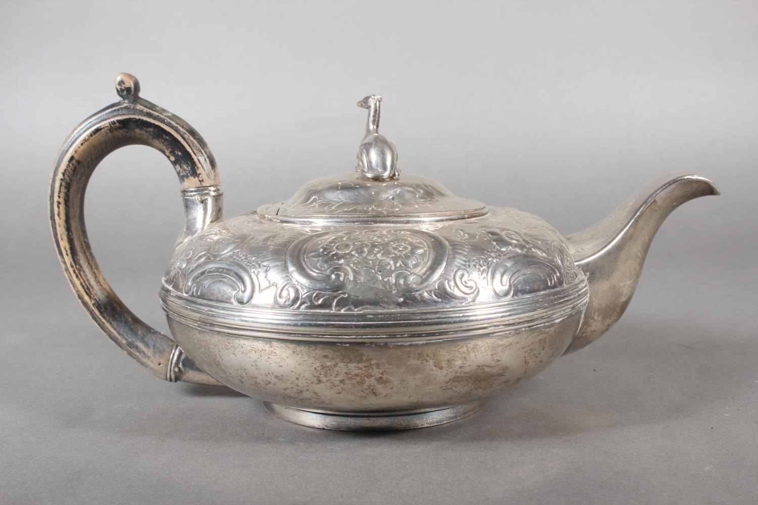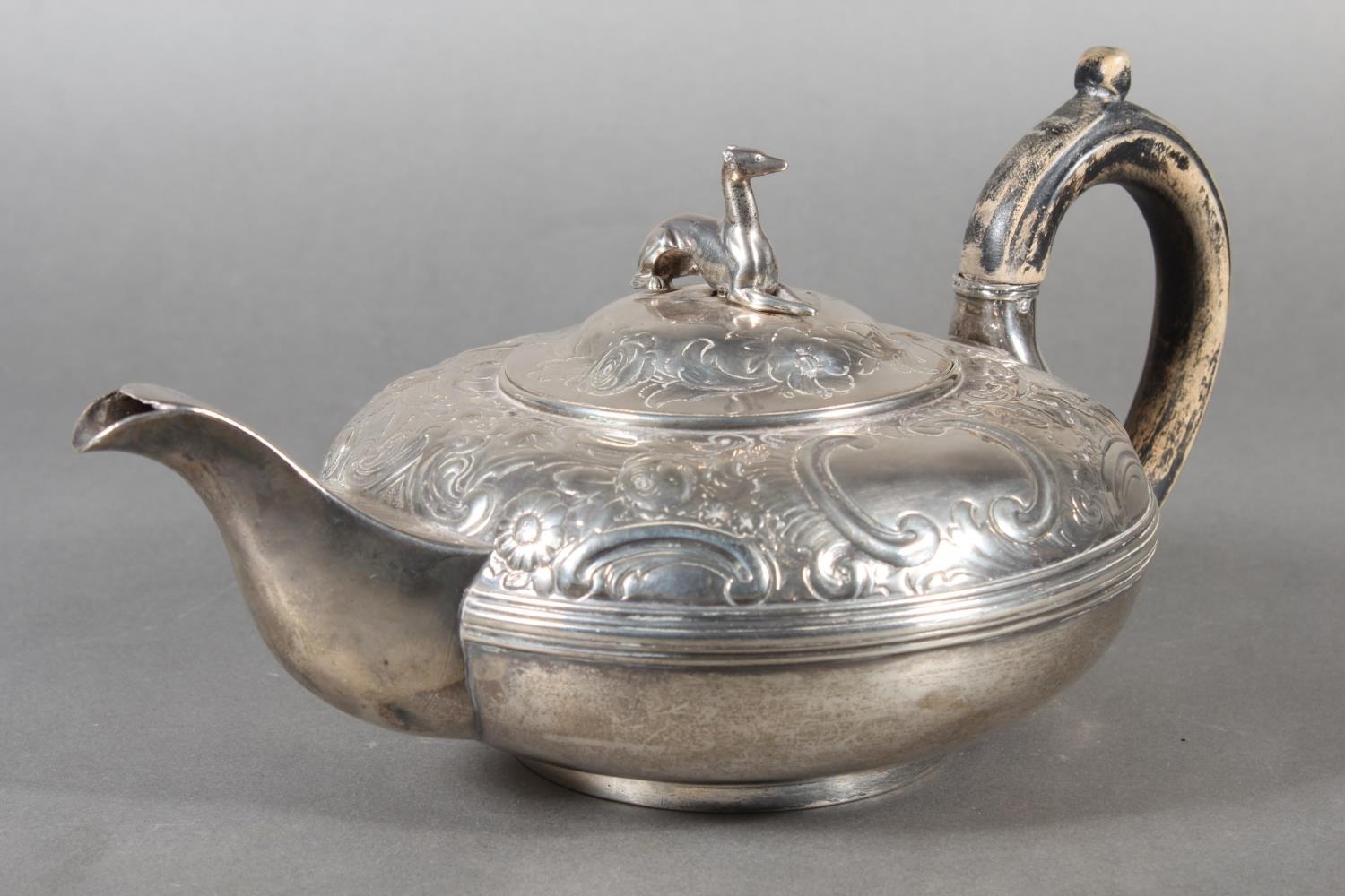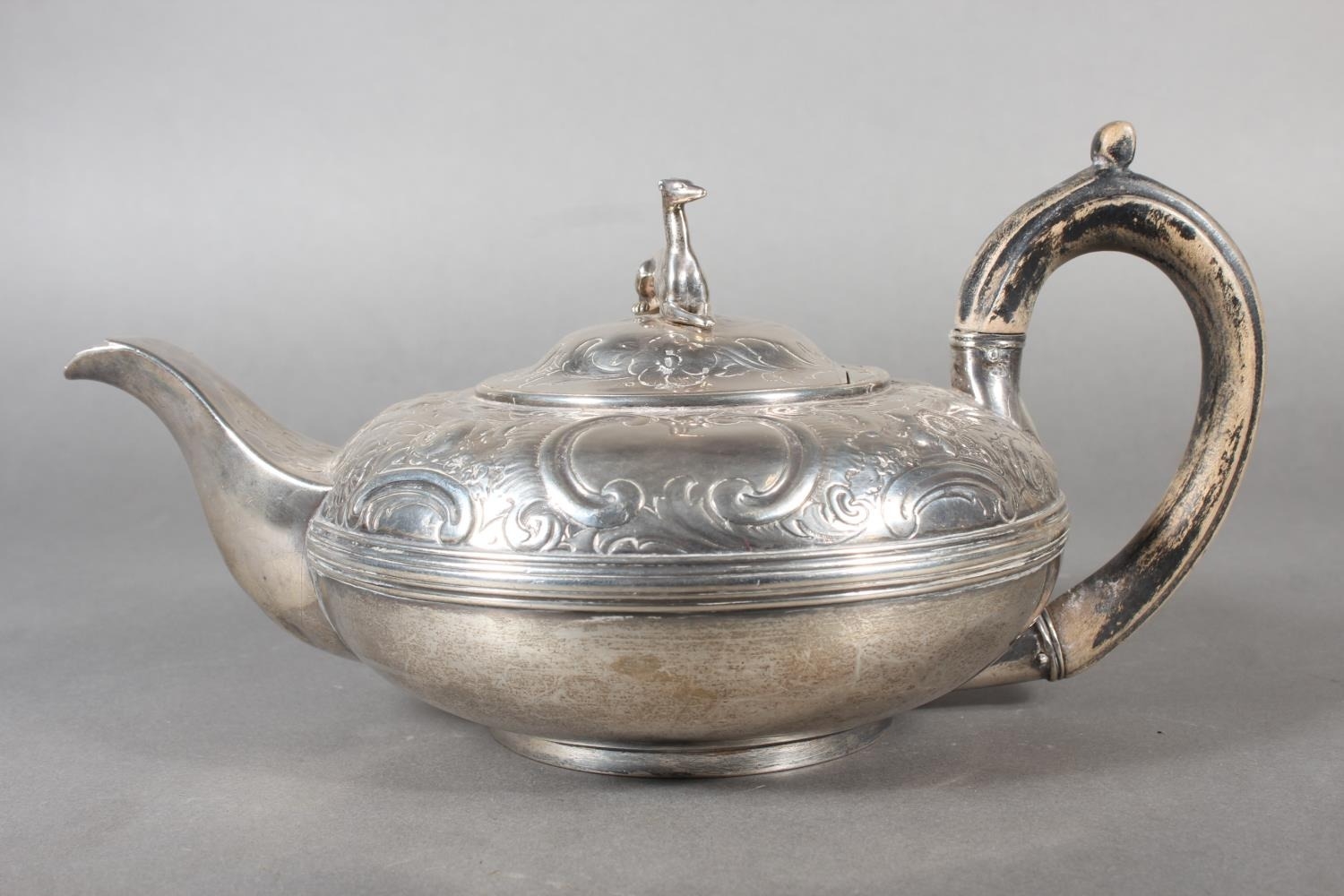 Geo IV silver teapot with heavy foliate decoration and greyhound or whippet mount finial to the lid, Rebecca Emes & Edward Barnard I, London, 1826, 581g.