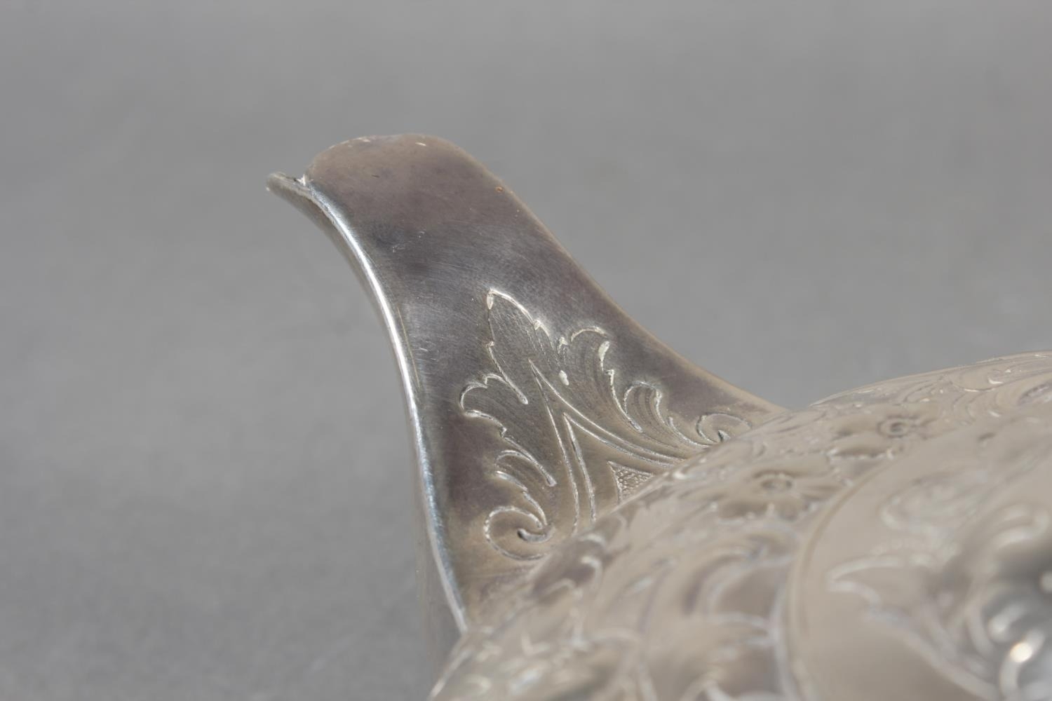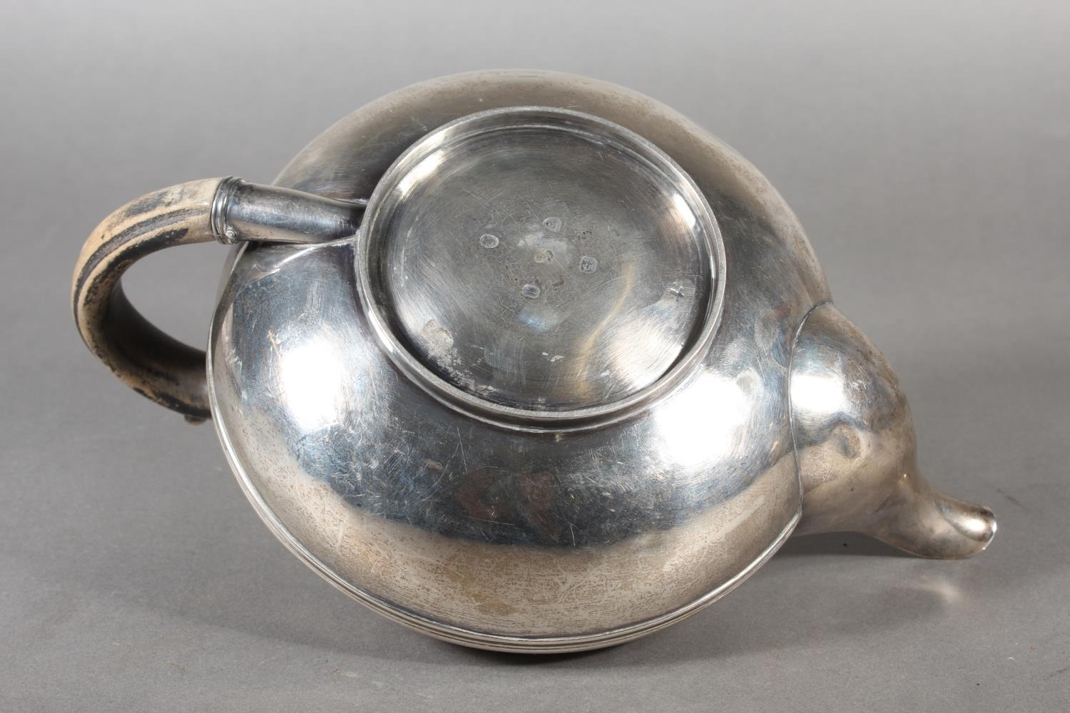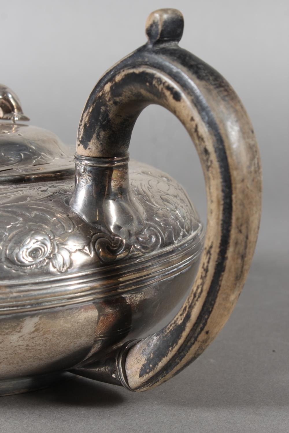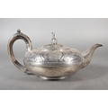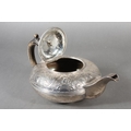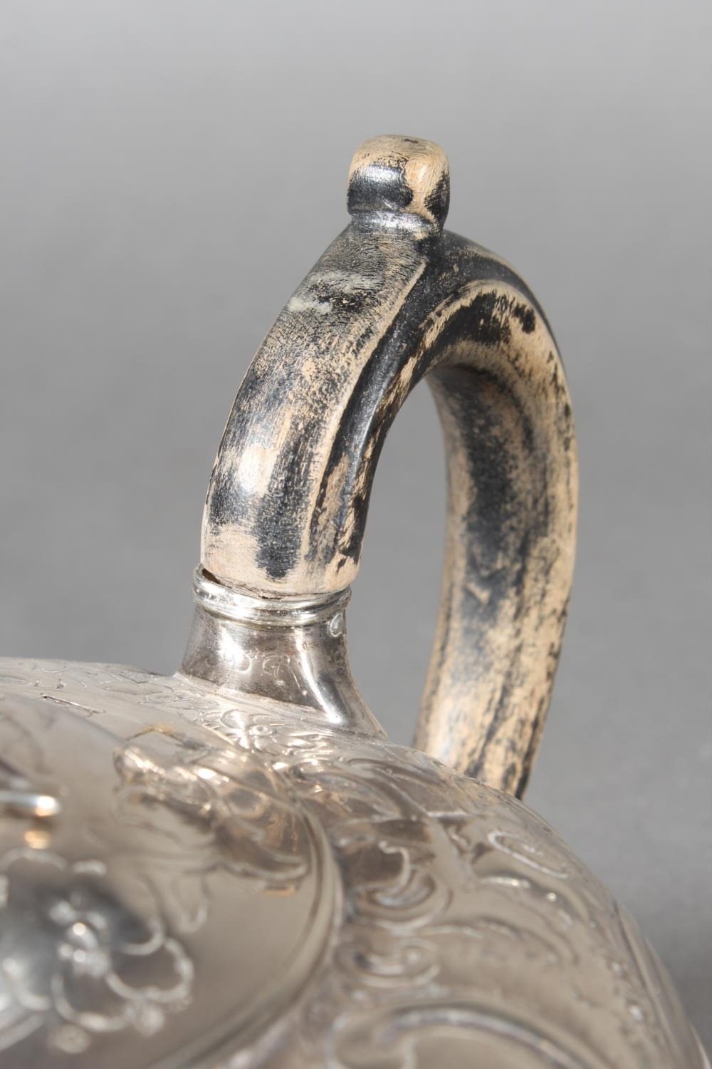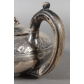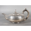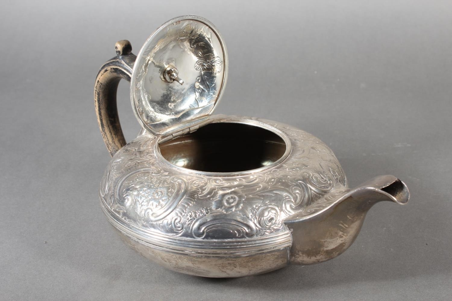 Geo IV silver teapot with heavy foliate decoration and greyhound or whippet mount finial to the lid, Rebecca Emes & Edward Barnard I, London, 1826, 581g.