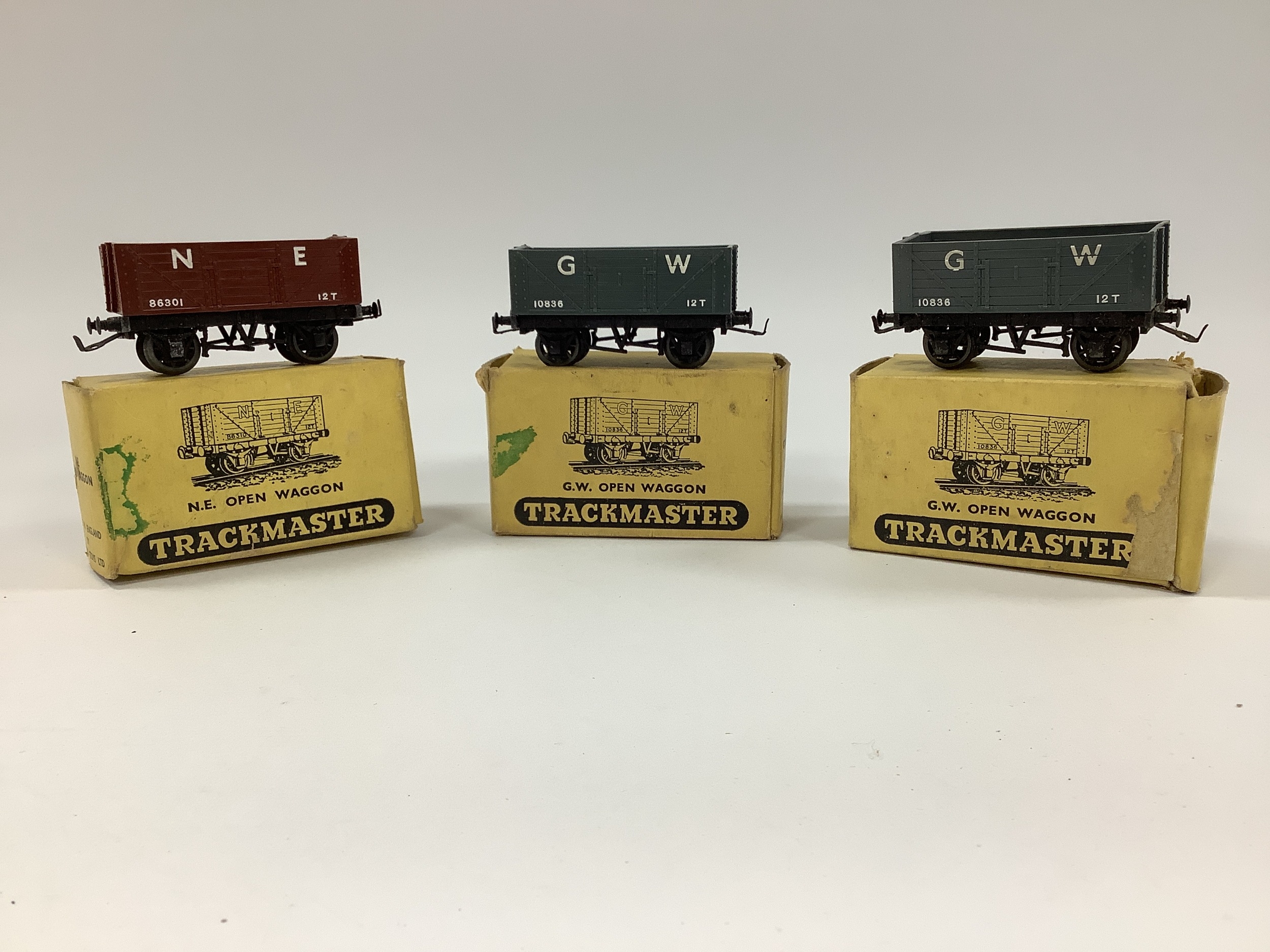Three boxed "Trackmaster" 00 gauge "open waggons", two GW, one NE, with original couplings, in good condition in fair to good boxes.