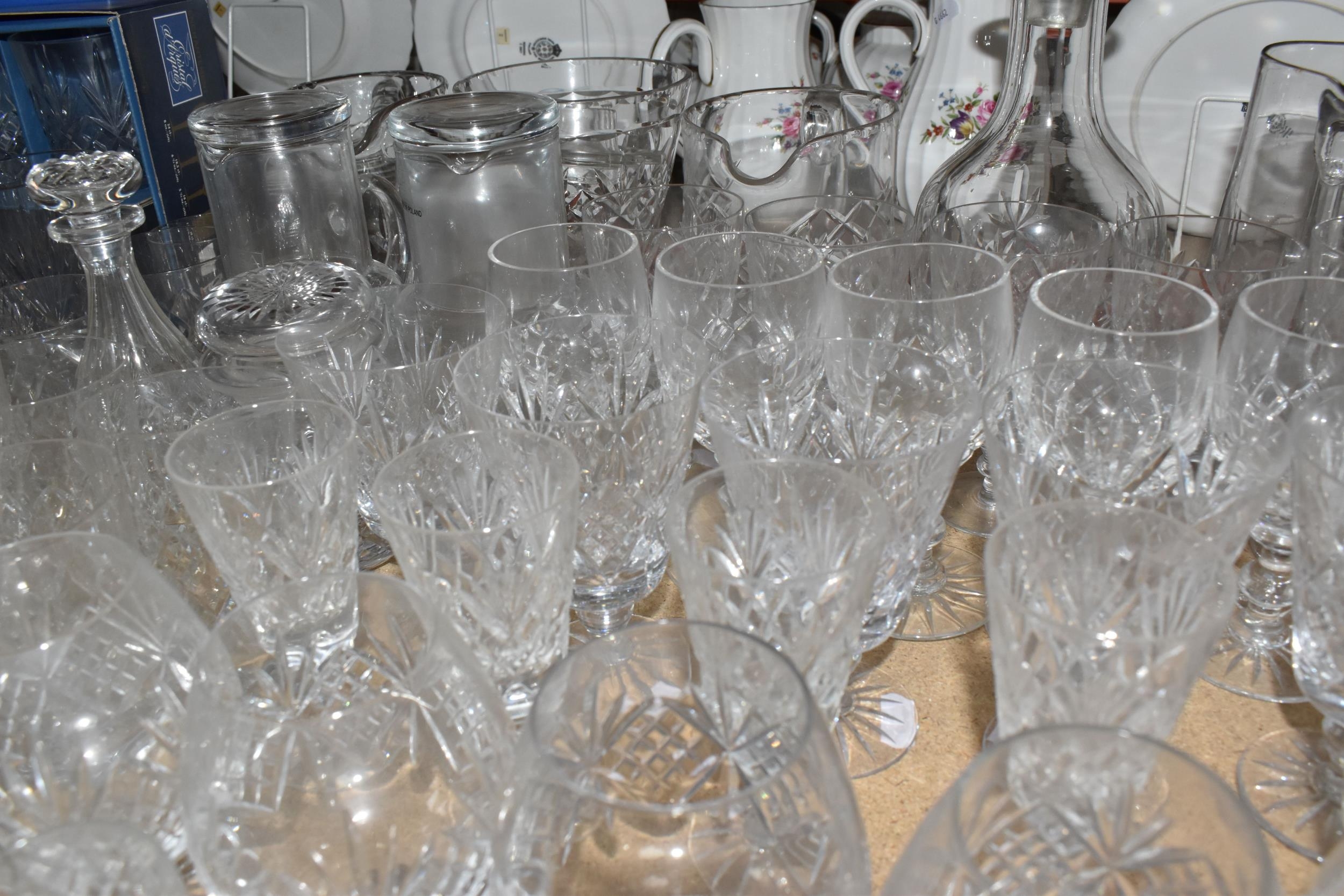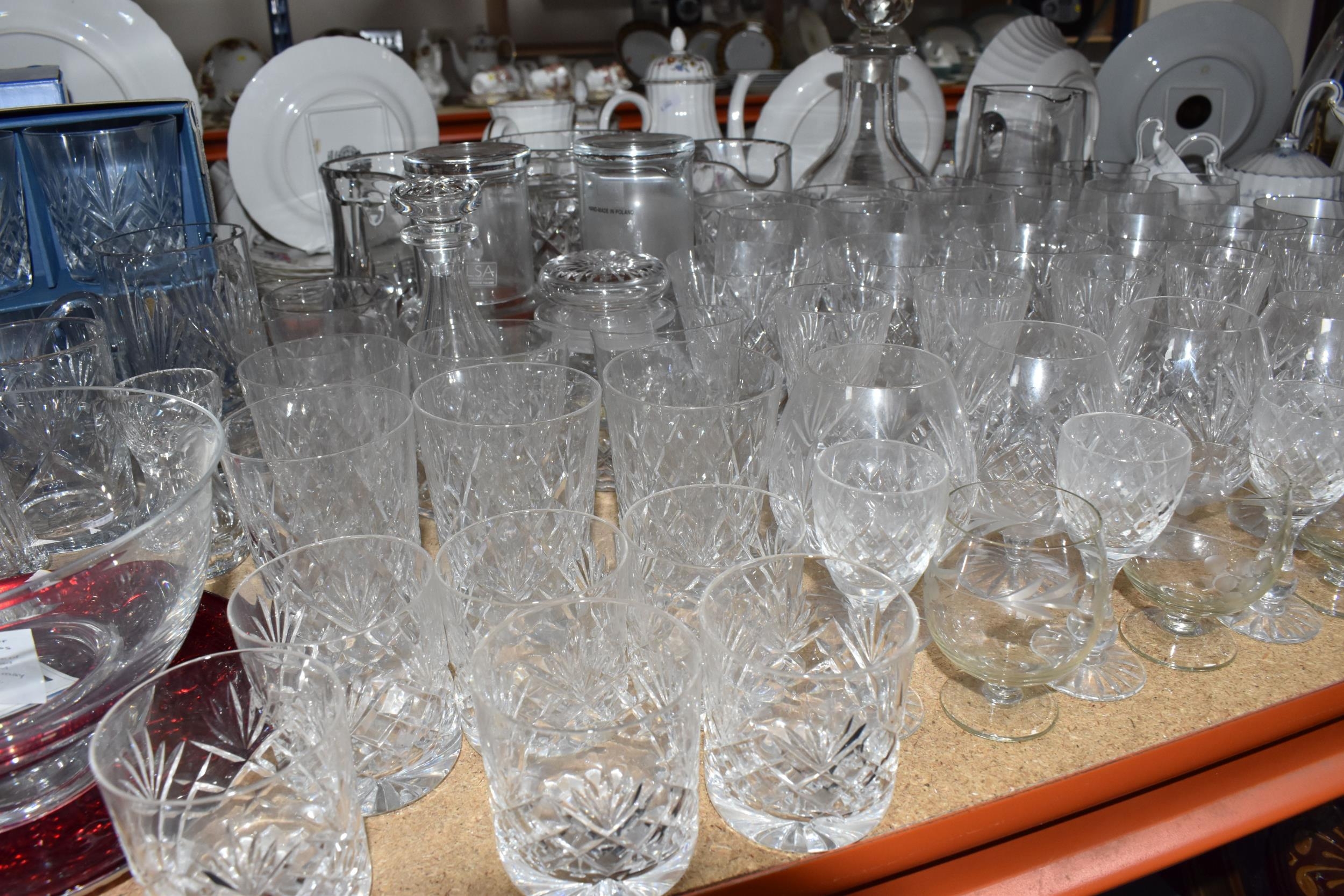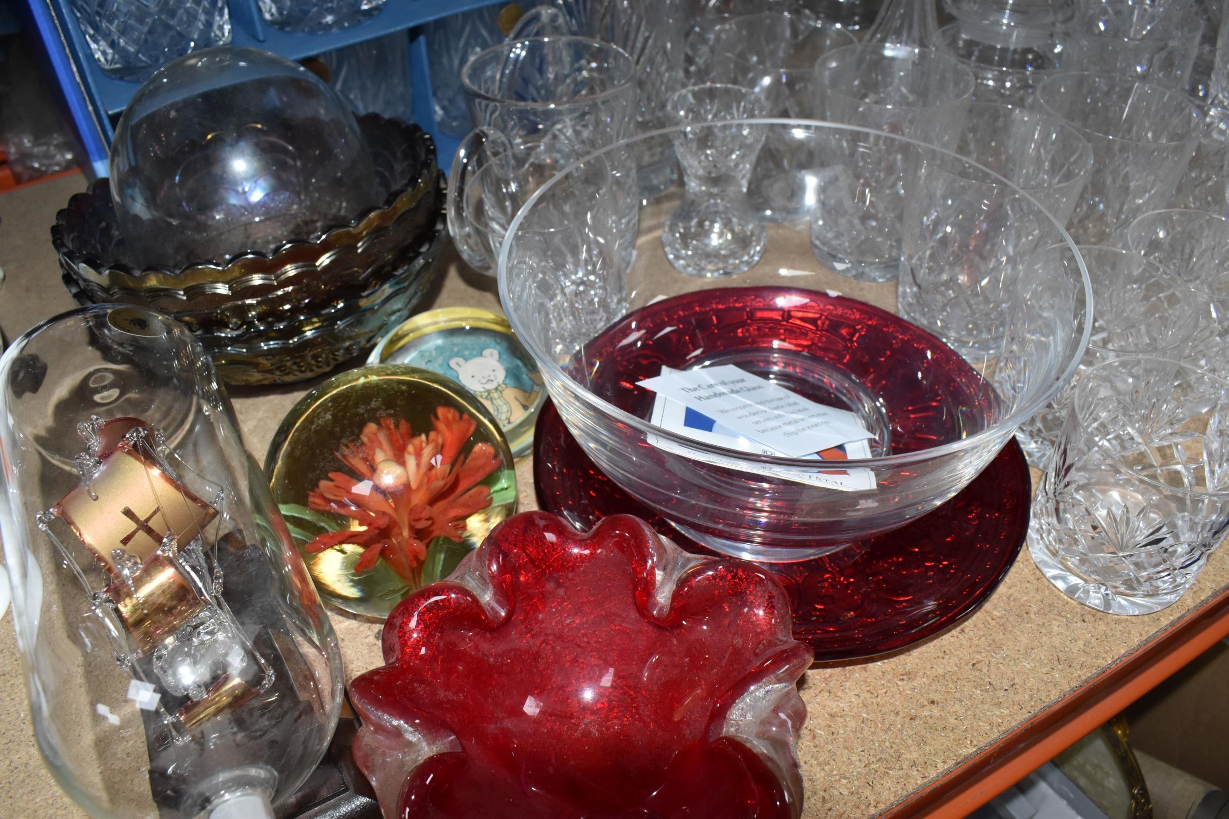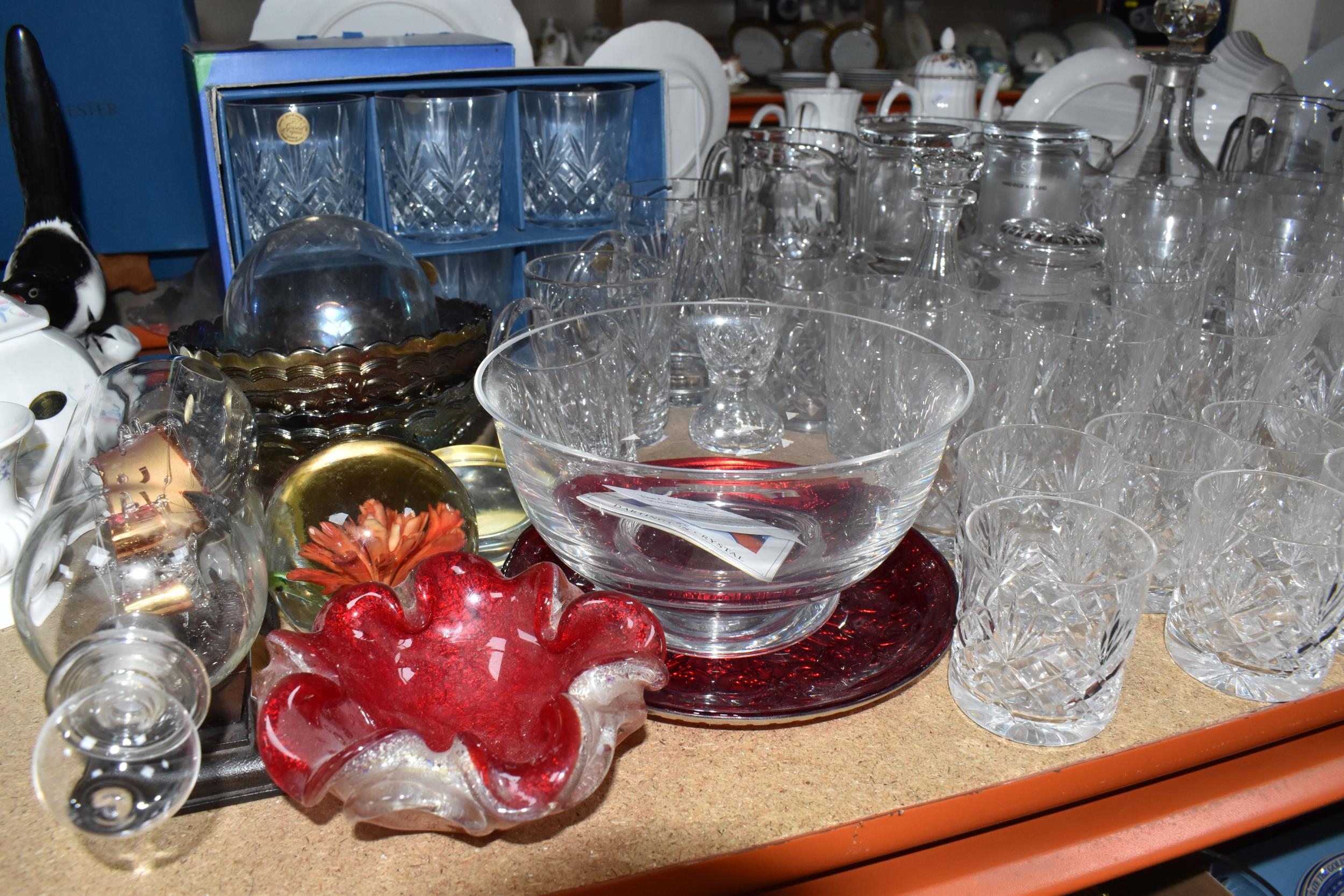 A GROUP OF CUT CRYSTAL AND OTHER GLASS WARE, approximately eighty pieces to include assorted cut crystal drinking glasses, including eight sets/part sets, a boxed set of six Cristal d'Arques tumblers, a boxed Dartington Crystal Cheltenham bowl (second quality), two LSA carafes, two amethyst carnival glass bowls, an art glass bowl with decorative pulled rim, two paperweights, a squat glass dome, diameter 11.5cm x height 10cm, a Mayflower Glass ship in a bottle, etc (qty) (Condition Report: most pieces appear ok, some inclusions, chips and fleabites, glasses appear cloudy, would benefit from a clean)