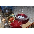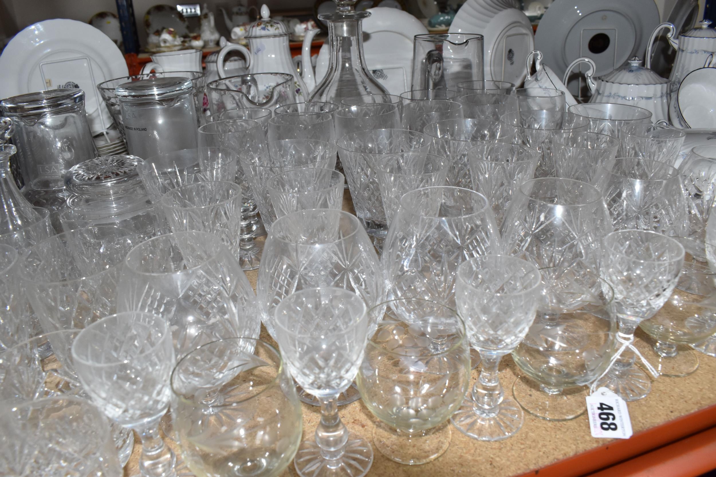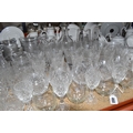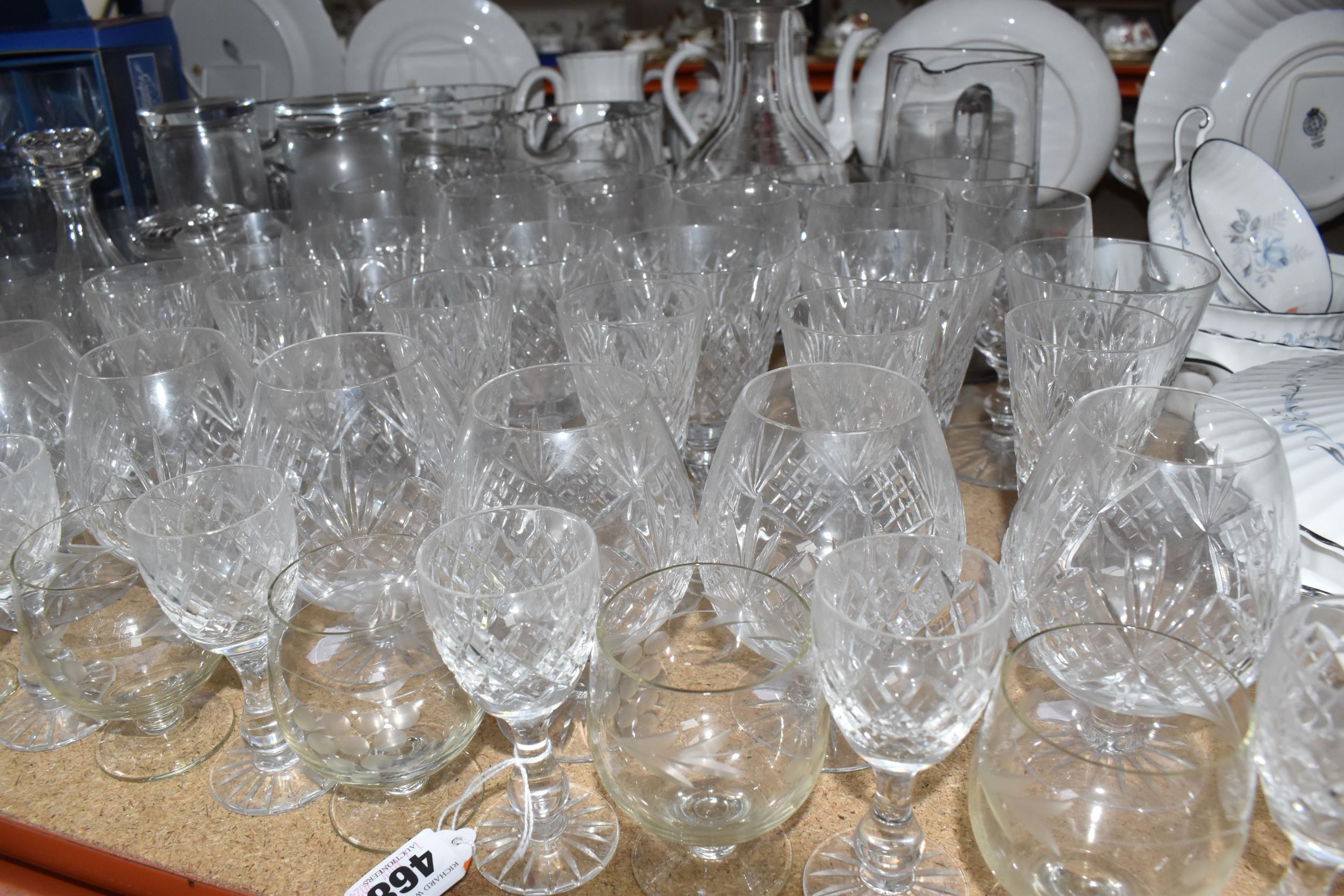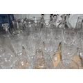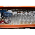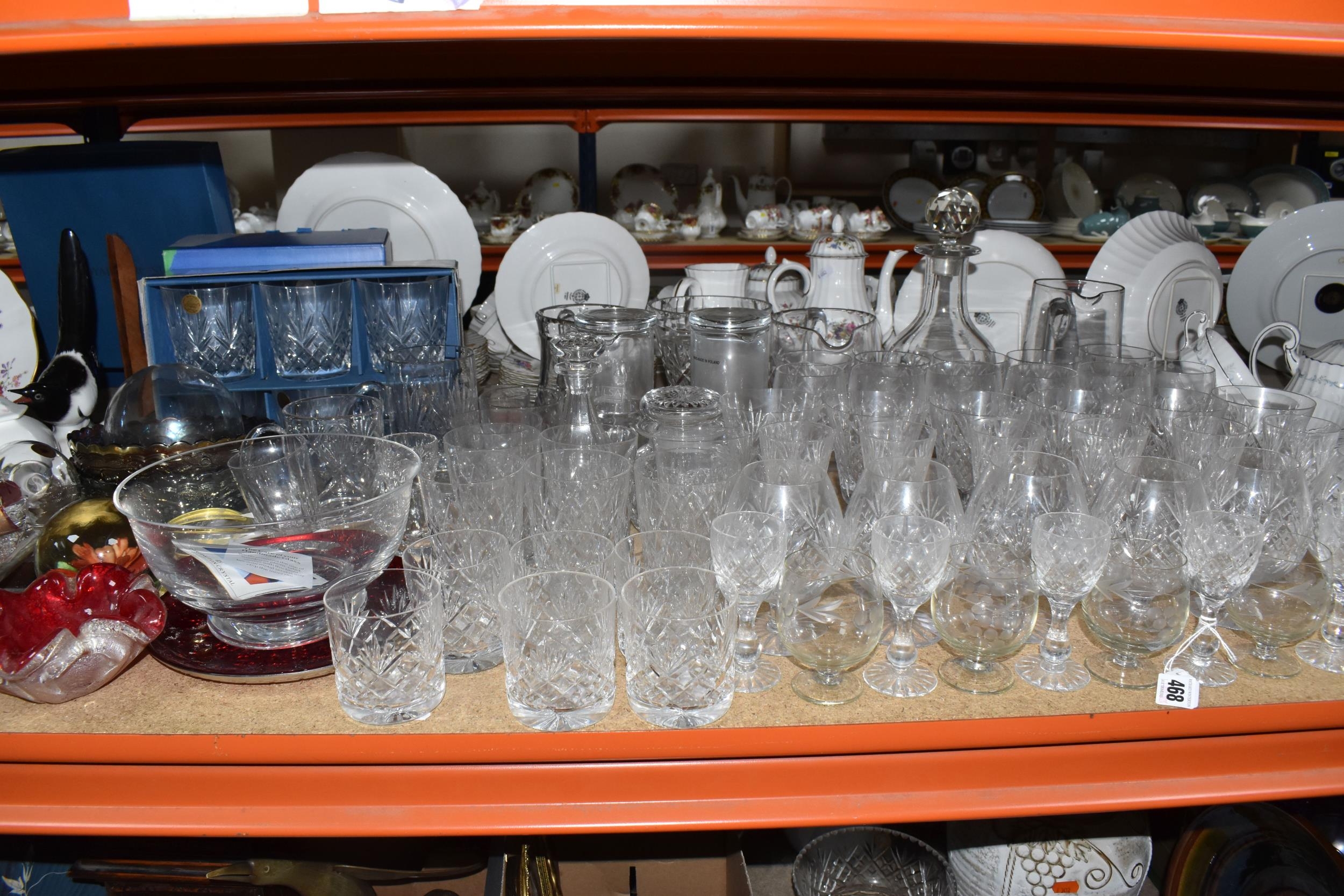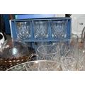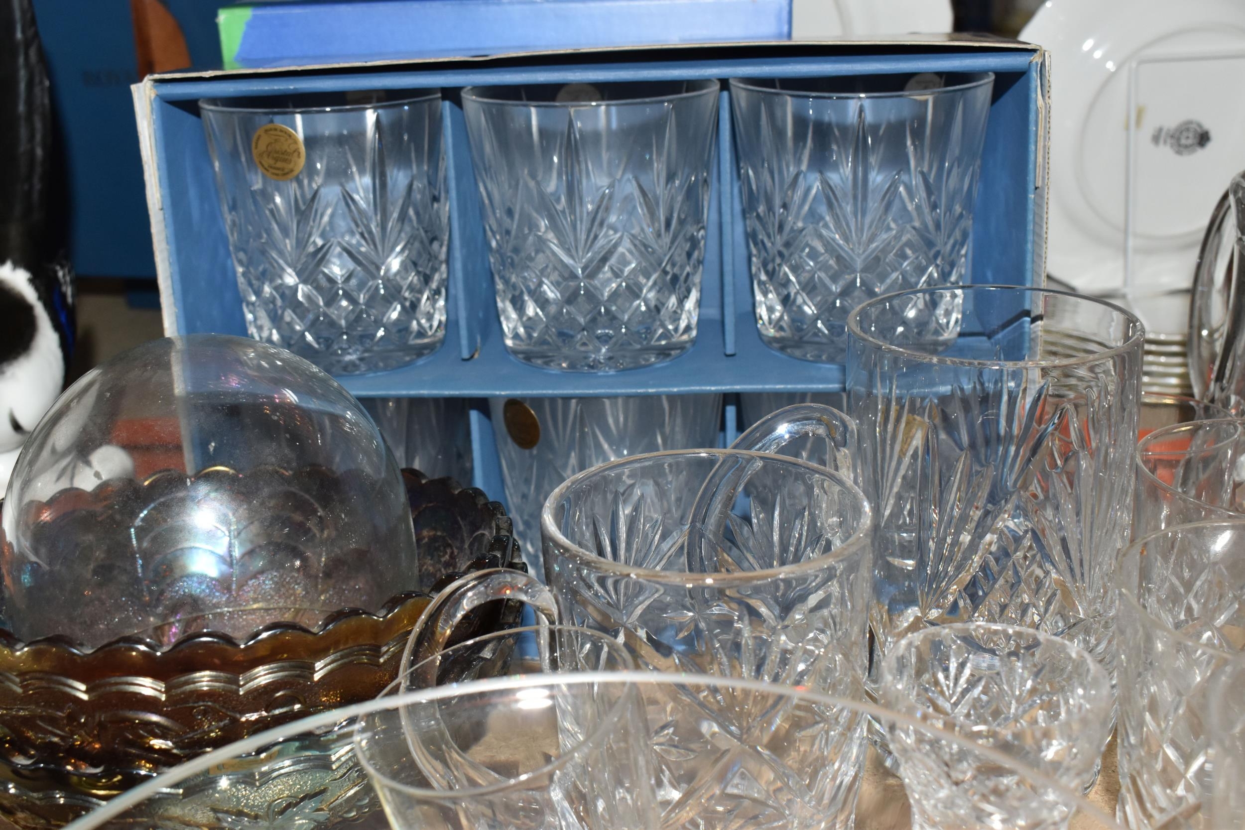 A GROUP OF CUT CRYSTAL AND OTHER GLASS WARE, approximately eighty pieces to include assorted cut crystal drinking glasses, including eight sets/part sets, a boxed set of six Cristal d'Arques tumblers, a boxed Dartington Crystal Cheltenham bowl (second quality), two LSA carafes, two amethyst carnival glass bowls, an art glass bowl with decorative pulled rim, two paperweights, a squat glass dome, diameter 11.5cm x height 10cm, a Mayflower Glass ship in a bottle, etc (qty) (Condition Report: most pieces appear ok, some inclusions, chips and fleabites, glasses appear cloudy, would benefit from a clean)