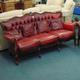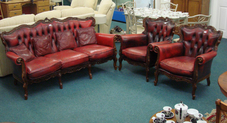 Italian mahogany framed red leather three piece suite comprising a three seater sofa and two matching armchairs