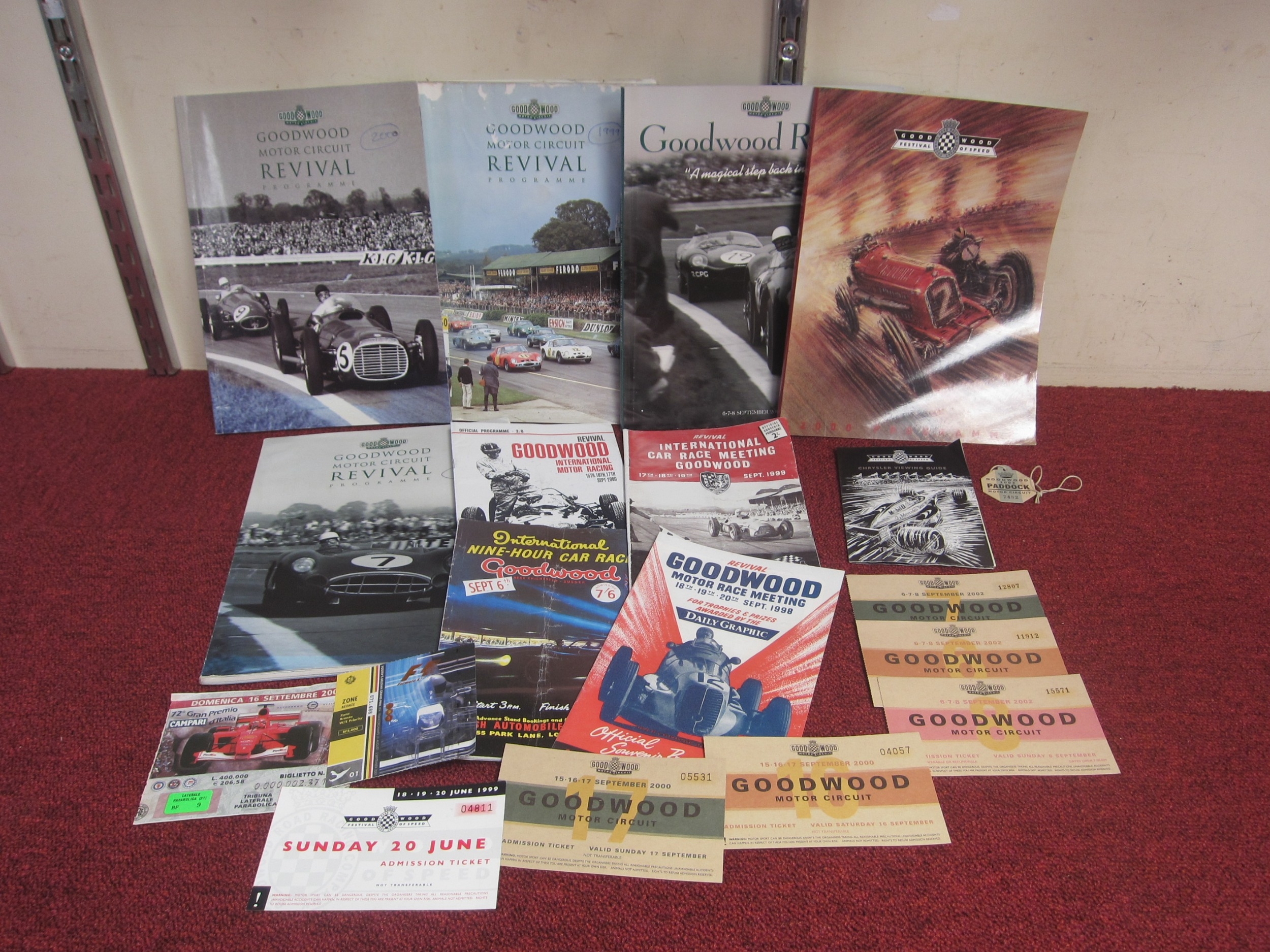 Nine Goodwood Revival programmes, a 2001 Italian Grand Prix Tickets and a 2001 Belgium Grand Prix Ticket, Six Goodwood Tickets 1 x 1999, 2 x 200 and 3 x 2002
