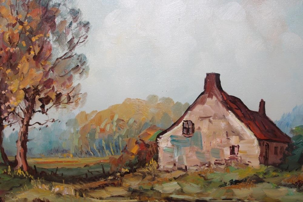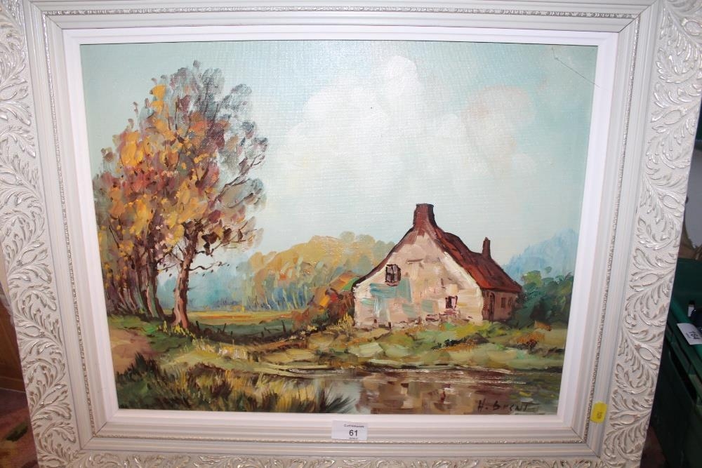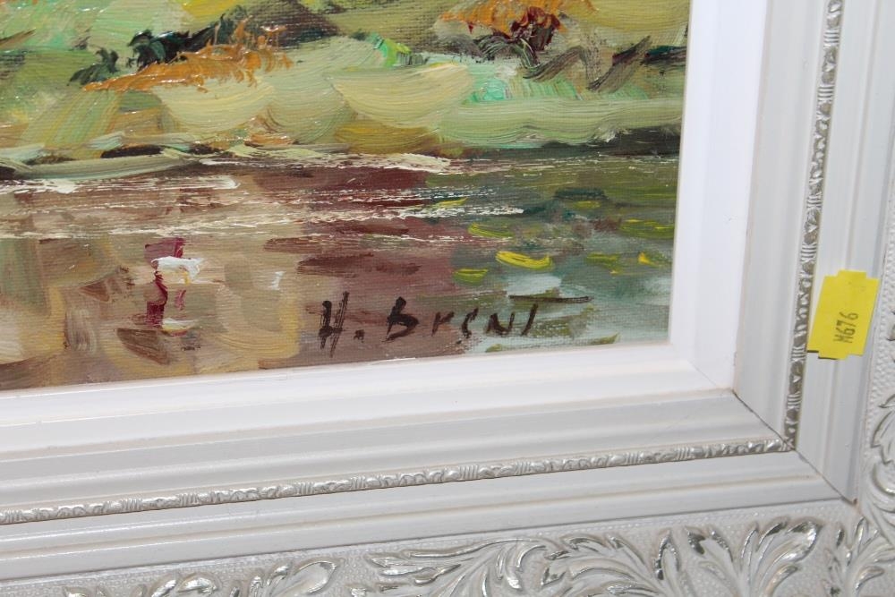 A FRAMED IMPRESSIONIST OIL ON CANVAS DEPICTING A COUNTRY COTTAGE SIGNED H BRENT LOWER RIGHT 39CM X 48CM