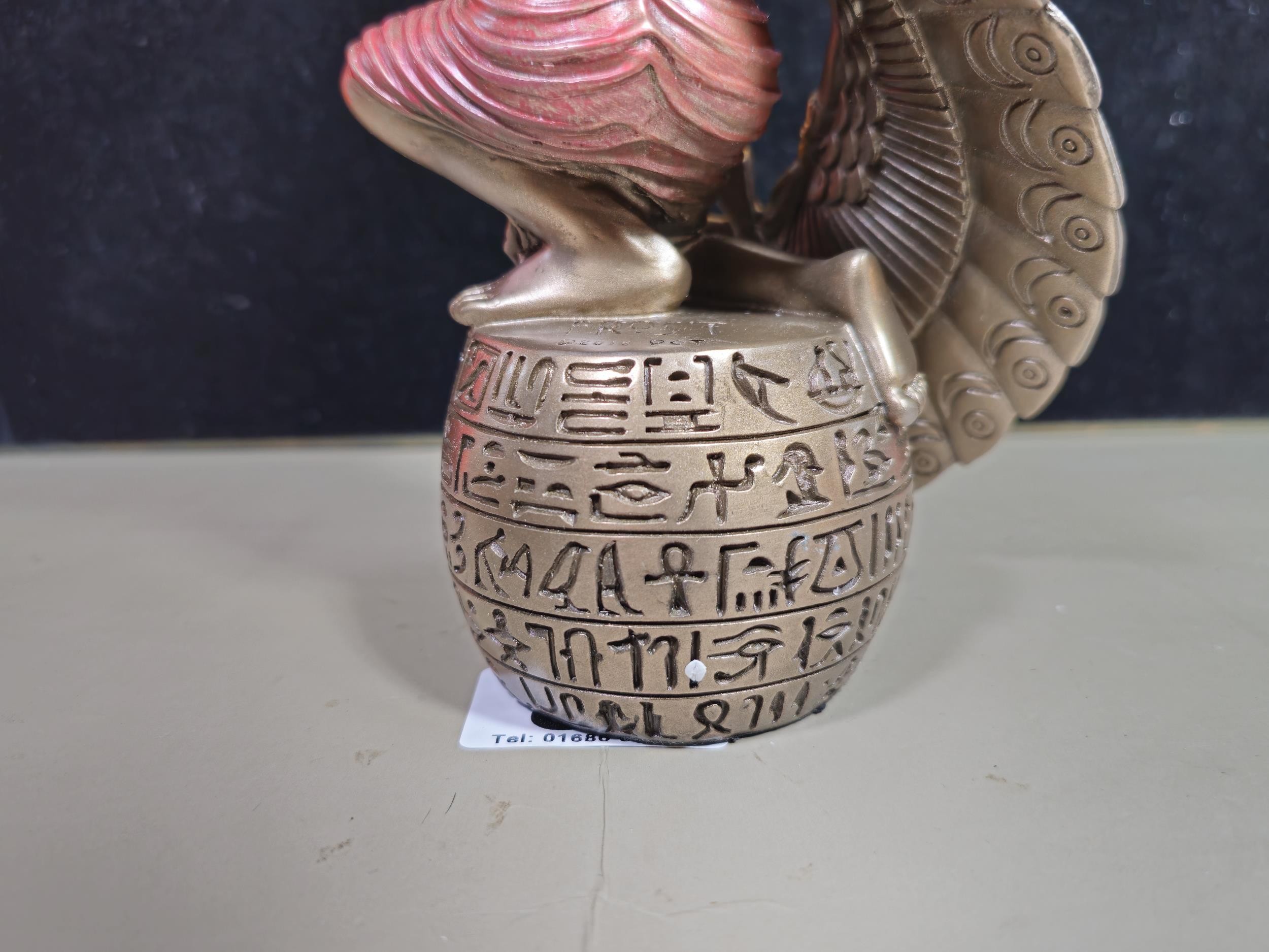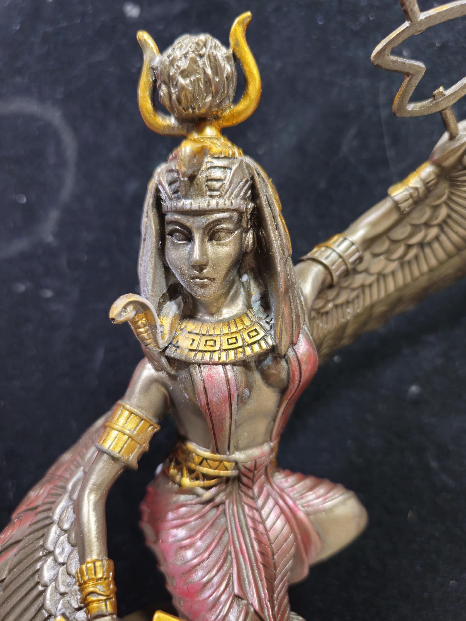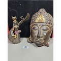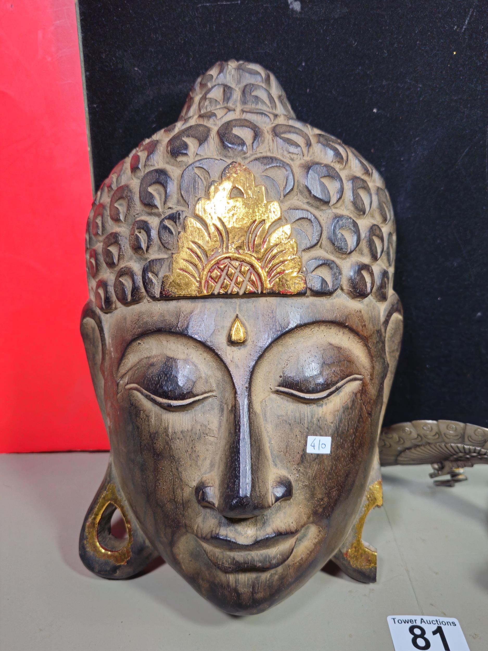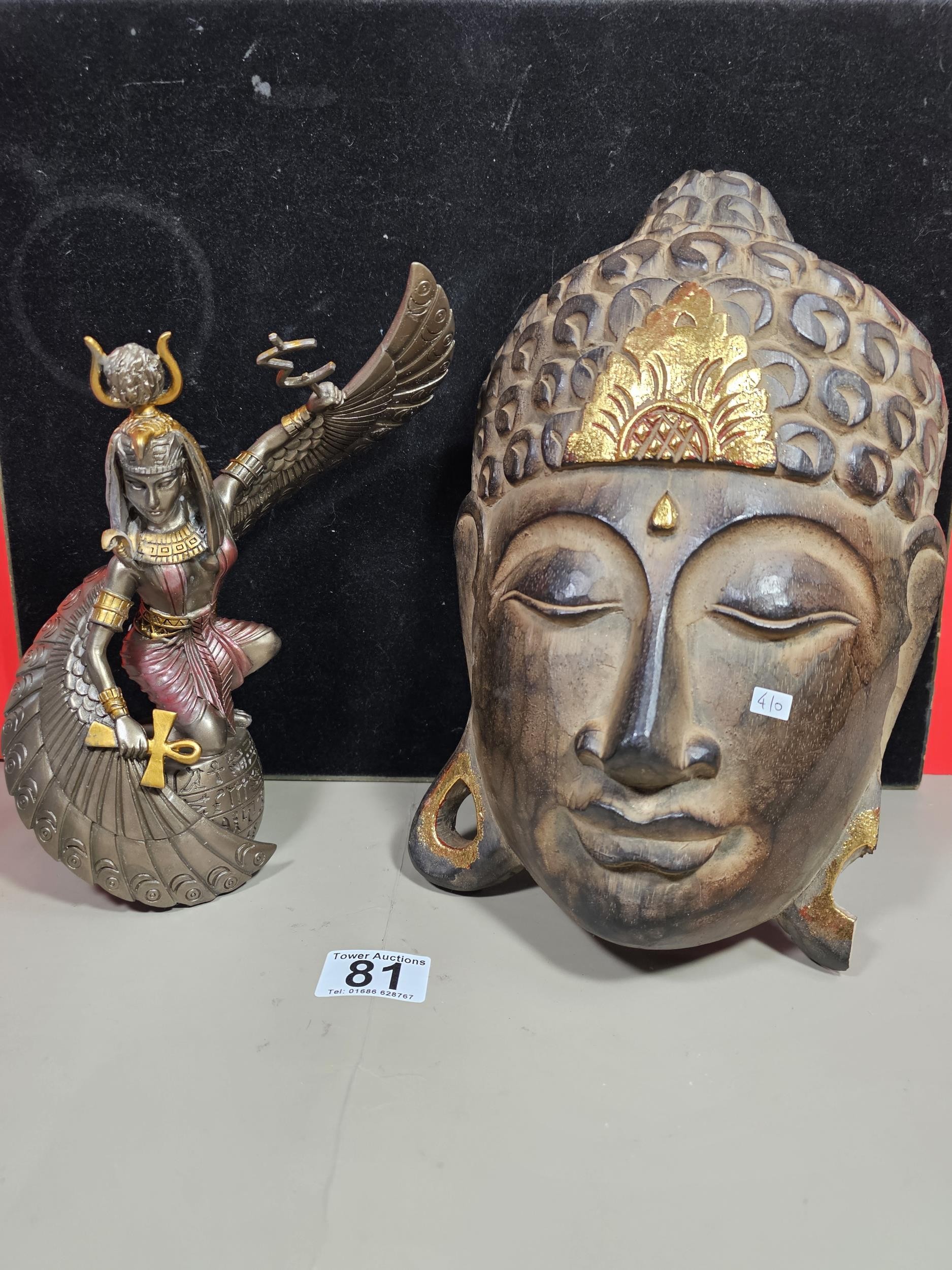 A good quality wooden wall hanging in the form of a Buddha's head along with a resin Egyptian Goddess Isis Ra figurine holding an Ankh. Both are in good order largest piece has a height of 31cm high and 23cm wide