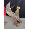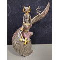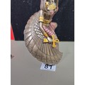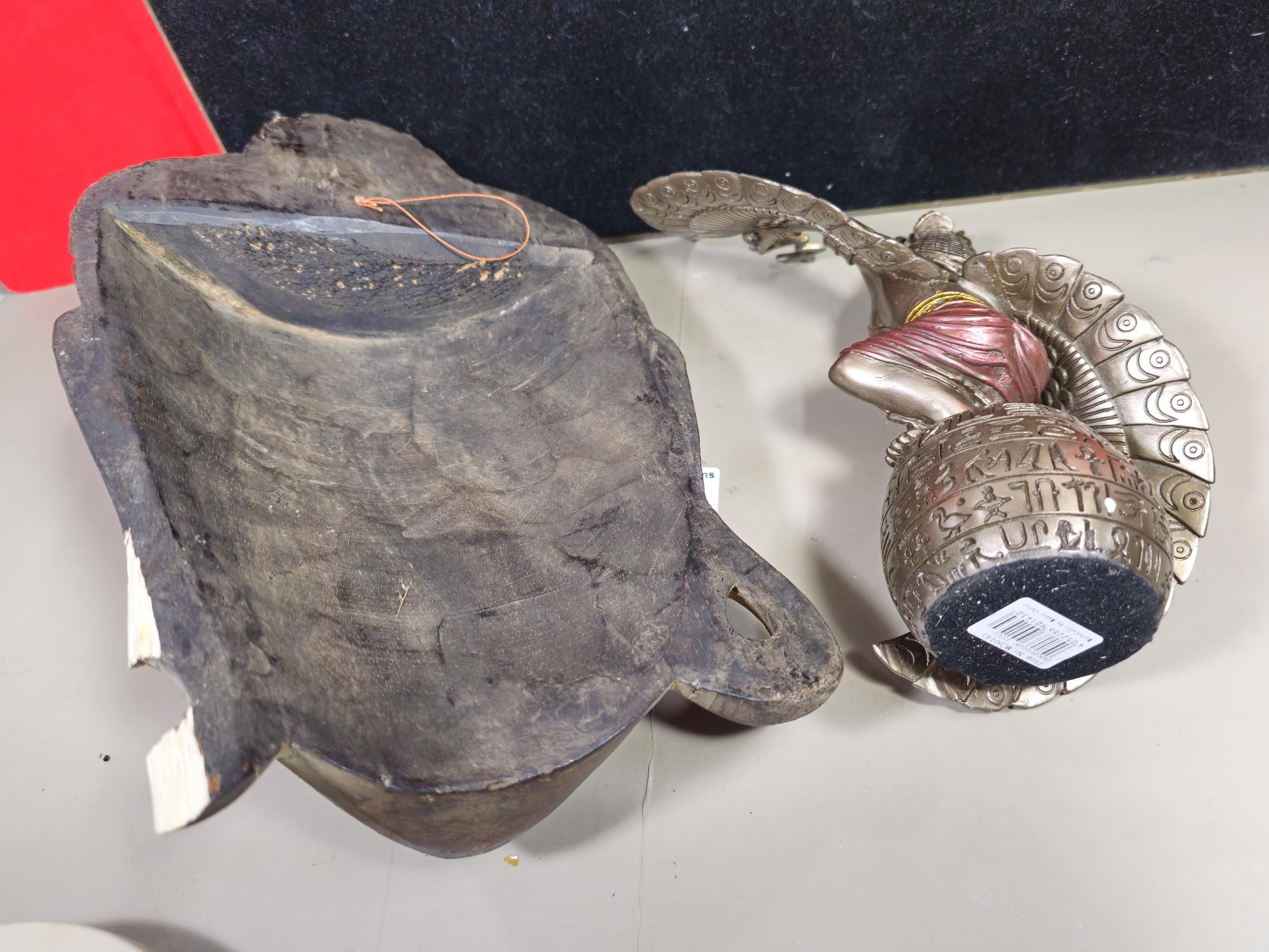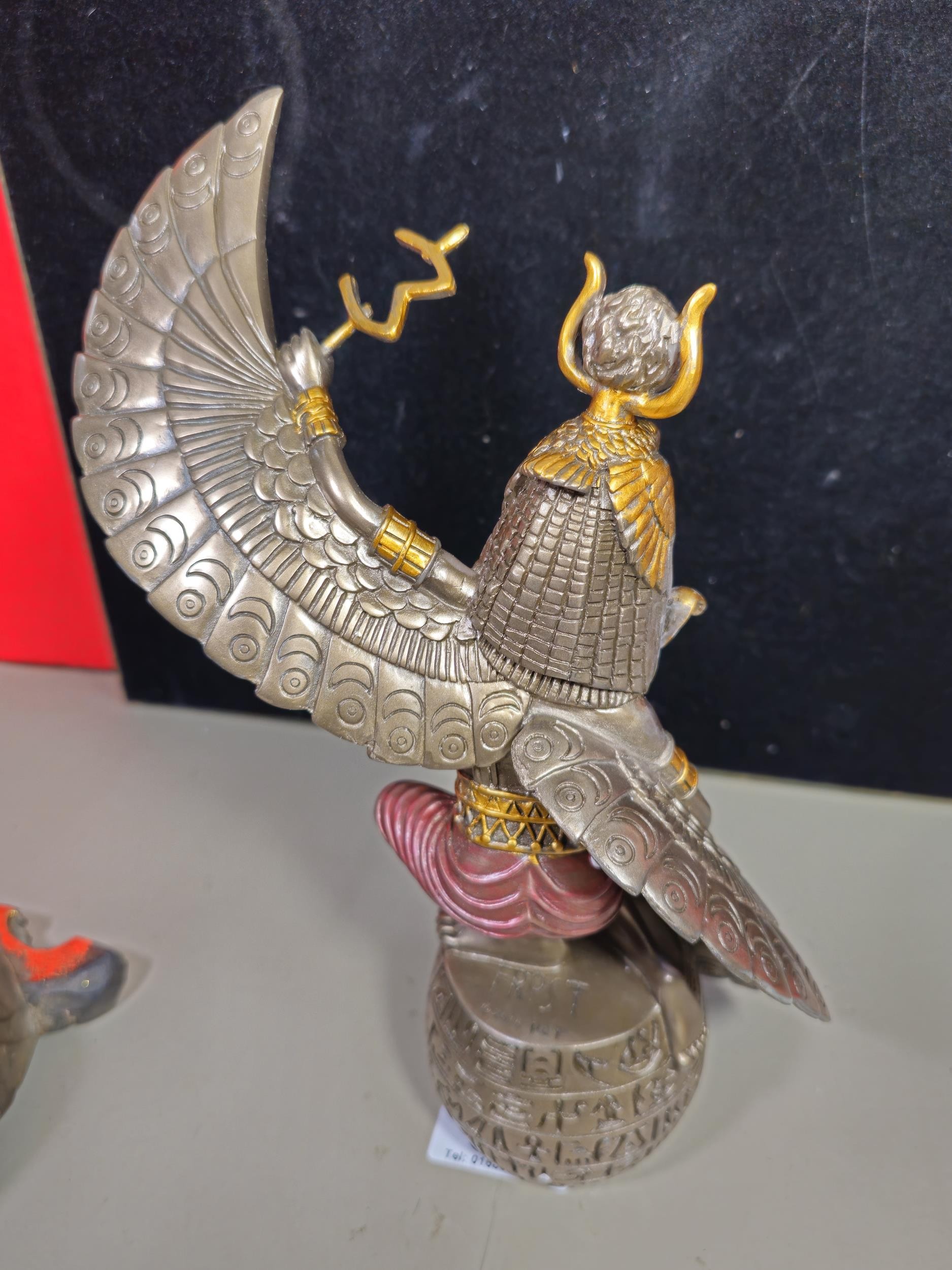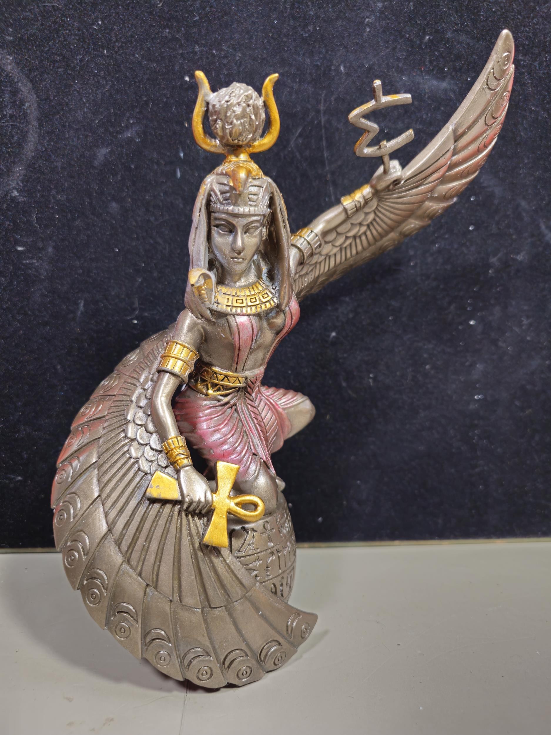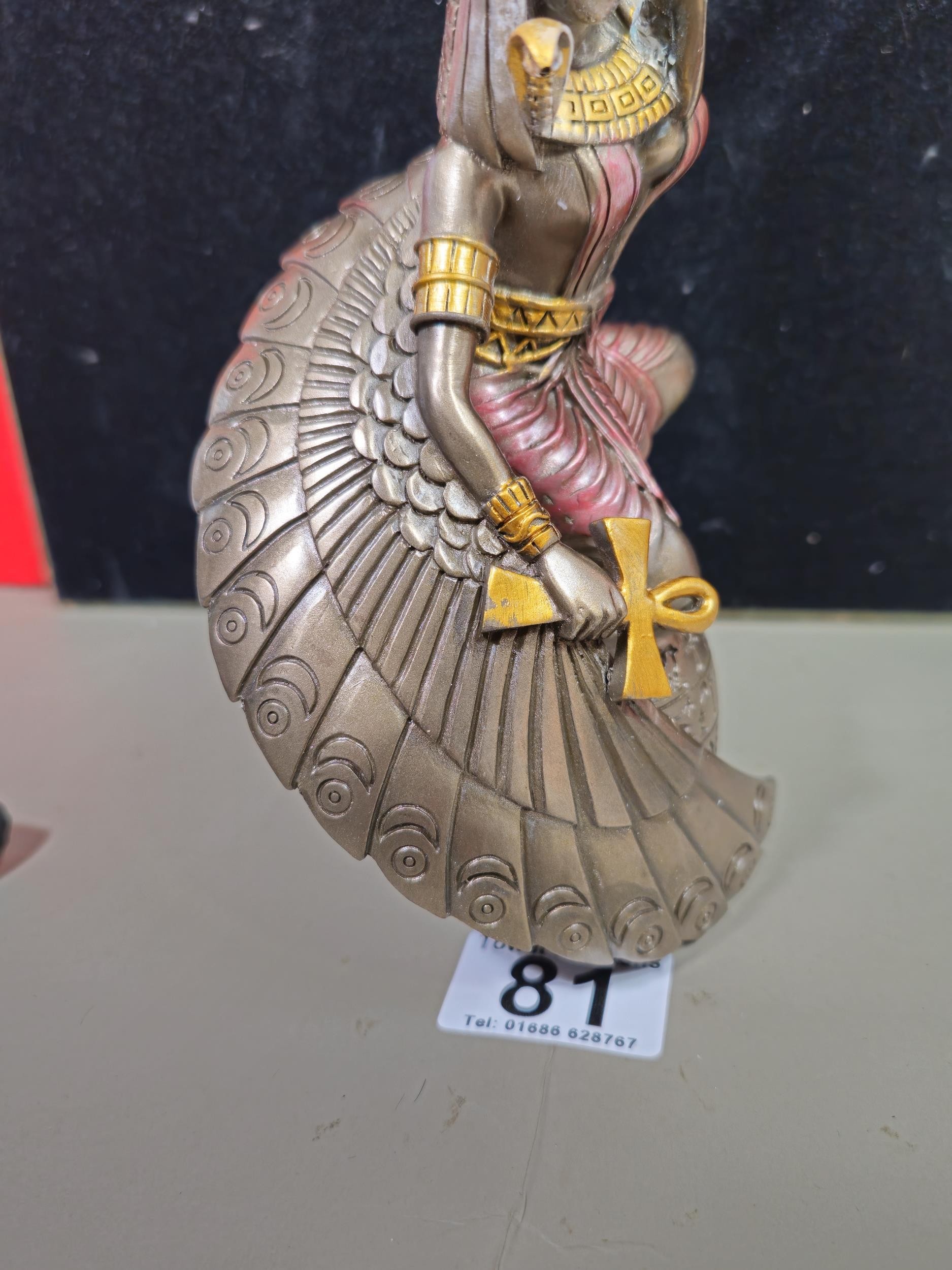 A good quality wooden wall hanging in the form of a Buddha's head along with a resin Egyptian Goddess Isis Ra figurine holding an Ankh. Both are in good order largest piece has a height of 31cm high and 23cm wide