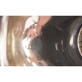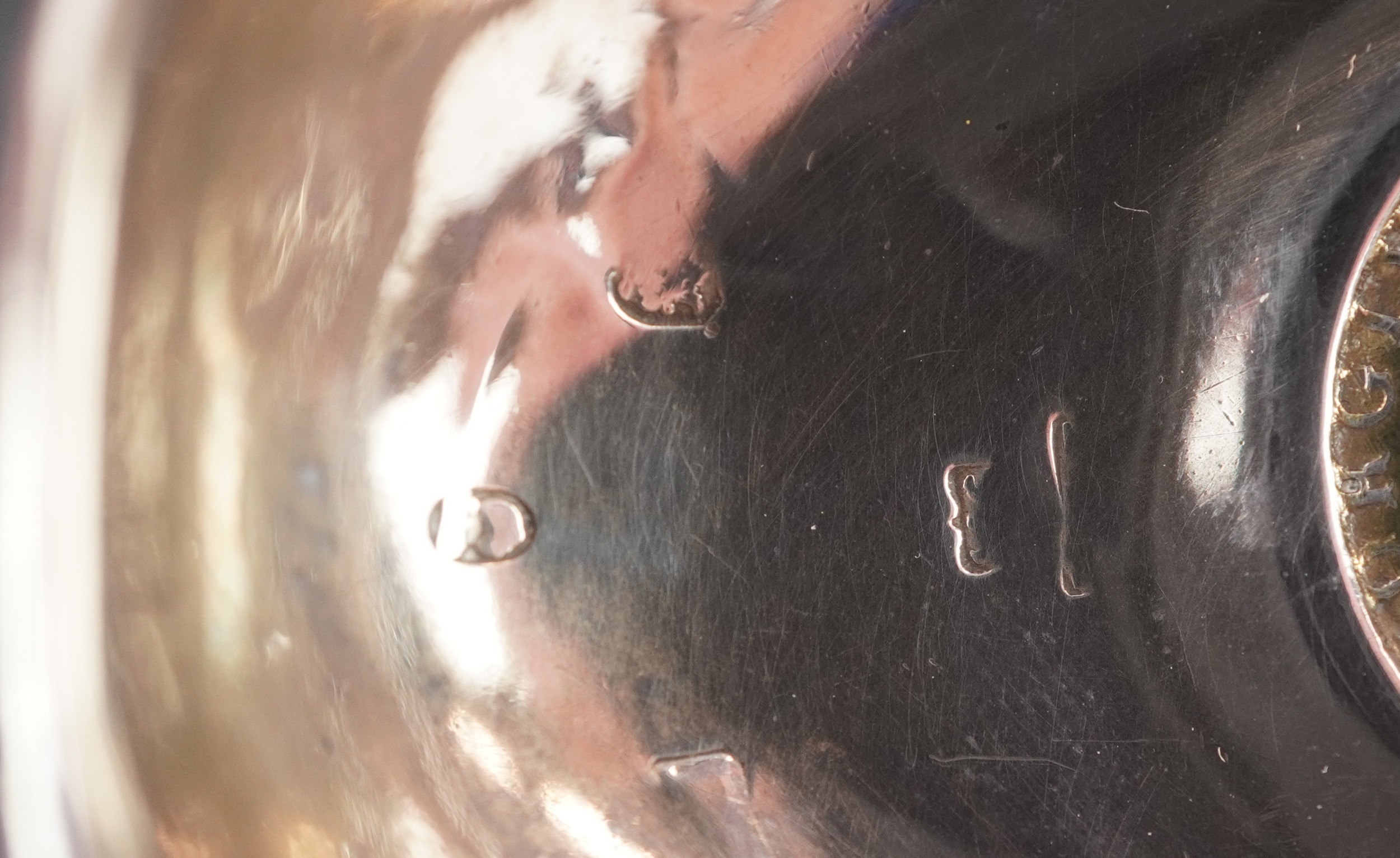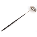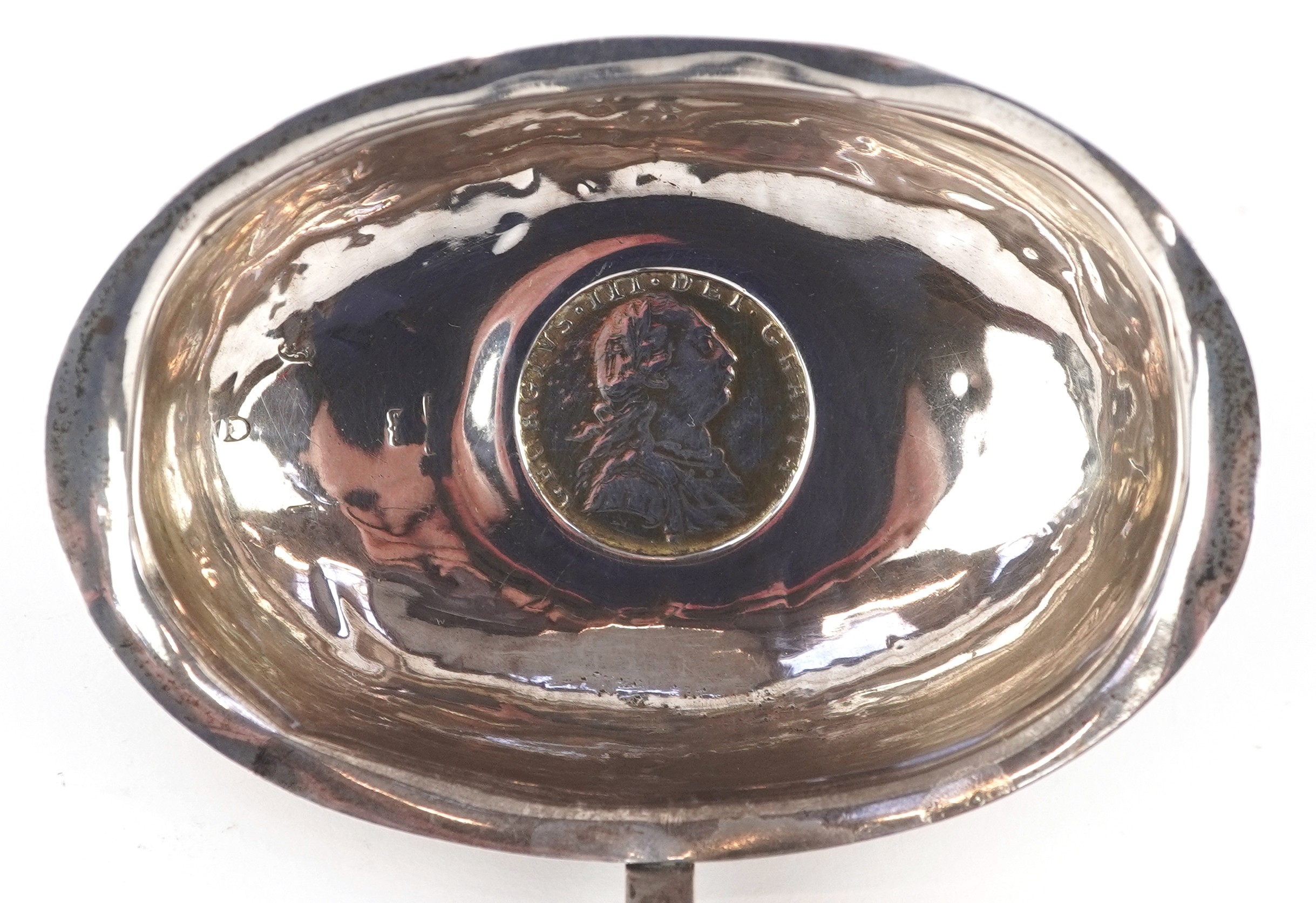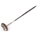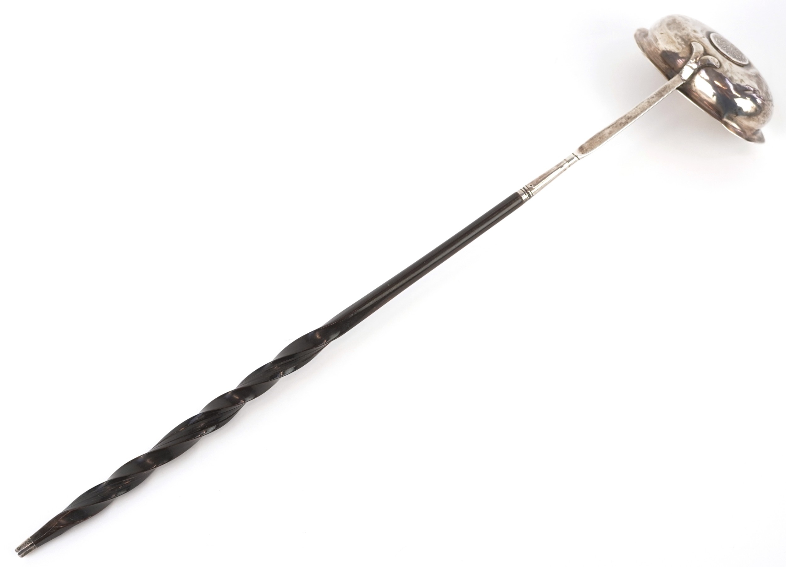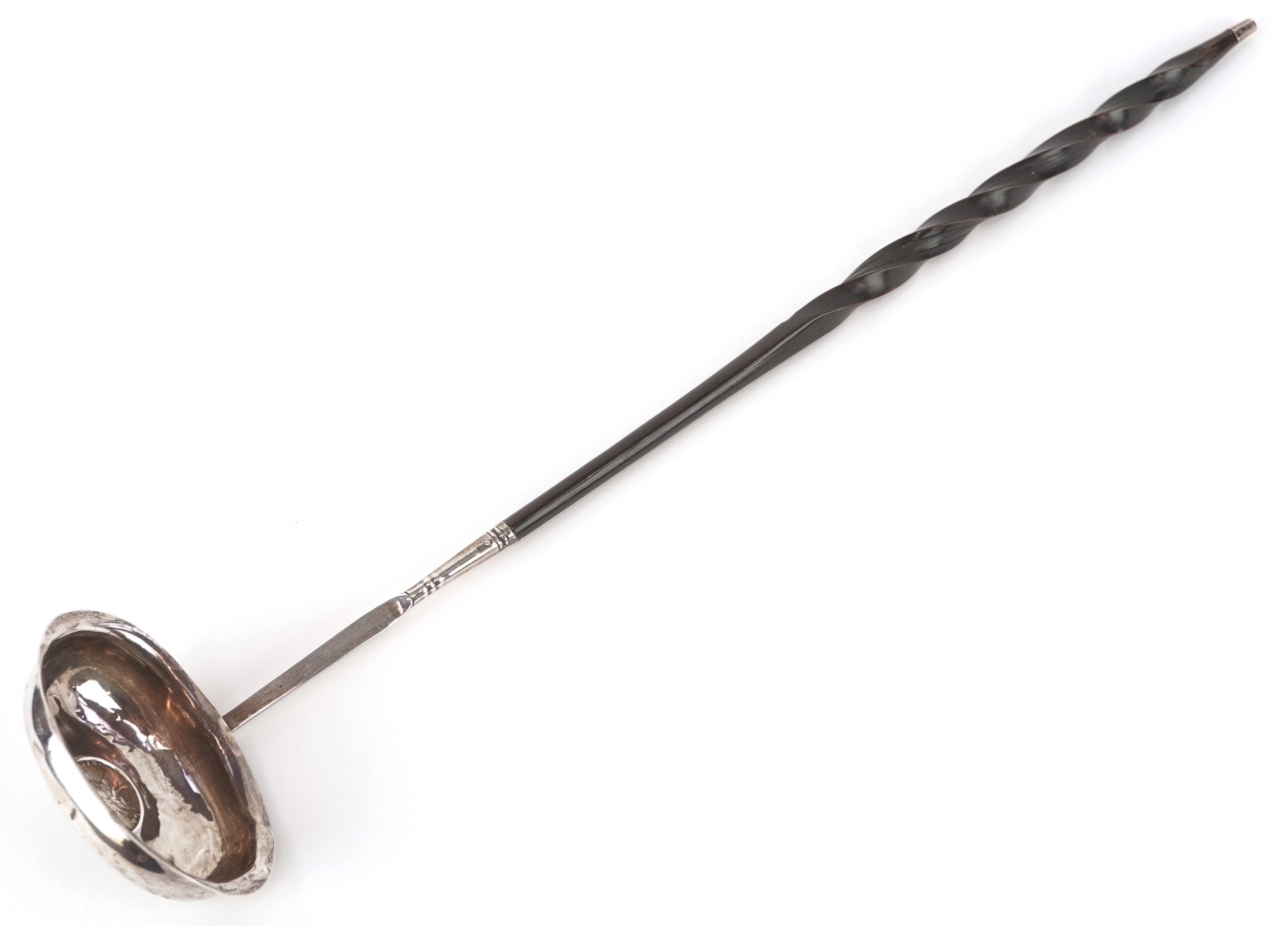 A George III silver ladle with twisted horn handle, the bowl set with a 1787 shilling, indistinct hallmarks, 38cm in length, 42.0g.