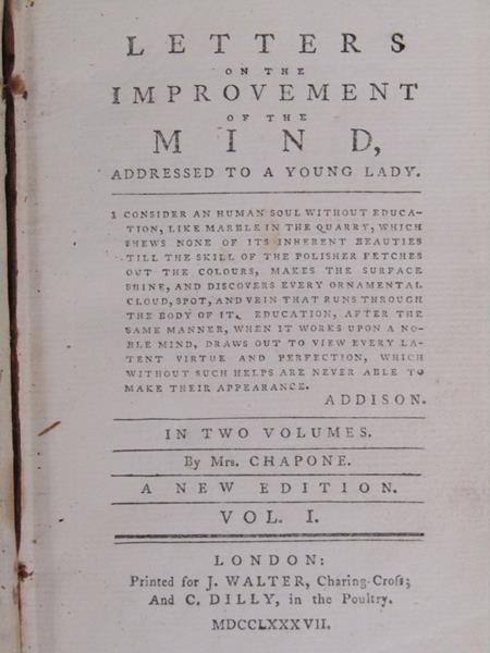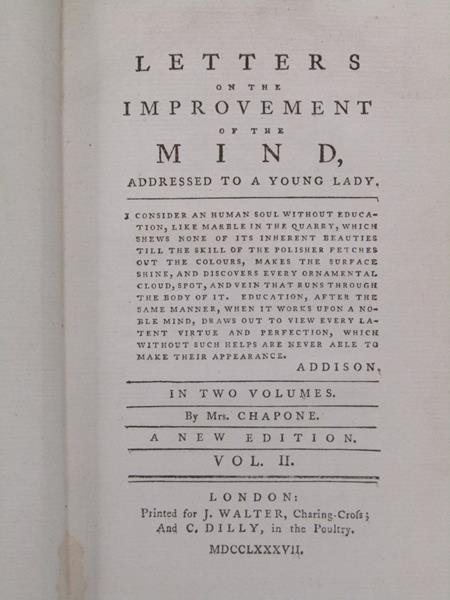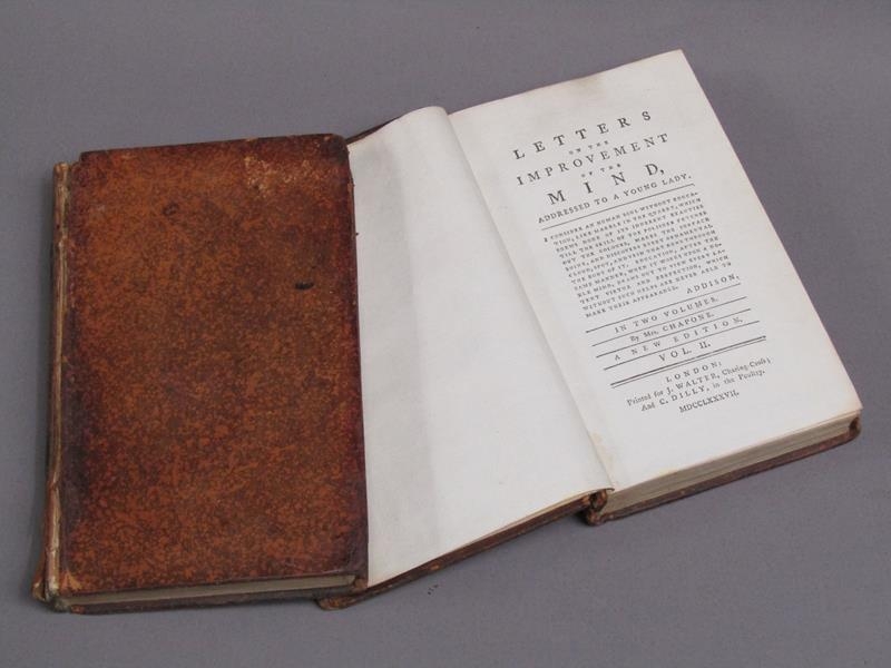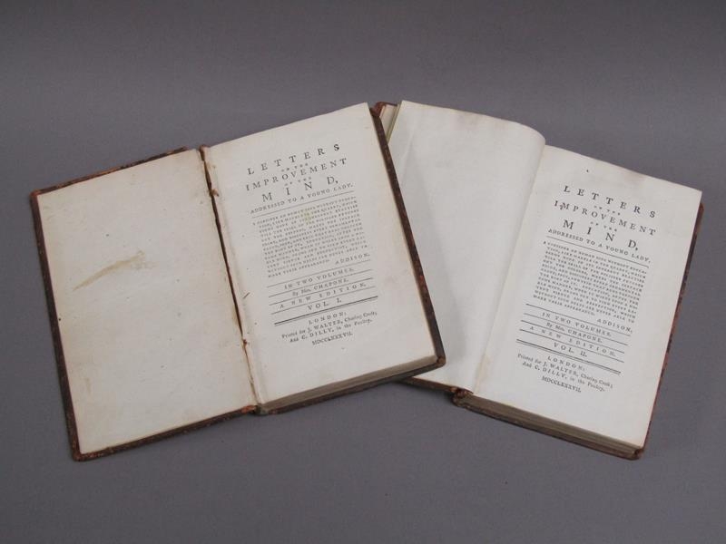Two books - Letters on the improvement of the mind addressed to a young lady, being Volumes I & II by Mrs Chapone, 1787. - Some wear, spines require attention.