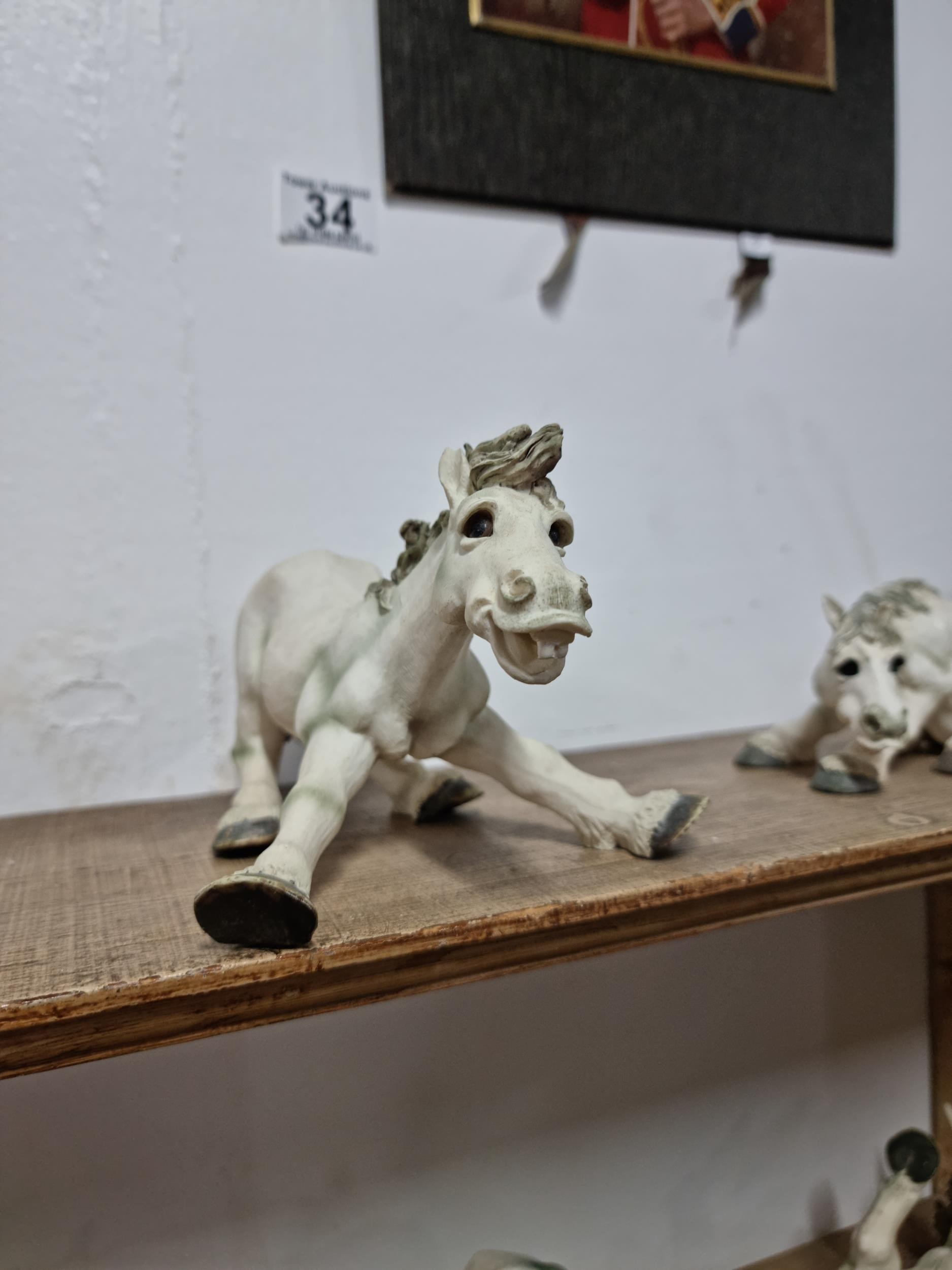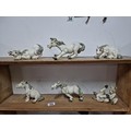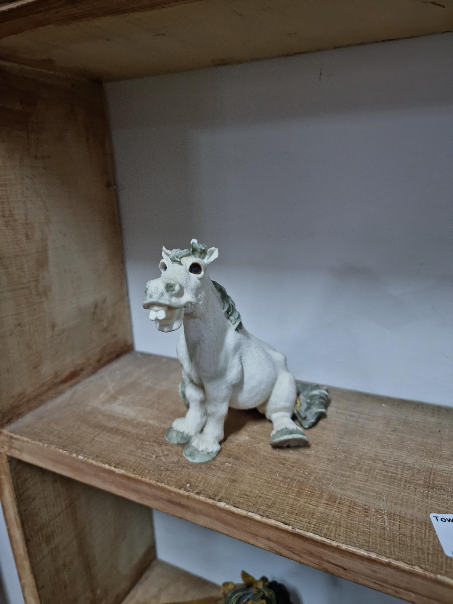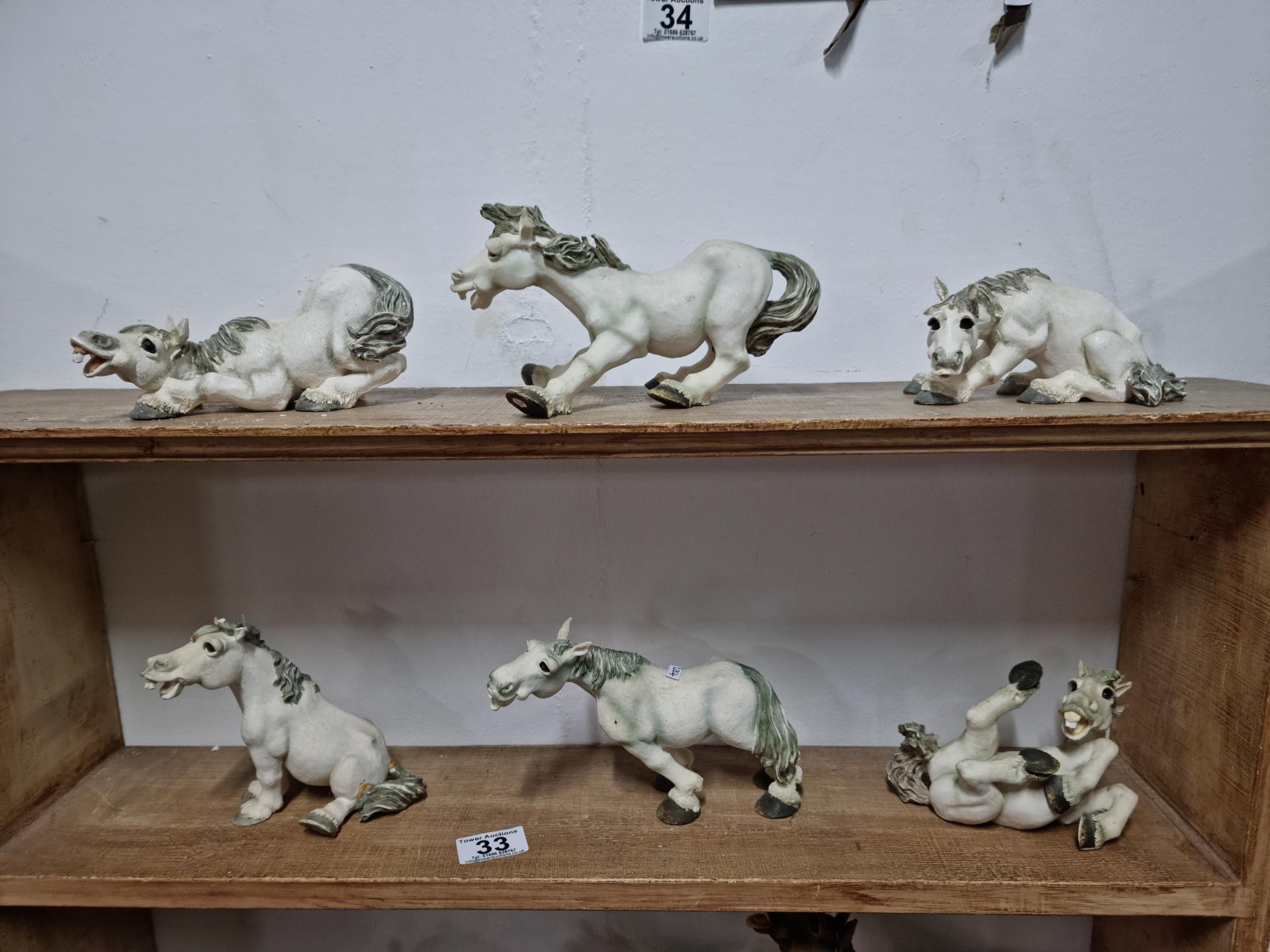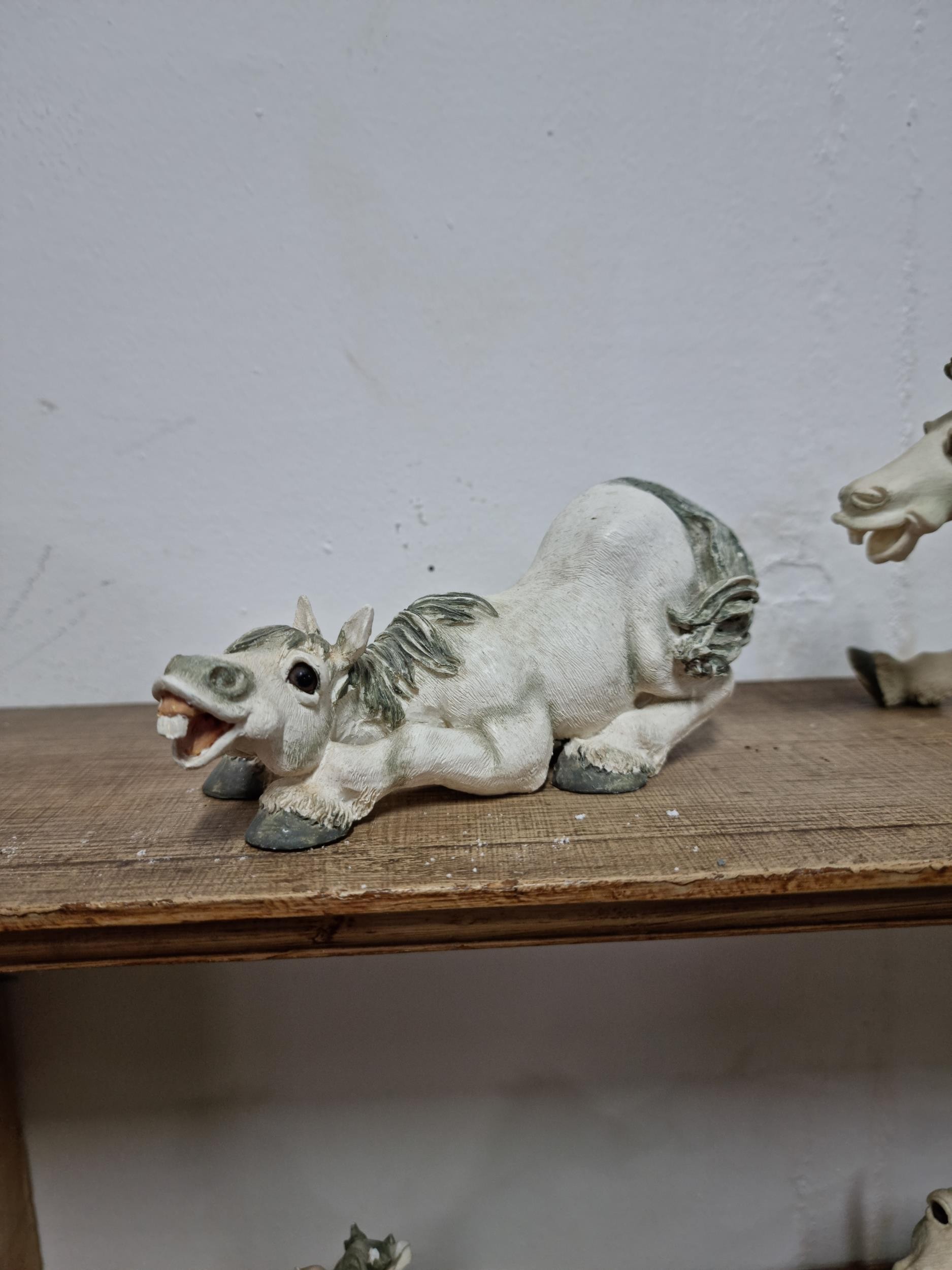 Quantity of 6x white Sealmark comical horse figures in resin in various different poses, all in good order and stamped Sealmark, largest figure measures 12cm high and 20cm long