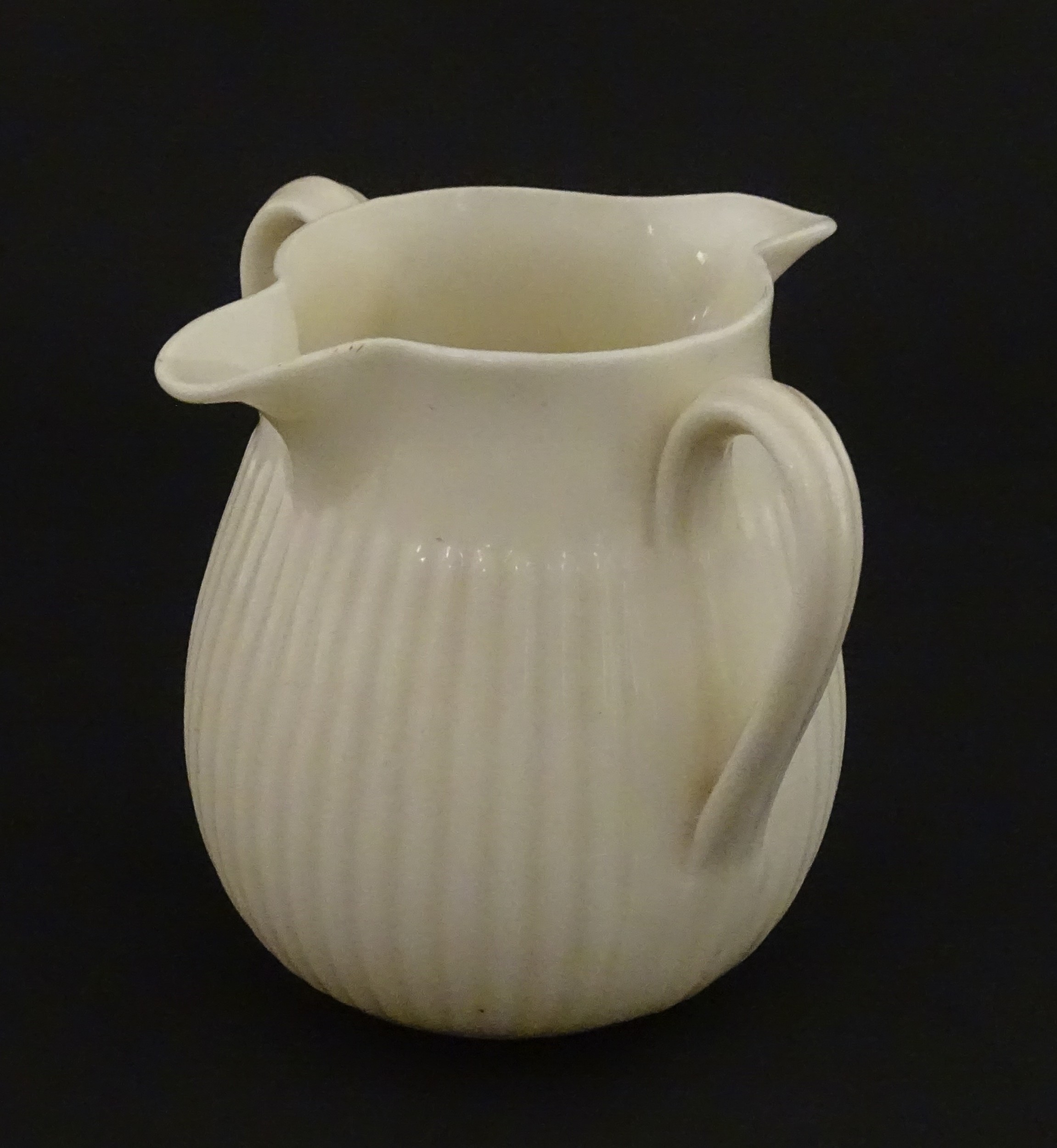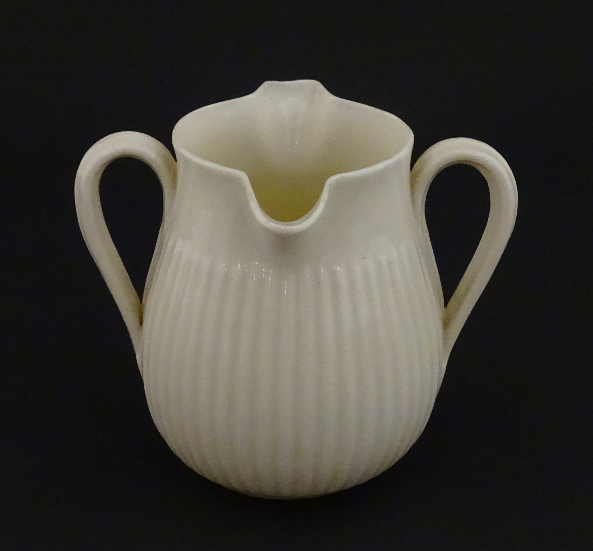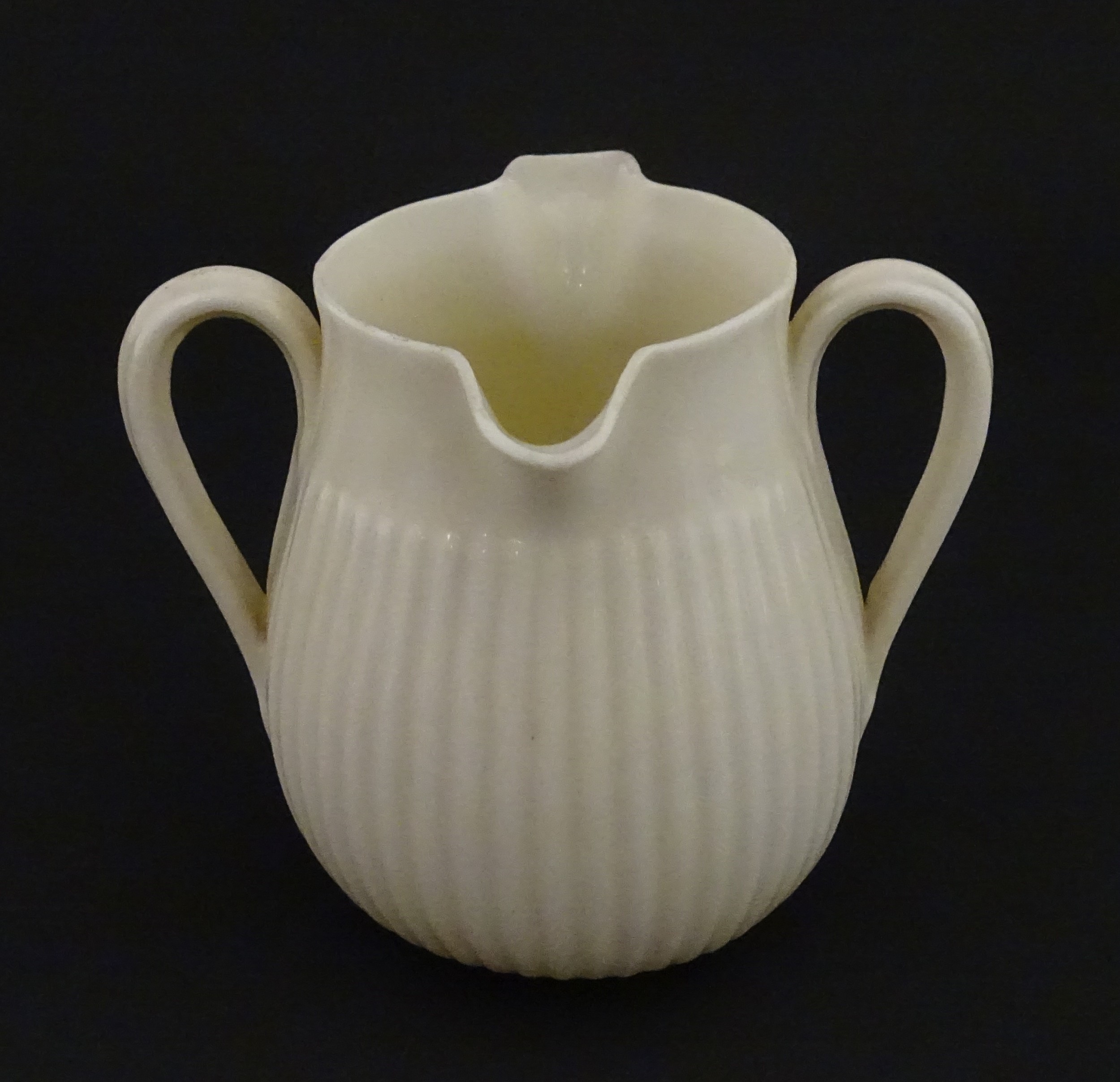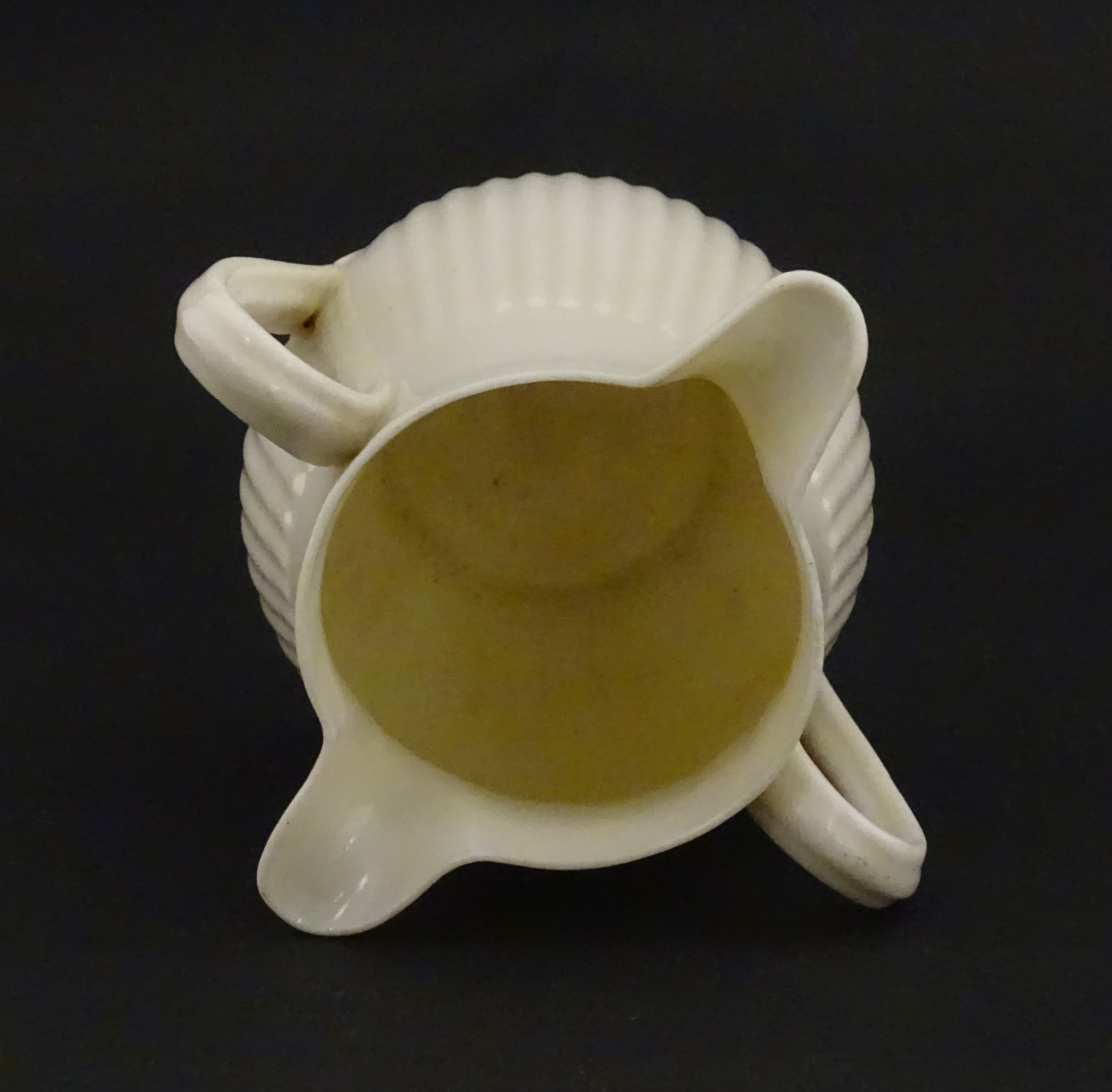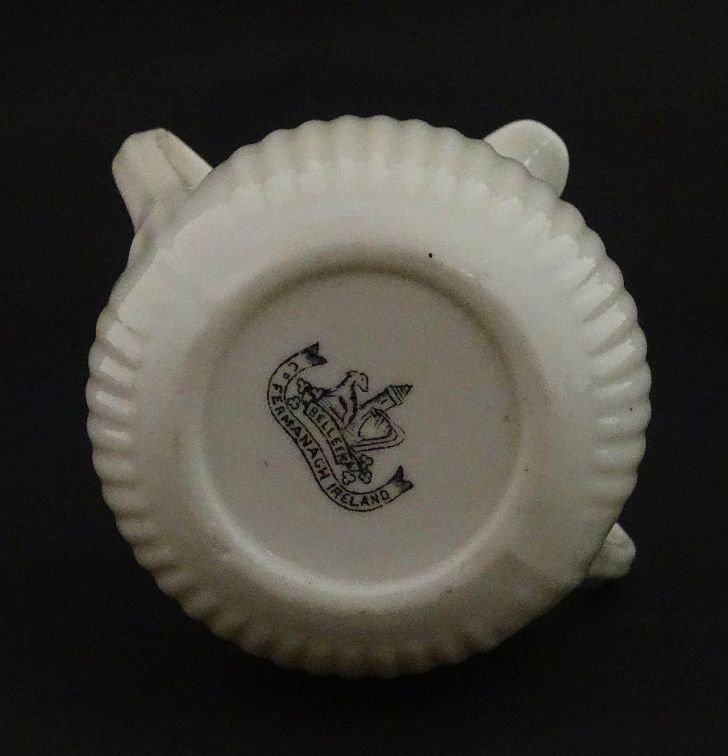 A Belleek Lifford pattern double spout cream jug with twin handles. Marked with Second Period mark under. Approx. 3 1/4" high