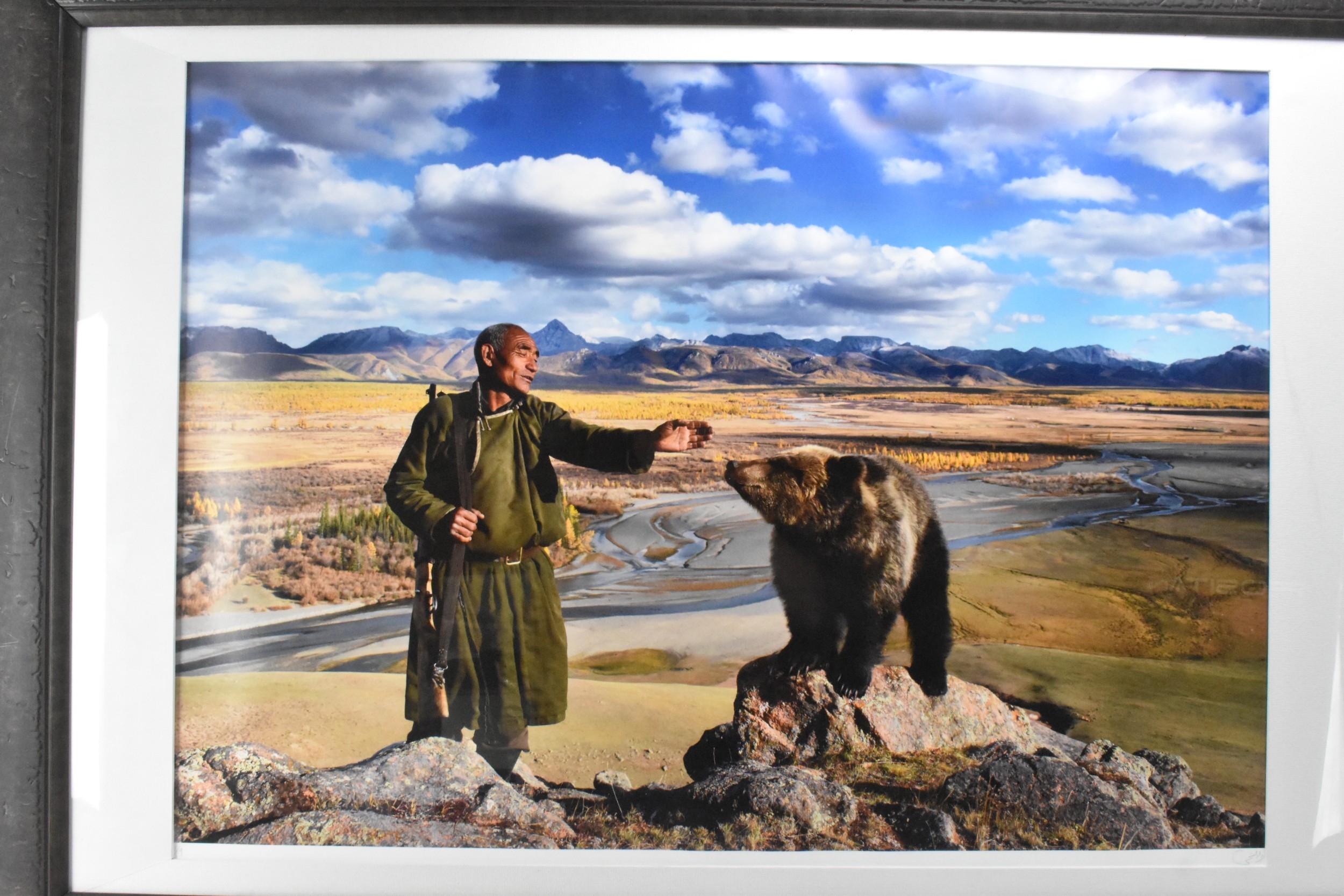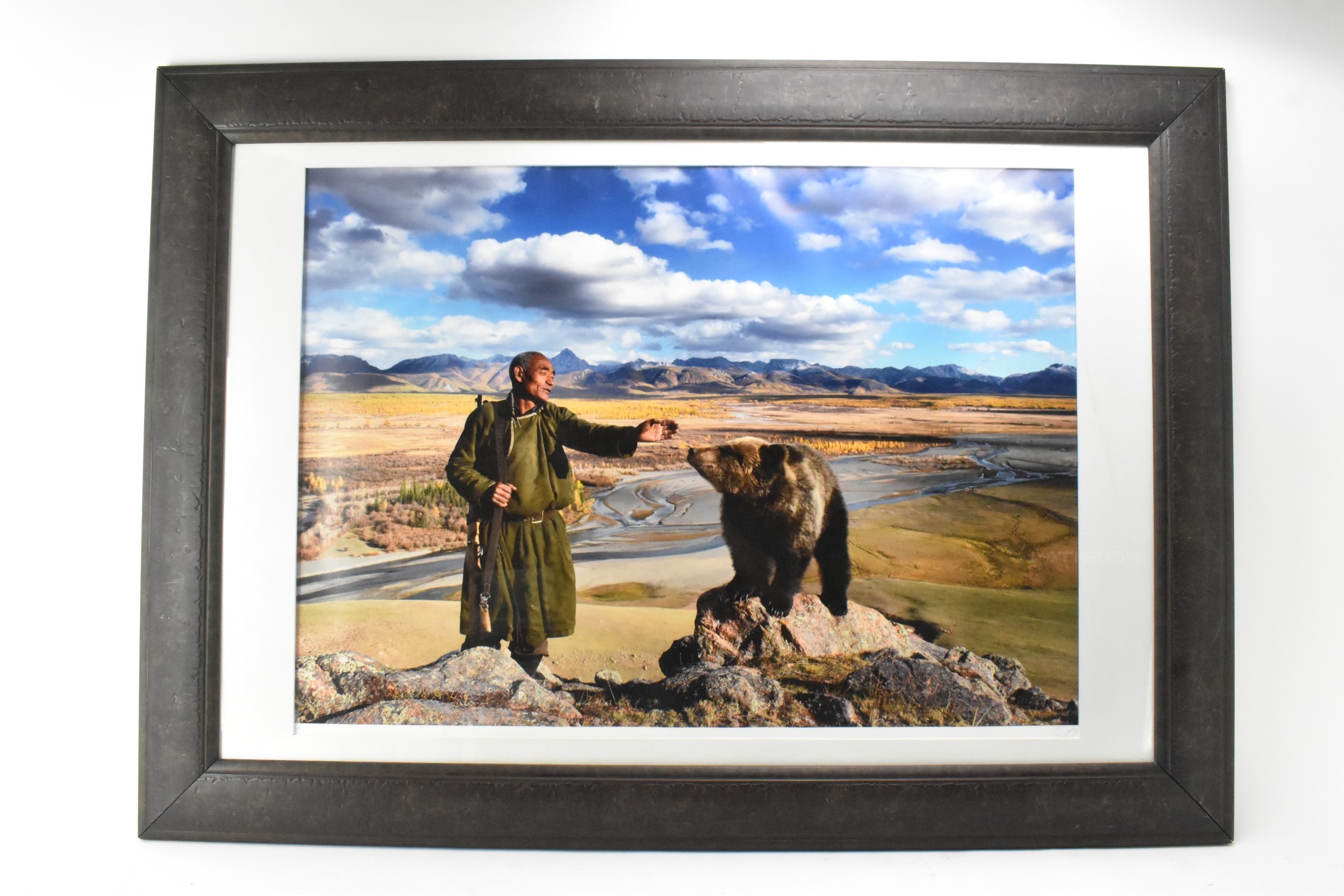 Hamid Sardar-Afkhami (B.1966) A large format limited edition photograph depicting a man with a bear, numbered 3/9 and signed to the lower right corner, 99.5cm x 71cm, the frame 140.5cm x 100.5cm
