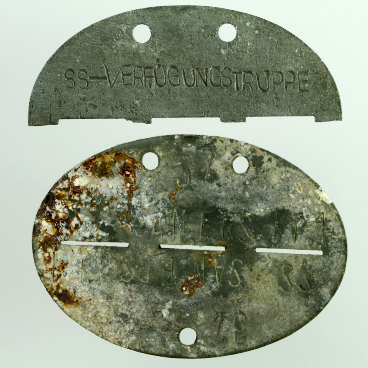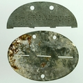German Nazi SS ID metal disc's, one whole, one half. SSUT + Medic. (2)
