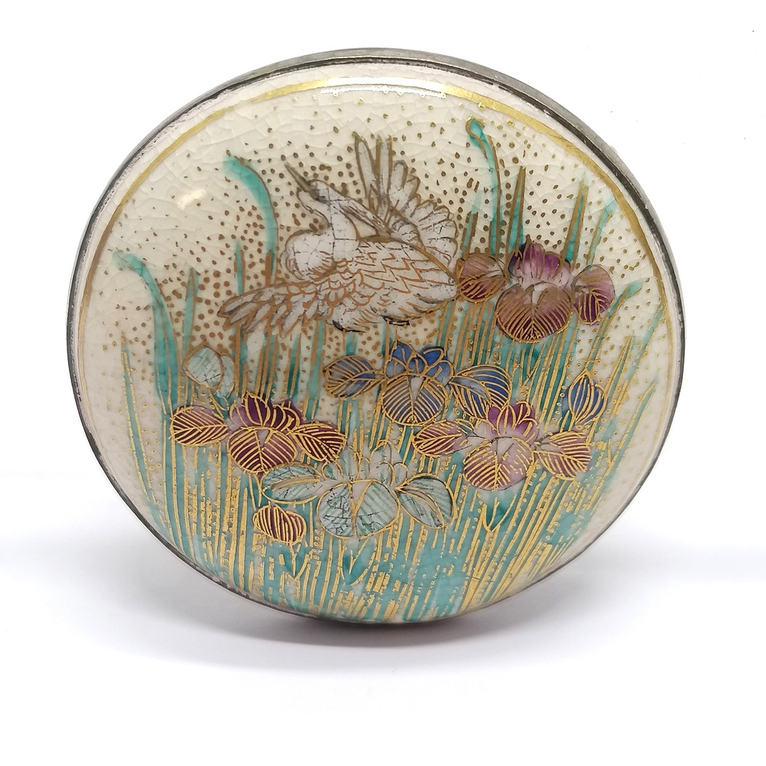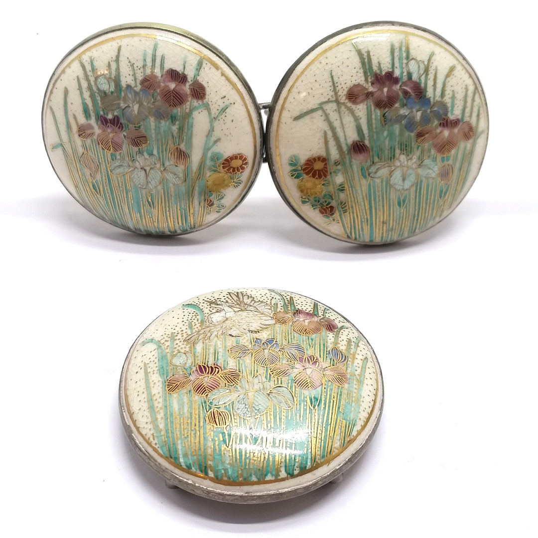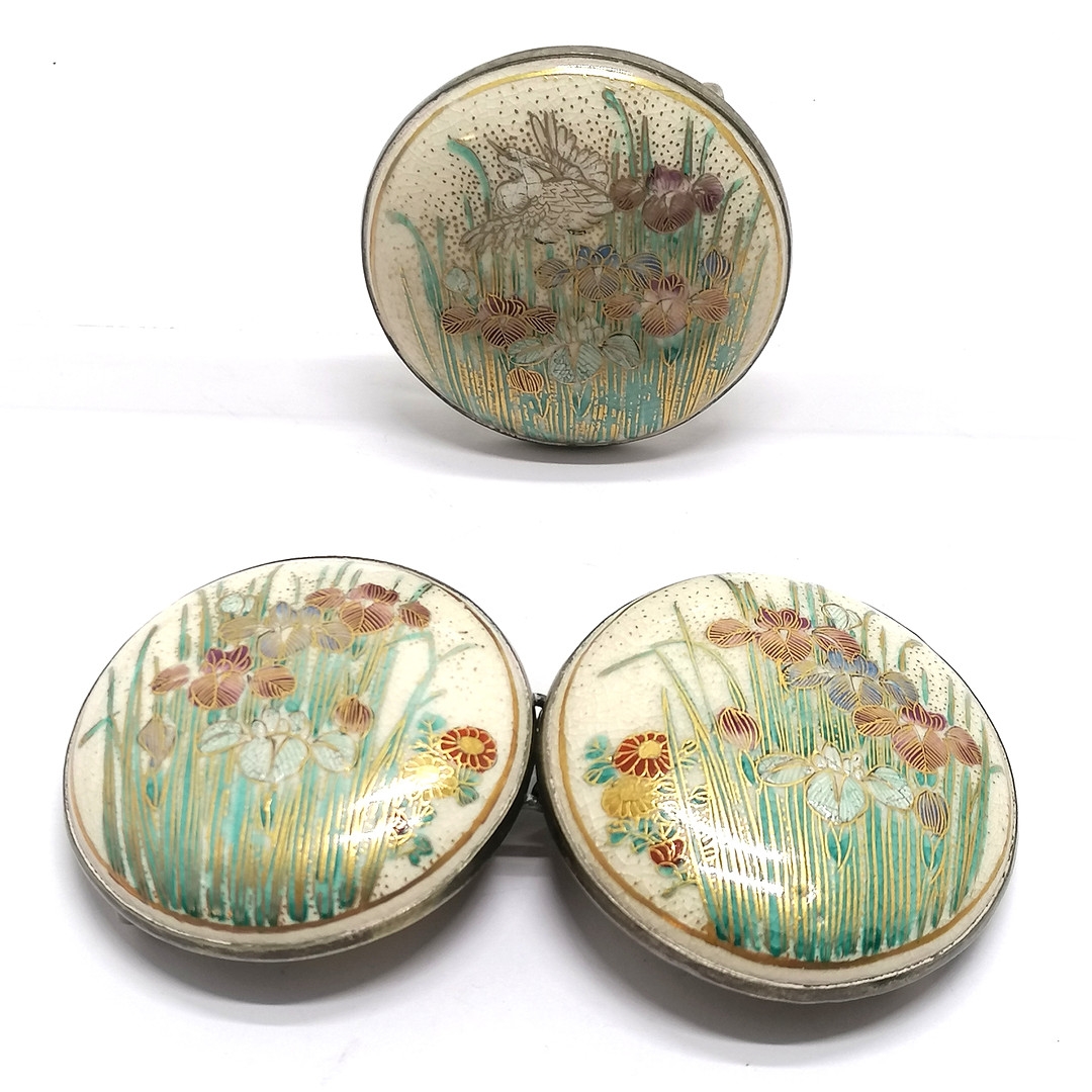 Antique Japanese satsuma belt buckle with floral hand painted detail t/w matching belt decoration (4.6cm diameter) with no obvious damage