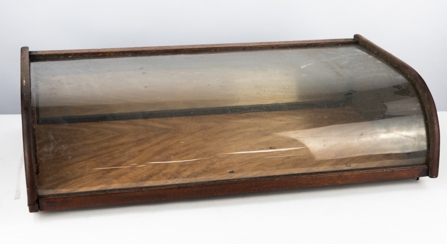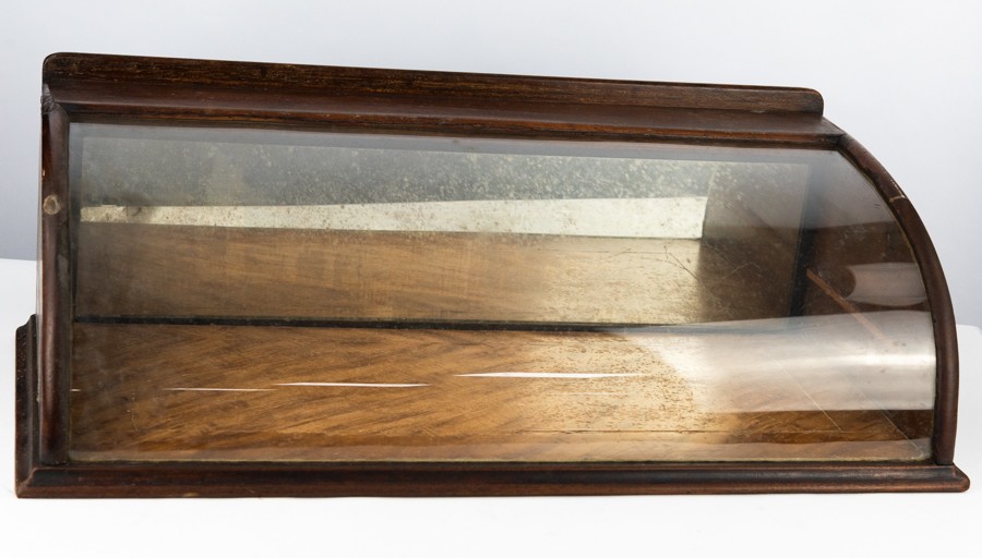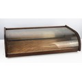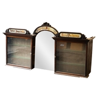 TWO SIMILAR LATE VICTORIAN CHEMIST SHOP DISPLAY CASES, enclosed with rounded front glass lift up tops, 31" (78.5cm) and 30" (76.5cm) long respectively
