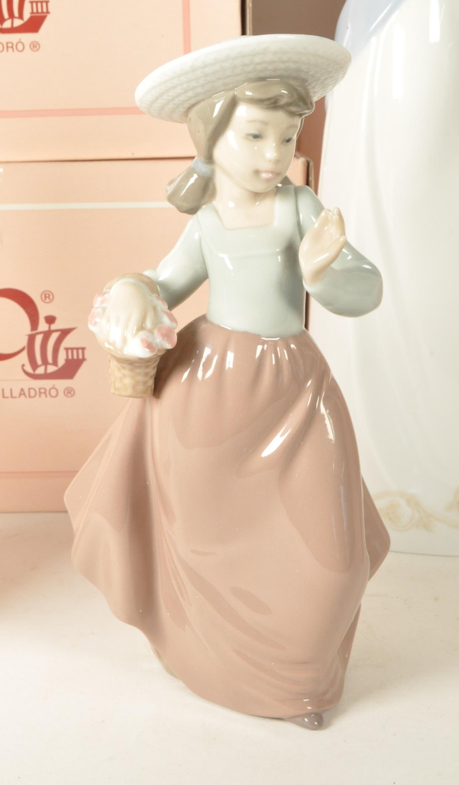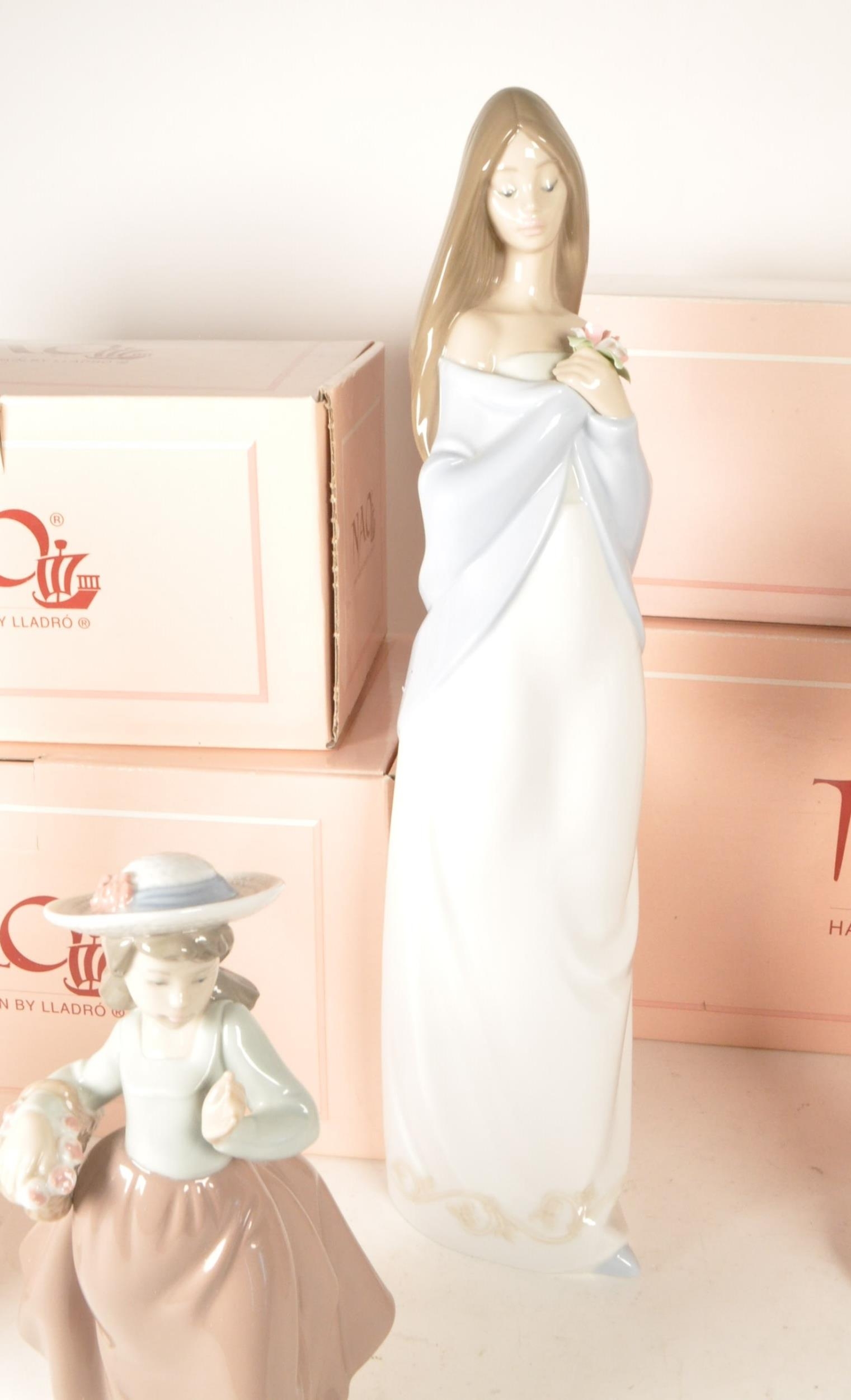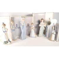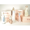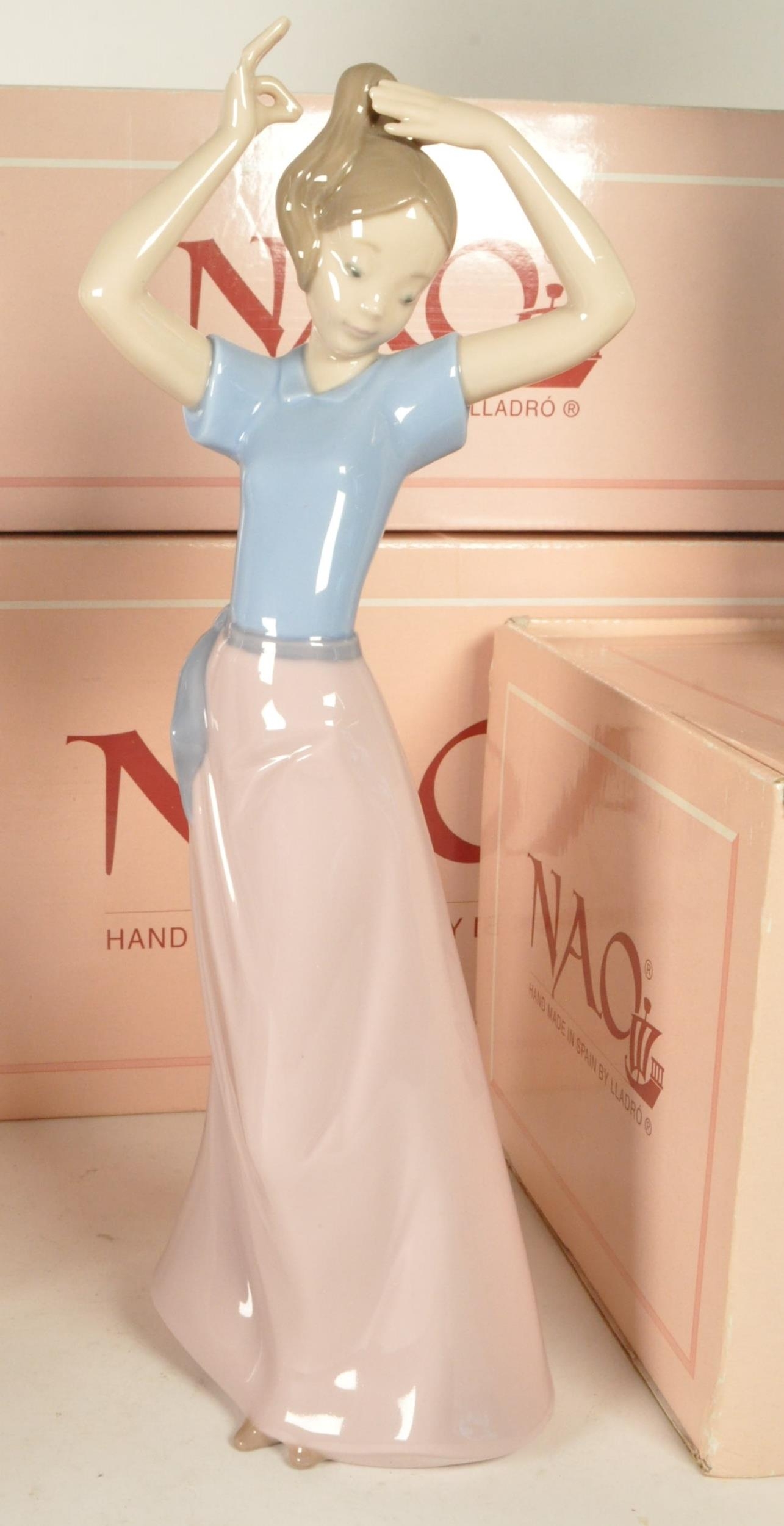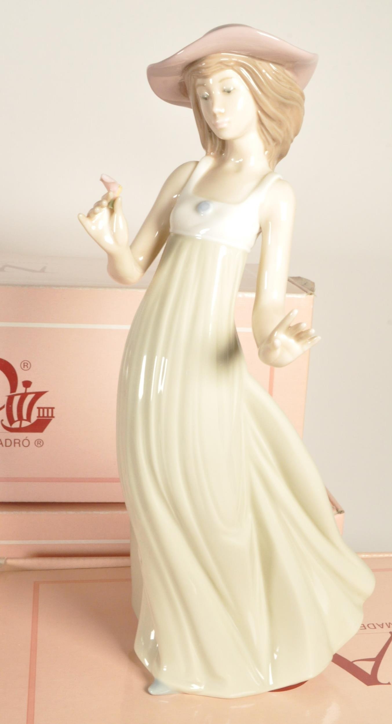 Nao - Lladro - Collection of five late 20th century porcelain figures. Comprised of 1991 Gentle Breeze, a 1988 Girl with a Flower Basket, 1987 Nina Dulce, a 1994 Fixing my Ponytail, and 1999 Memories. All housed within their original boxes. Largest measuring approx 16cm x 44cm x 17cm, including the box.