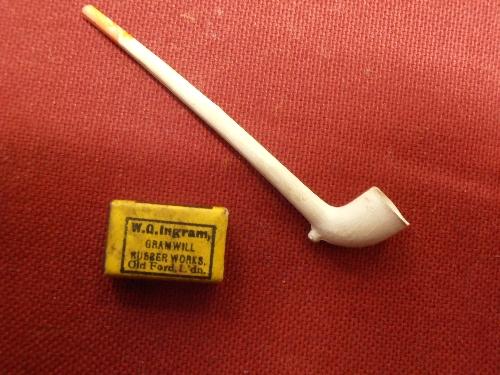 MINIATURE CLAY PIPE AND SMALL TIN MATCHBOX WITH 3 MATCHES INSIDE