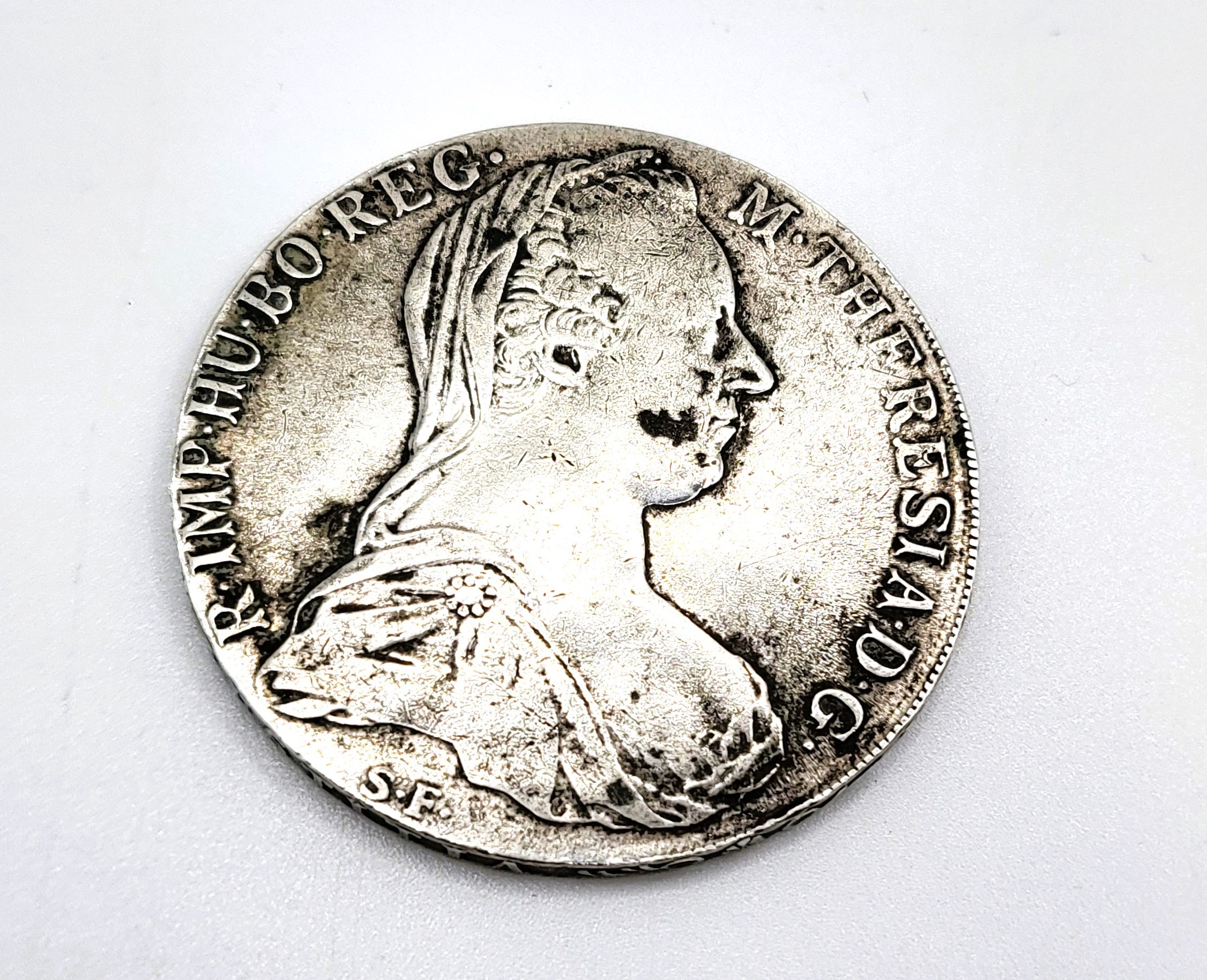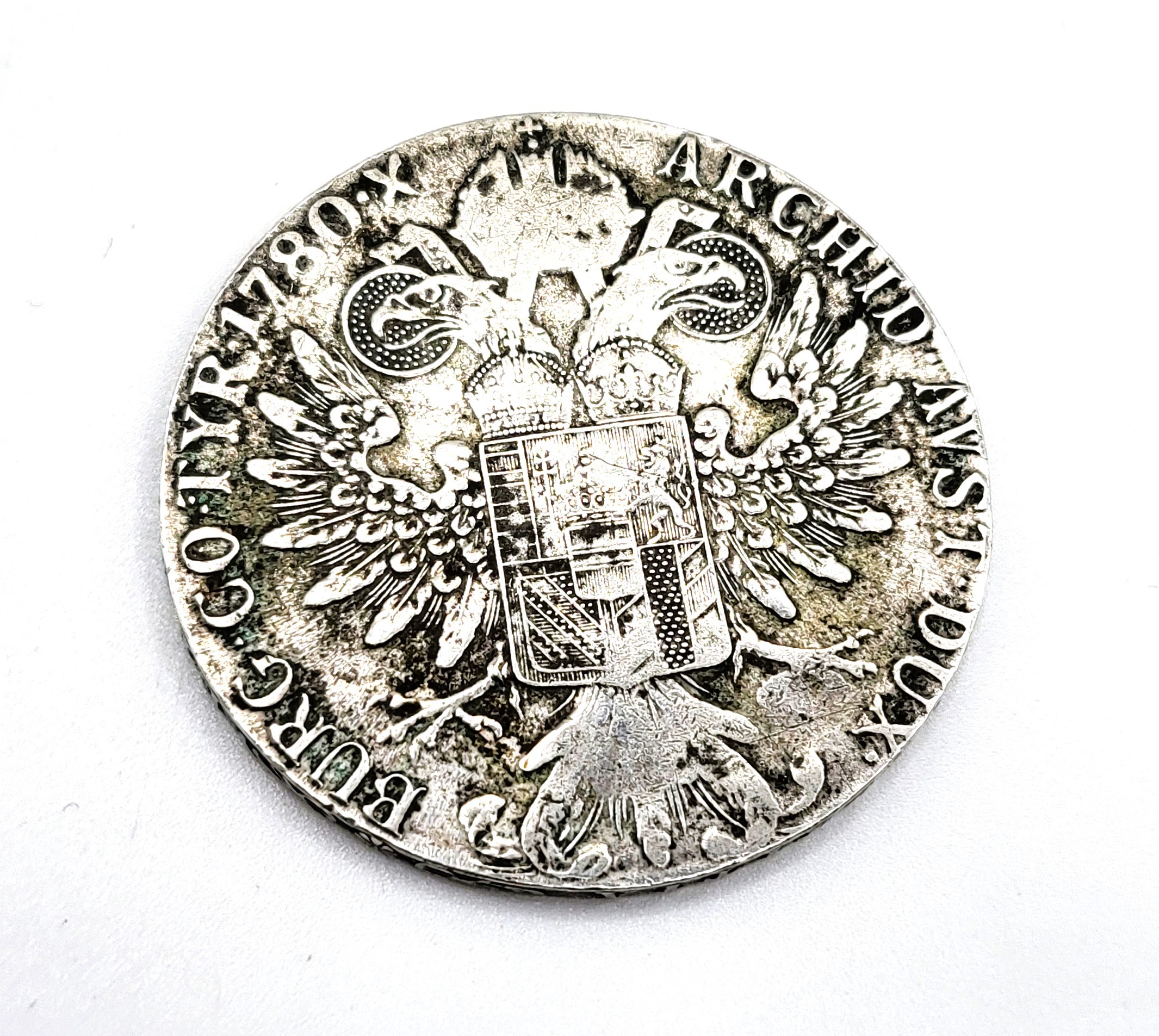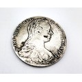 A Marie Theresa coin, on the reverse show the double-headed eagle of the Austrian Empire date 1780, and on the obverse a profile of Marie Theresa facing right. 27.9gms. In a plastic coin case.