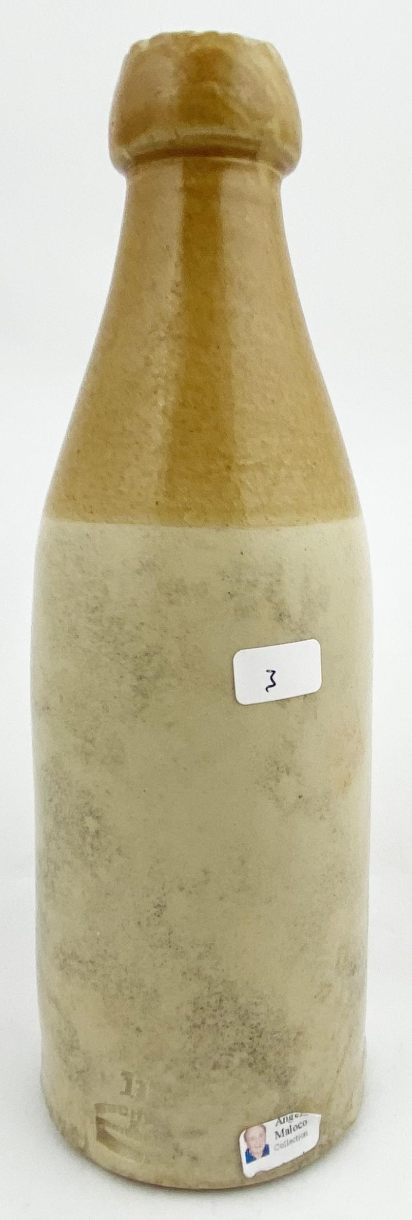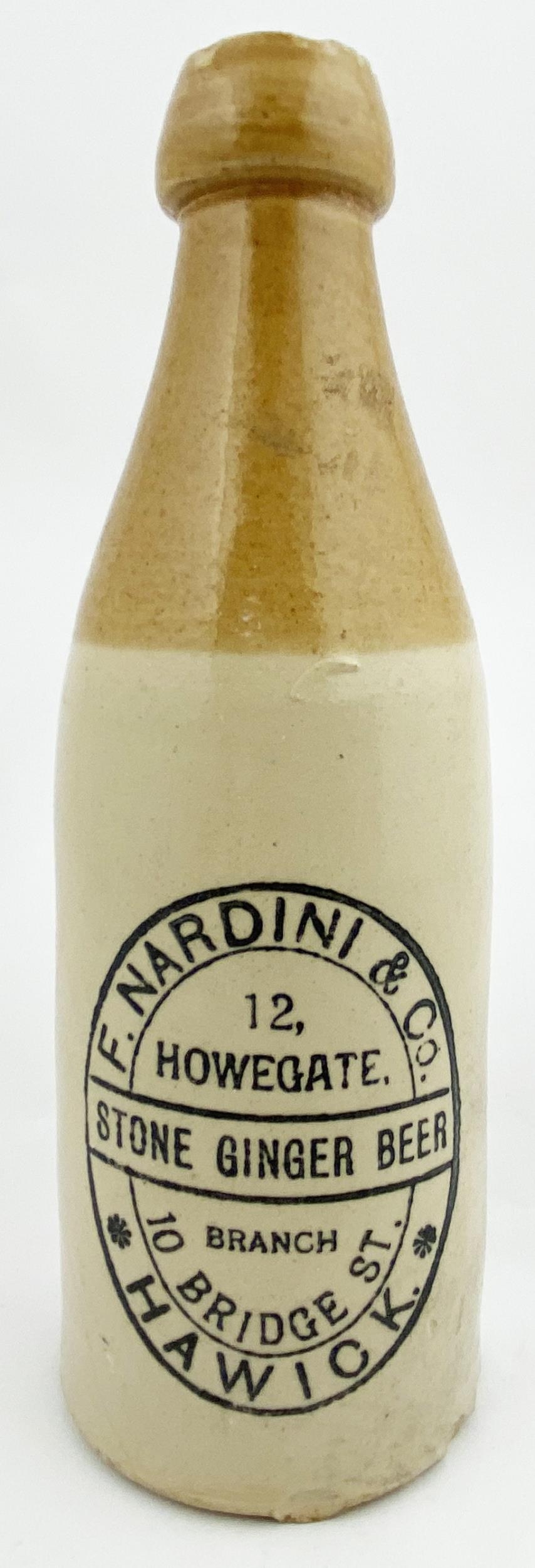 HAWICK GINGER BEER BOTTLE. 8.6ins tall, ch., t.t., screw lip (nibbled all round). F NARDINI & CO/ 12 HOWGATE.... 10 BRIDGE ST. Buchan p.m. Despite the damaged lip another fair, Italian named, scarcity. Angelo Maloco Collection.